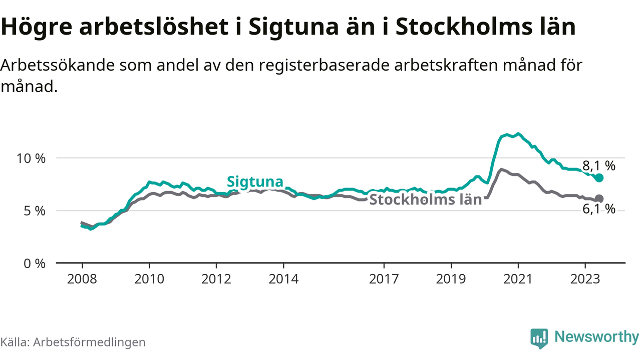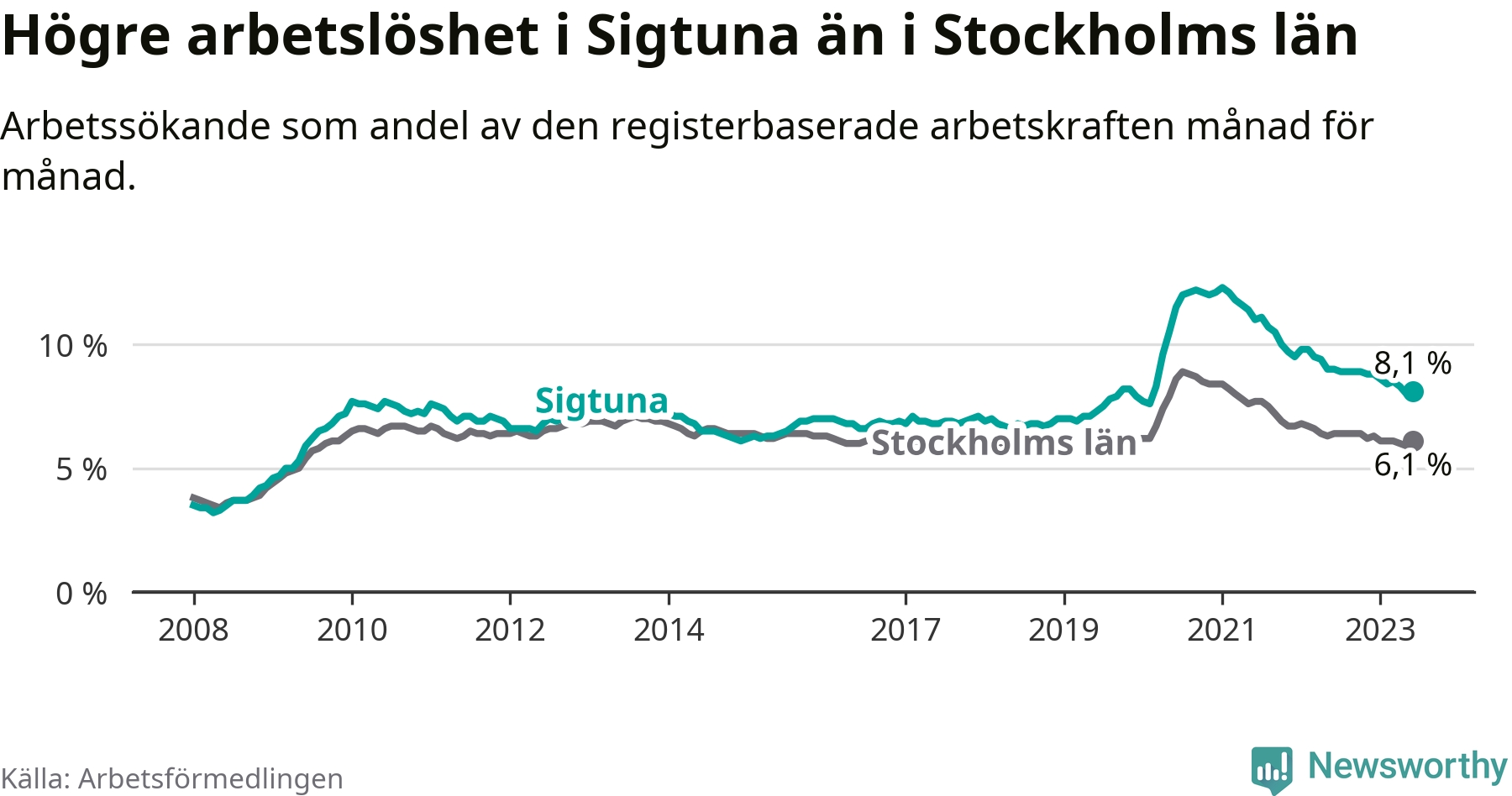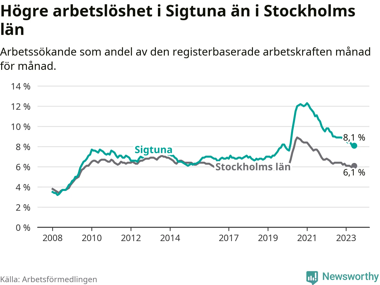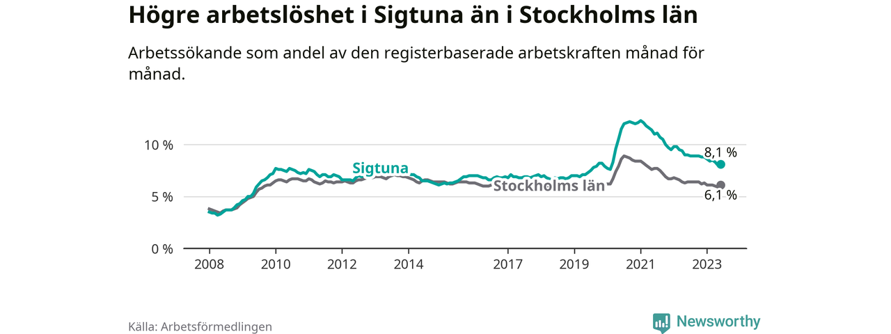Även om arbetslösheten i Sigtuna alltså minskar, så ligger den fortfarande över snittet i hela Stockholms län (8,1 procent i kommunen, jämfört med 6,1 procent i hela länet). Vaxholm har den lägsta arbetslösheten i länet (3,1 procent), medan Botkyrka har den högsta (10,3 procent). För att Sigtuna skulle komma ner i samma arbetslöshetsnivå som Vaxholm skulle 1 295 personer behöva sysselsättas.