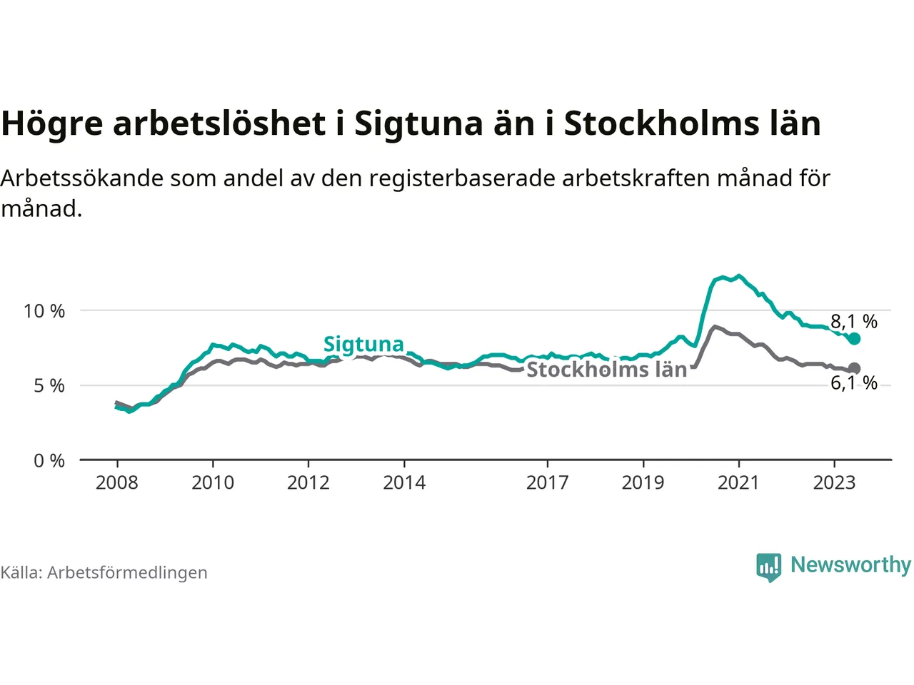 Under juni månad rapporterade Sigtuna kommun en total arbetslöshet på 8,1 procent. Det är en minskning jämfört med samma tidpunkt i fjol (−0,9 procentenheter). Även i Stockholms län sjunker arbetslösheten .