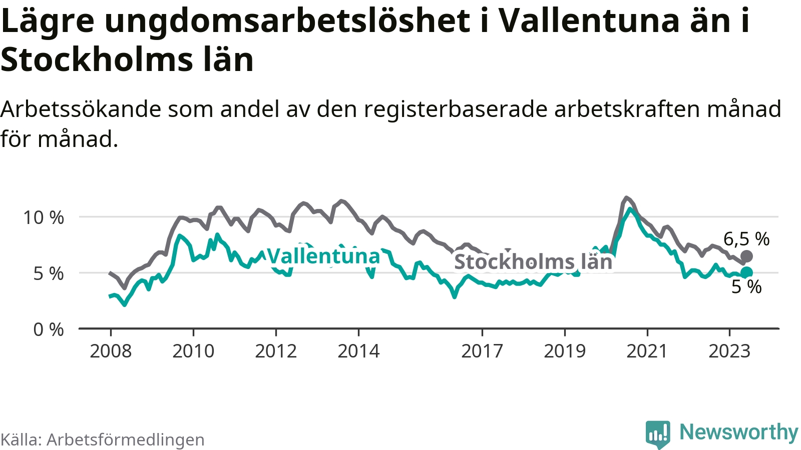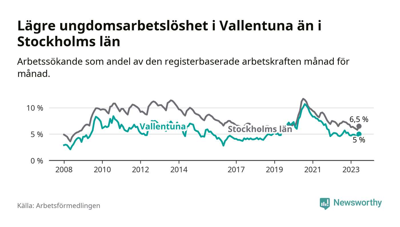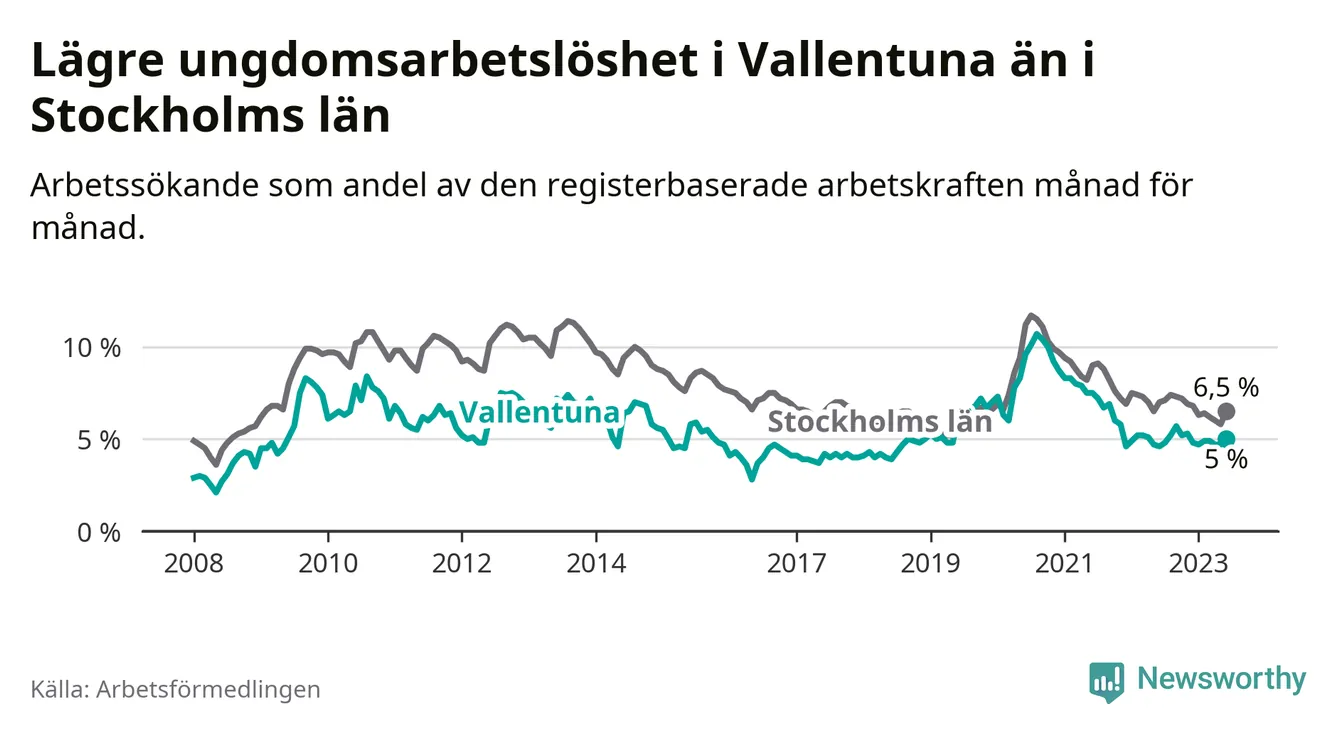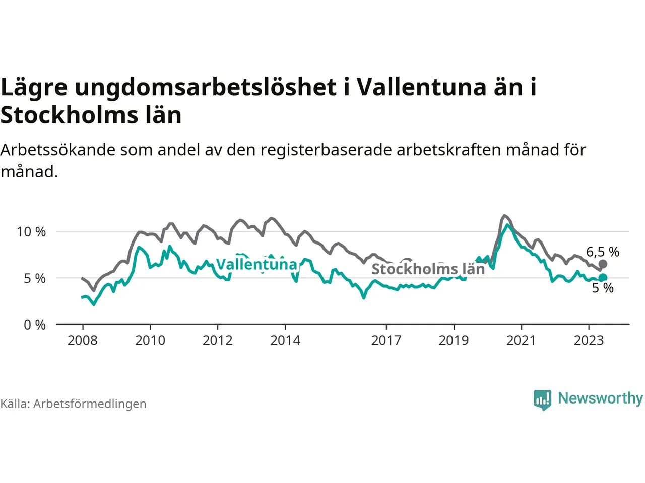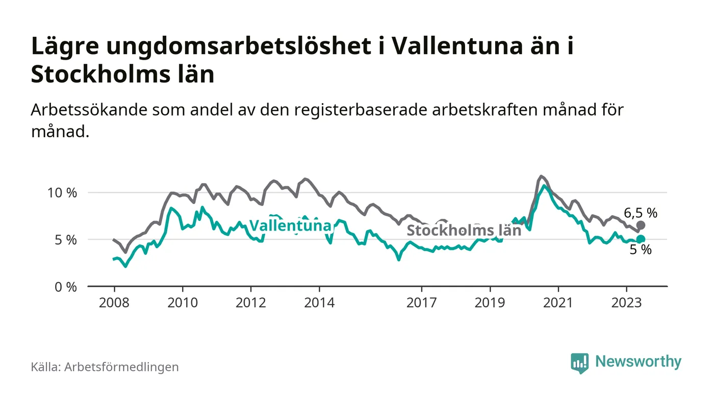 Precis som den totala arbetslösheten ligger ungdomsarbetslösheten i Vallentuna lägre än i Stockholms län som helhet. Skillnaden mellan kommunen och länet är 1,5 procentenheter.