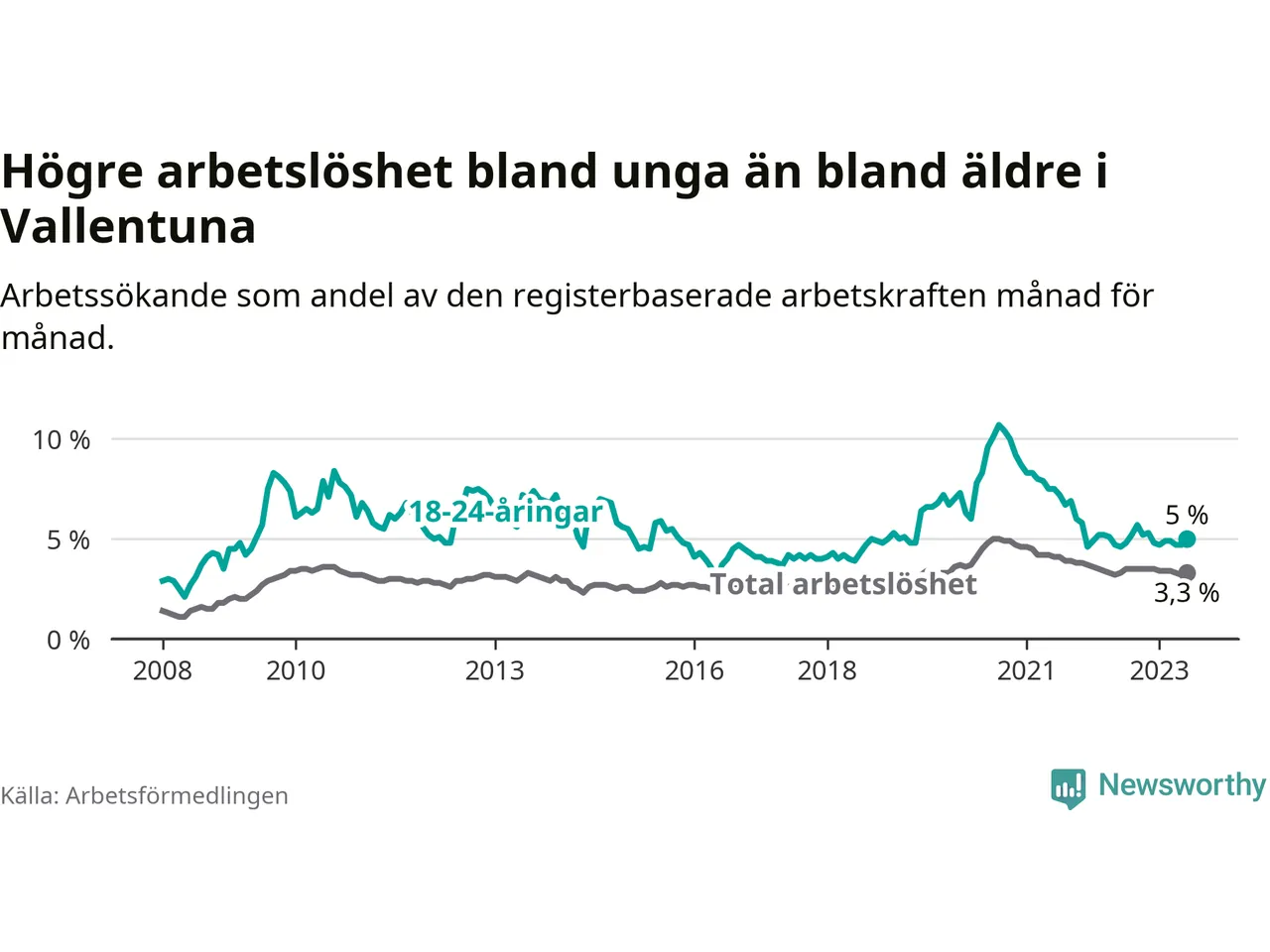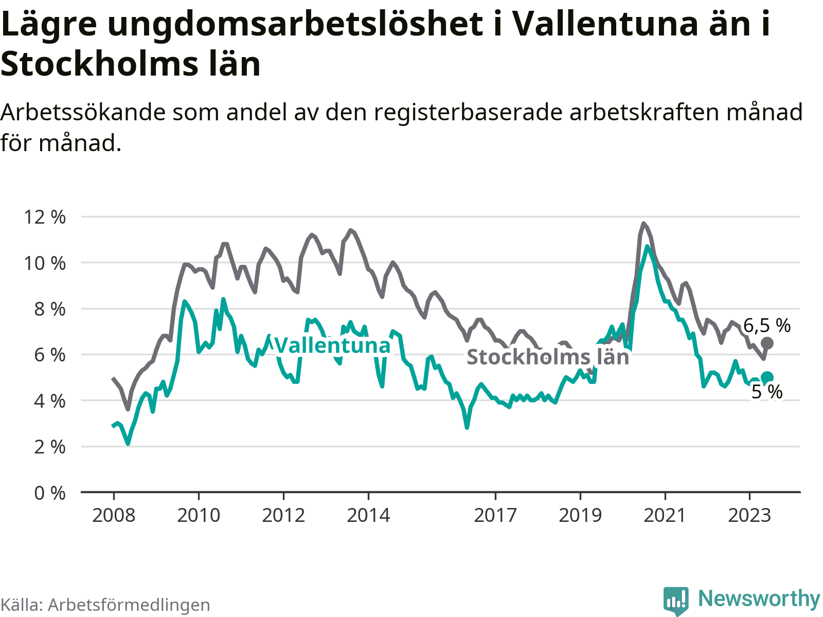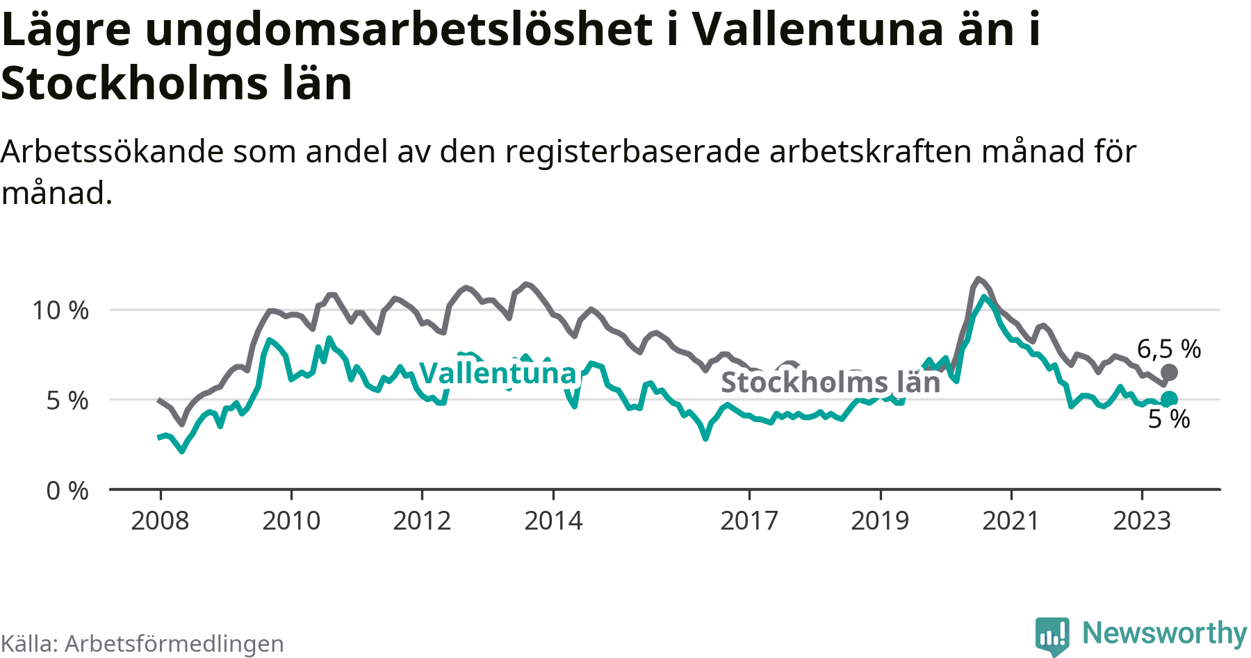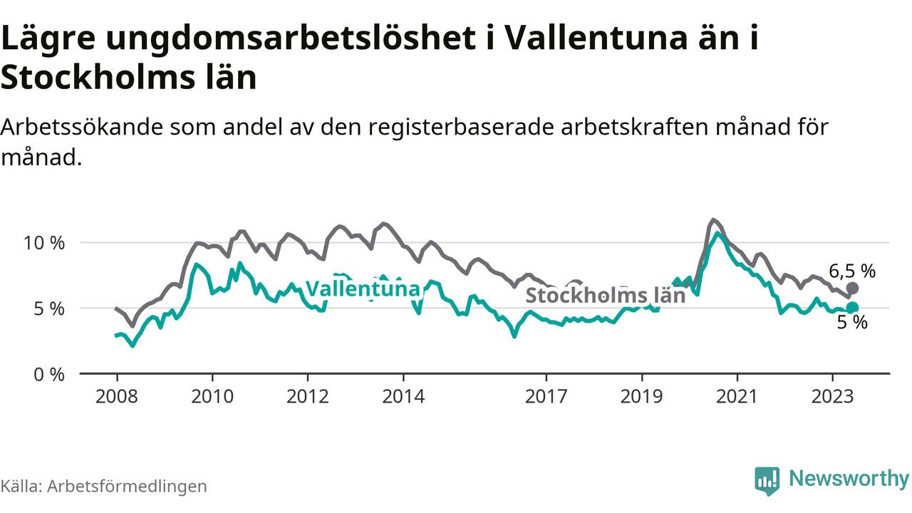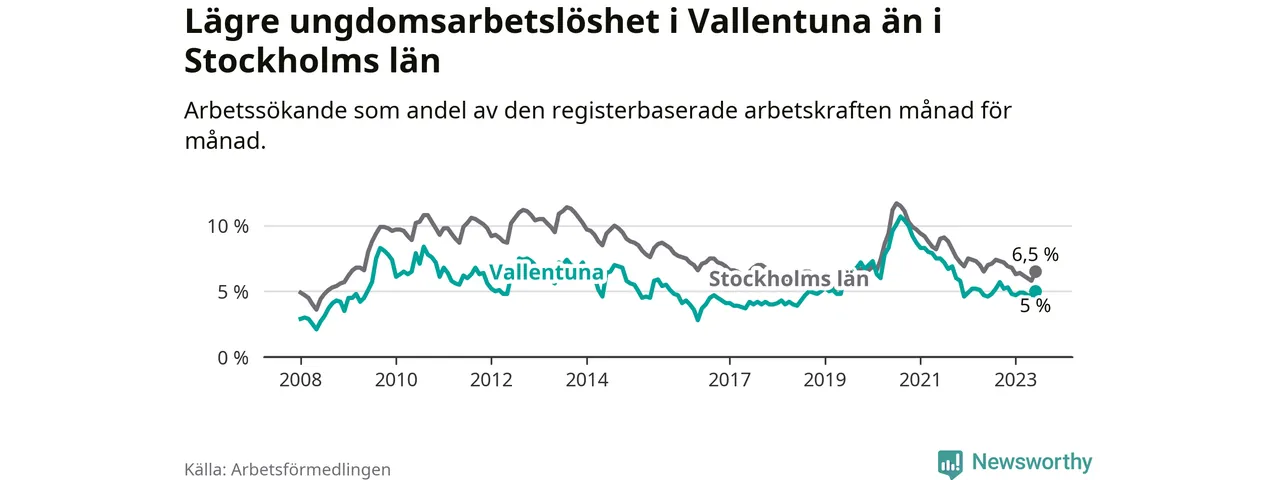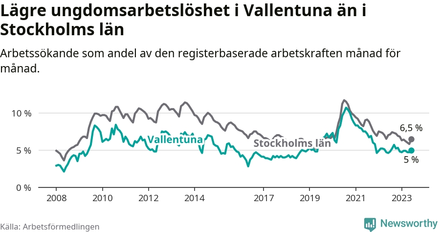 Precis som den totala arbetslösheten ligger ungdomsarbetslösheten i Vallentuna lägre än i Stockholms län som helhet. Skillnaden mellan kommunen och länet är 1,5 procentenheter.