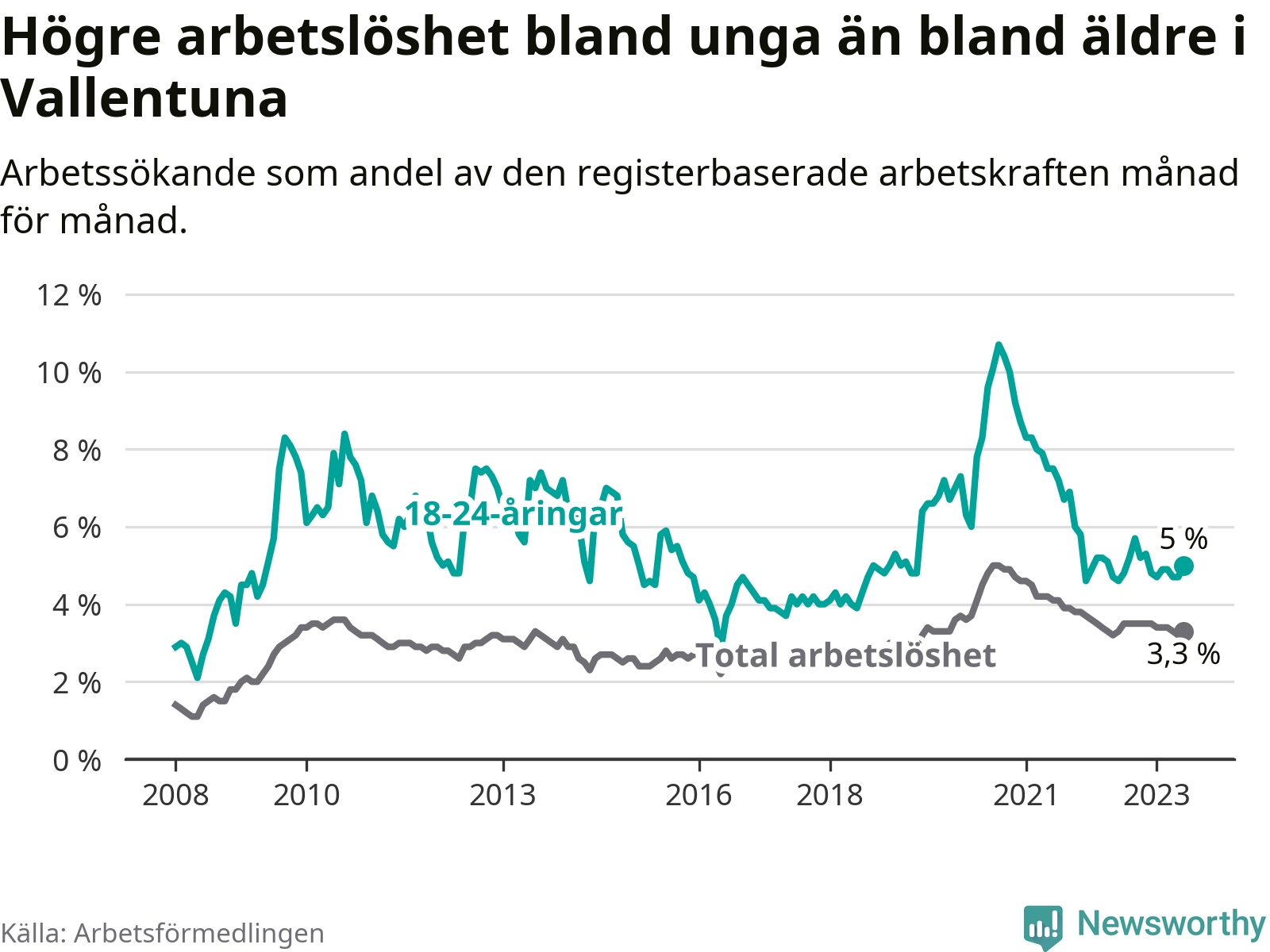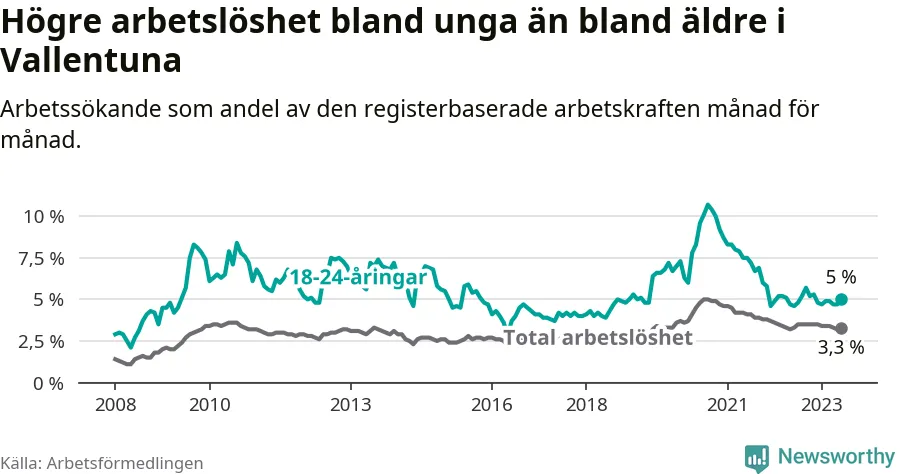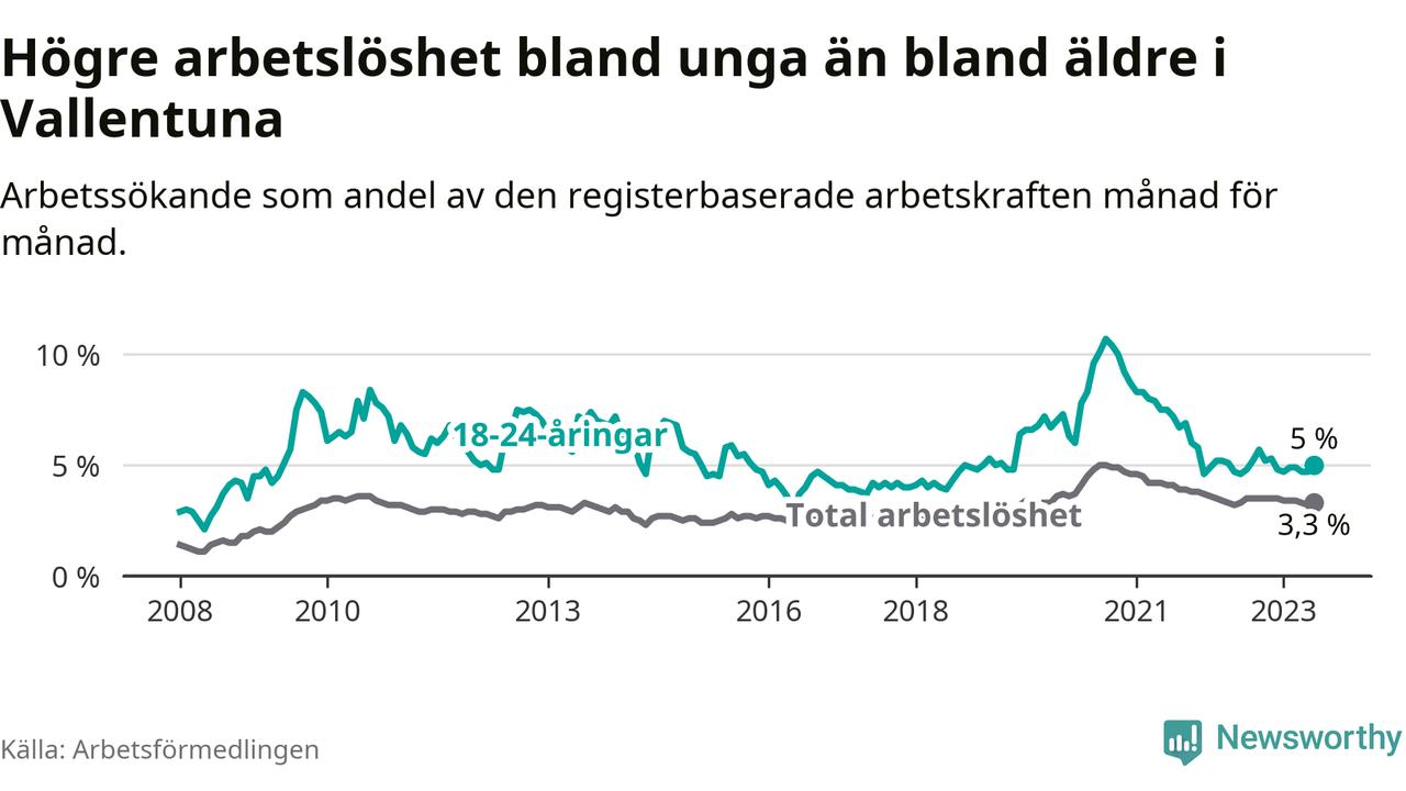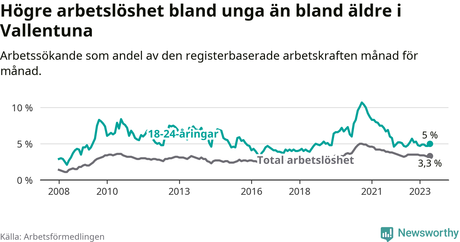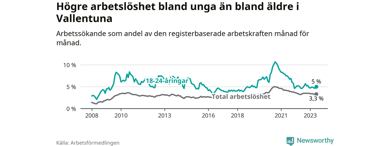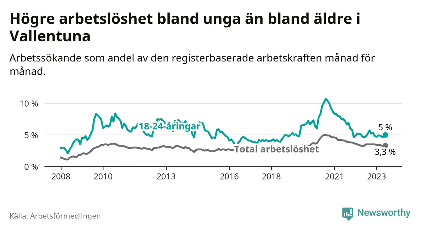 Precis som den totala arbetslösheten ligger ungdomsarbetslösheten i Vallentuna lägre än i Stockholms län som helhet. Skillnaden mellan kommunen och länet är 1,5 procentenheter.