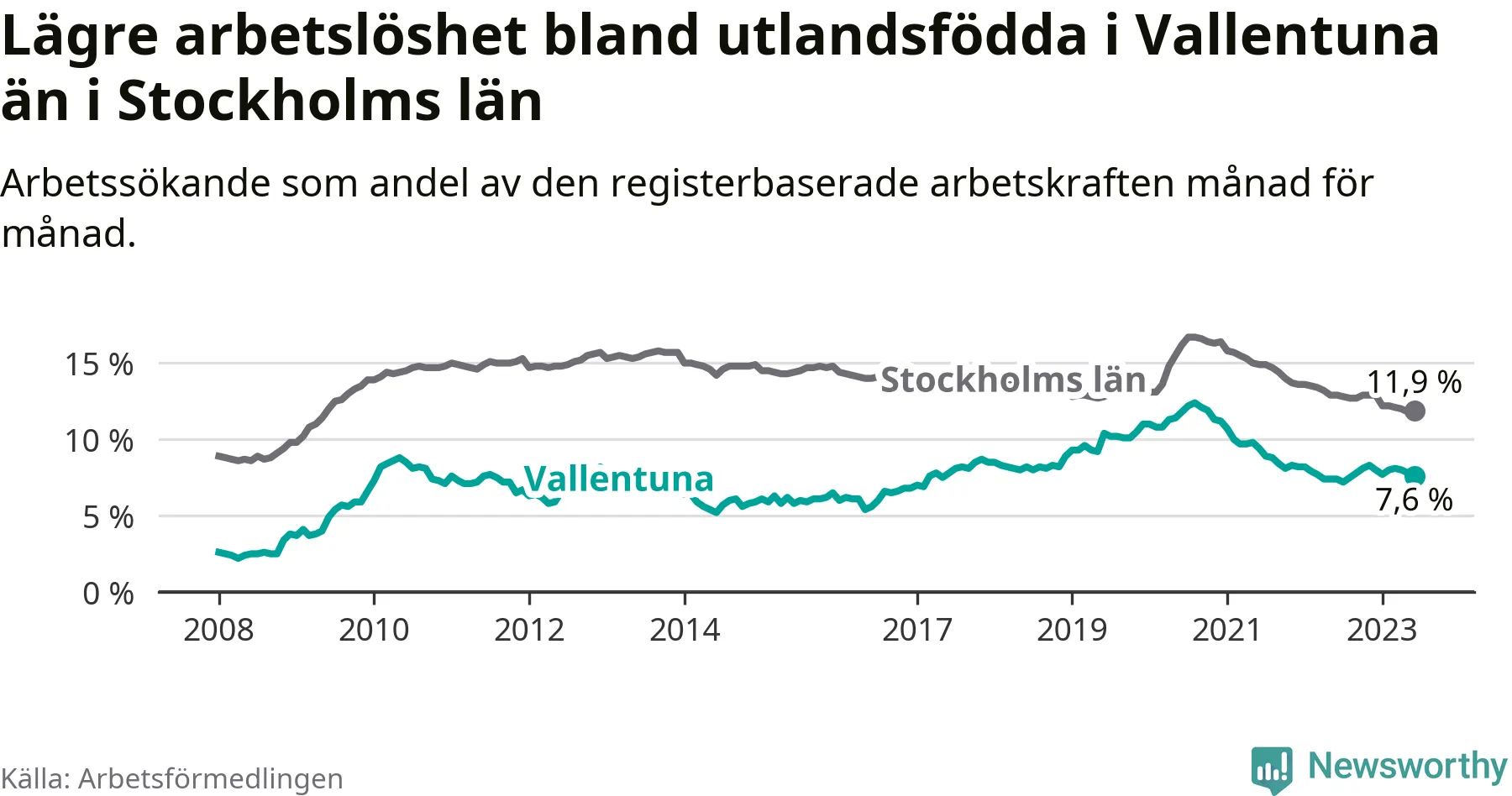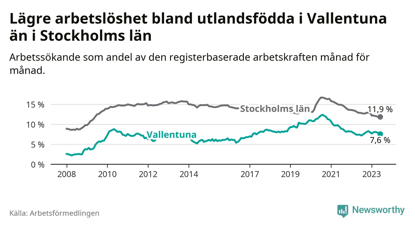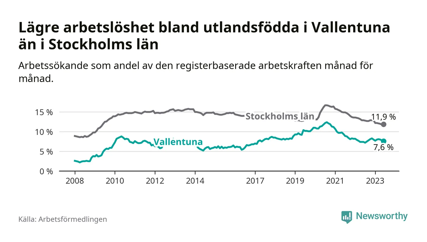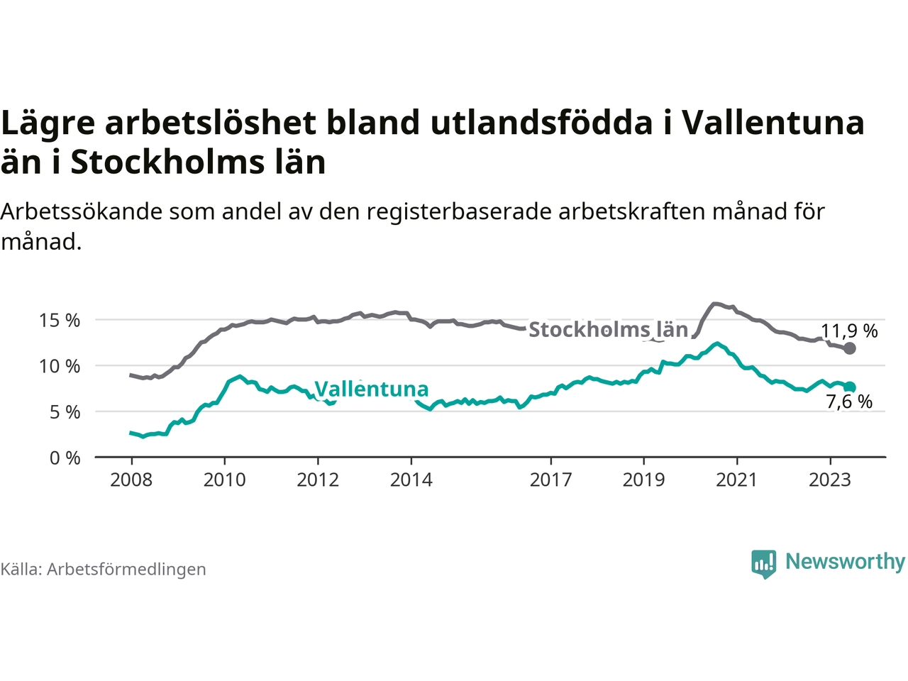 Medan arbetslösheten bland utlandsfödda alltså ökar i Vallentuna så minskar den i Stockholms län. Jämfört med juni förra året har andelen arbetslösa utlandsfödda i länet minskat med 1,0 procentenheter (till 11,9 procent). Trots den senaste uppgången har Vallentuna med andra ord fortfarande lägre arbetslöshet bland utlandsfödda än Stockholms län.