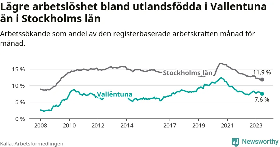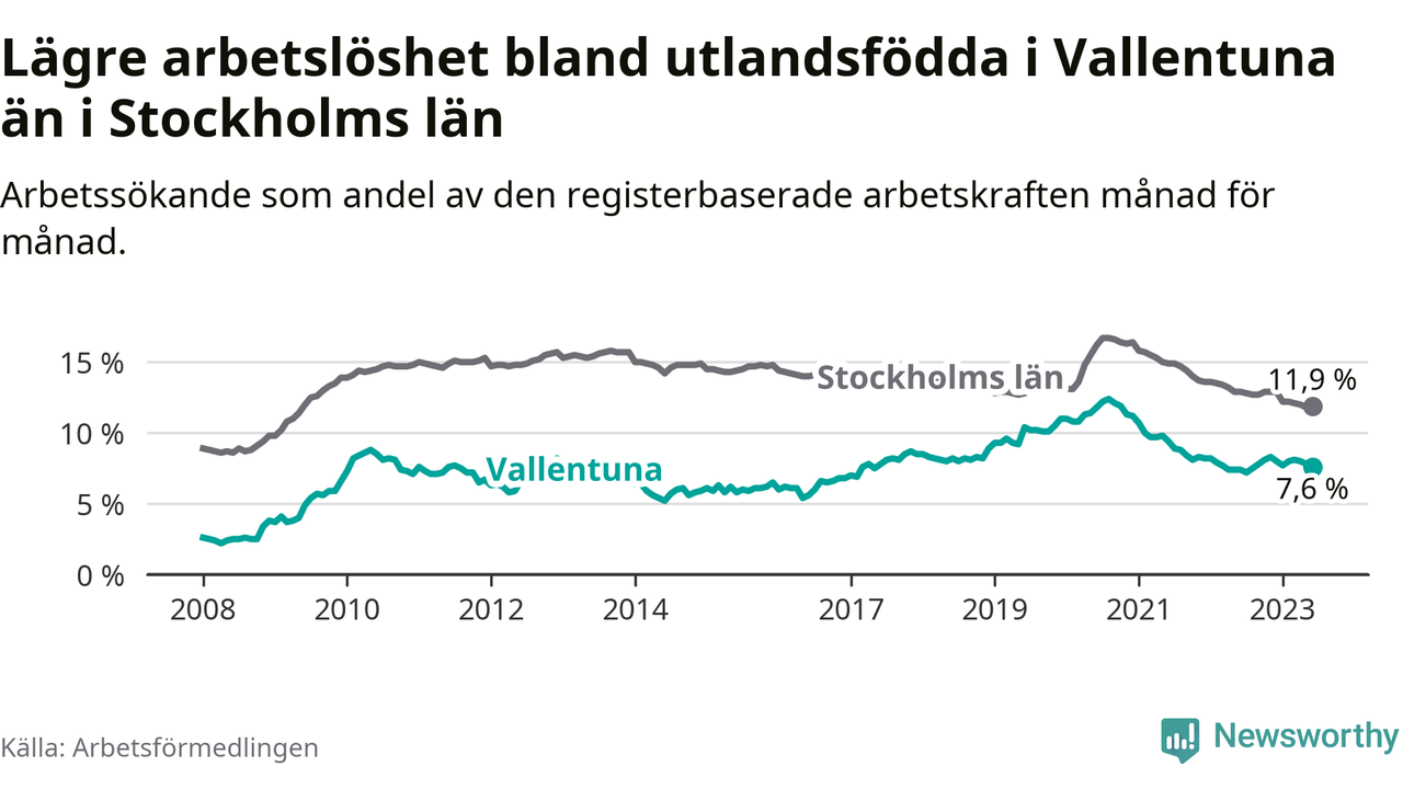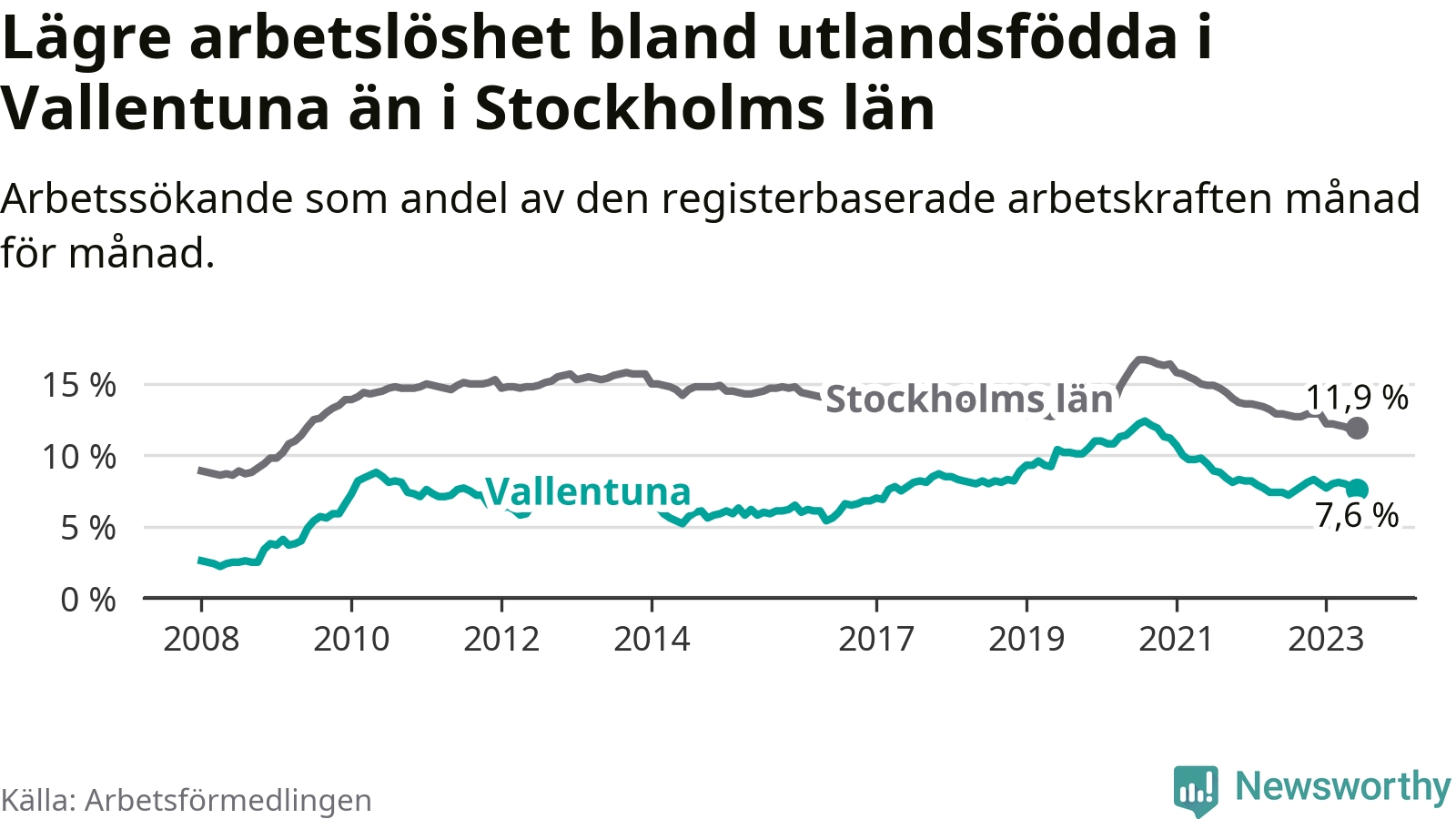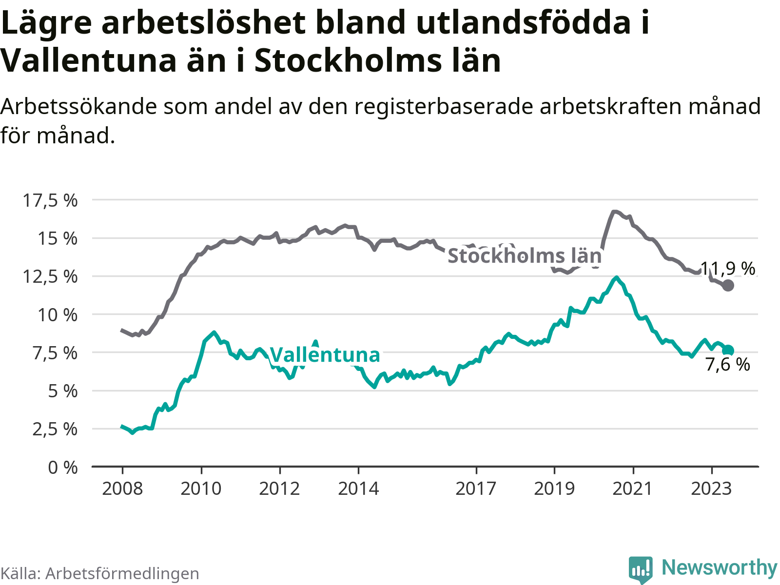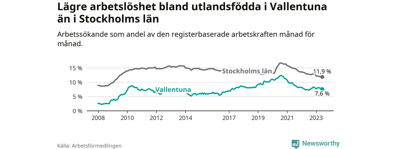 Medan arbetslösheten bland utlandsfödda alltså ökar i Vallentuna så minskar den i Stockholms län. Jämfört med juni förra året har andelen arbetslösa utlandsfödda i länet minskat med 1,0 procentenheter (till 11,9 procent). Trots den senaste uppgången har Vallentuna med andra ord fortfarande lägre arbetslöshet bland utlandsfödda än Stockholms län.