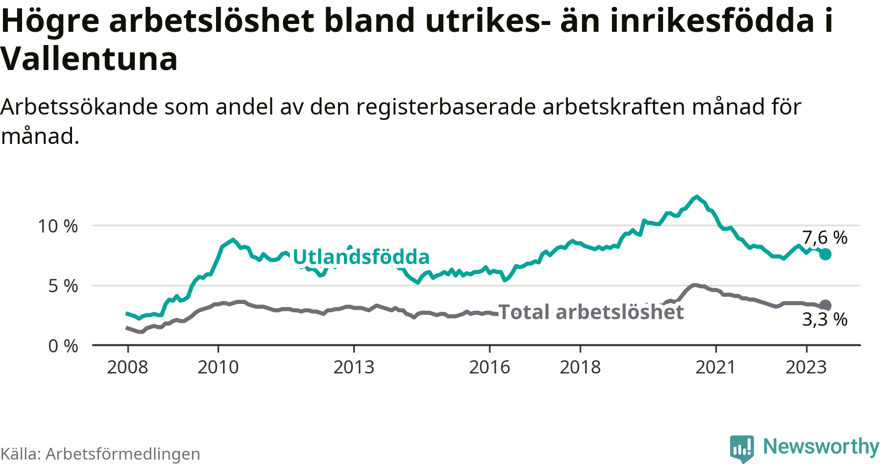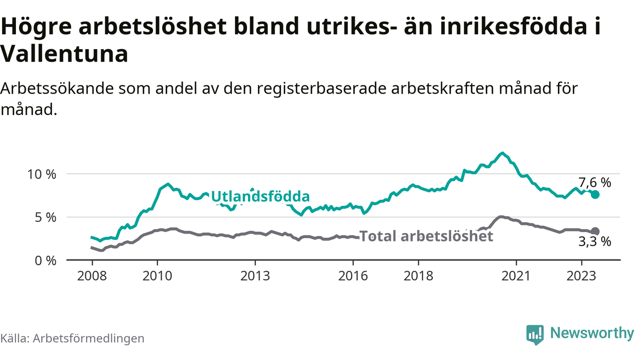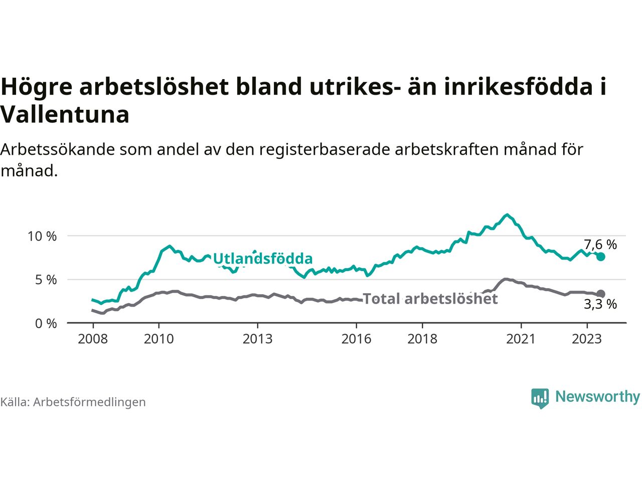 Arbetslösheten bland utlandsfödda var 7,6 procent i Vallentuna under juni månad, motsvarande 254 av 3 342 personer. Det är 0,2 procentenheter fler än vid samma tidpunkt i fjol (+23 om man räknar personer).