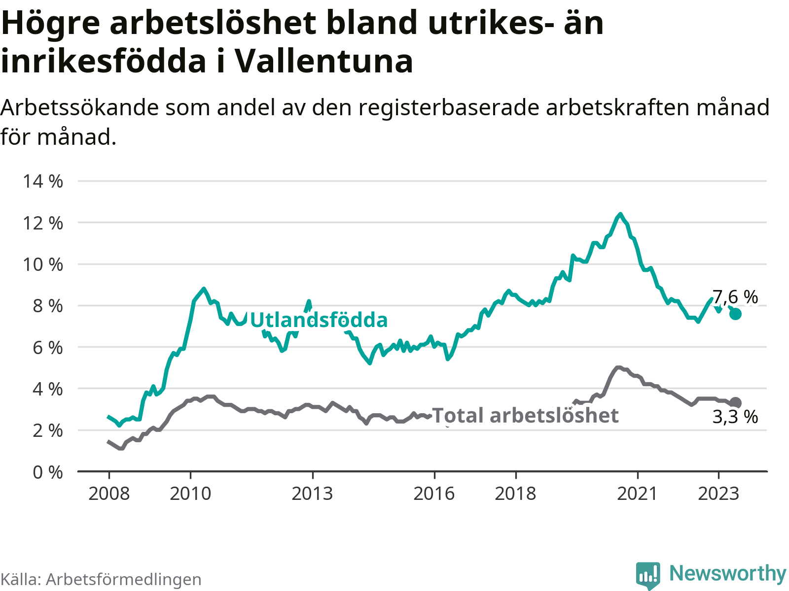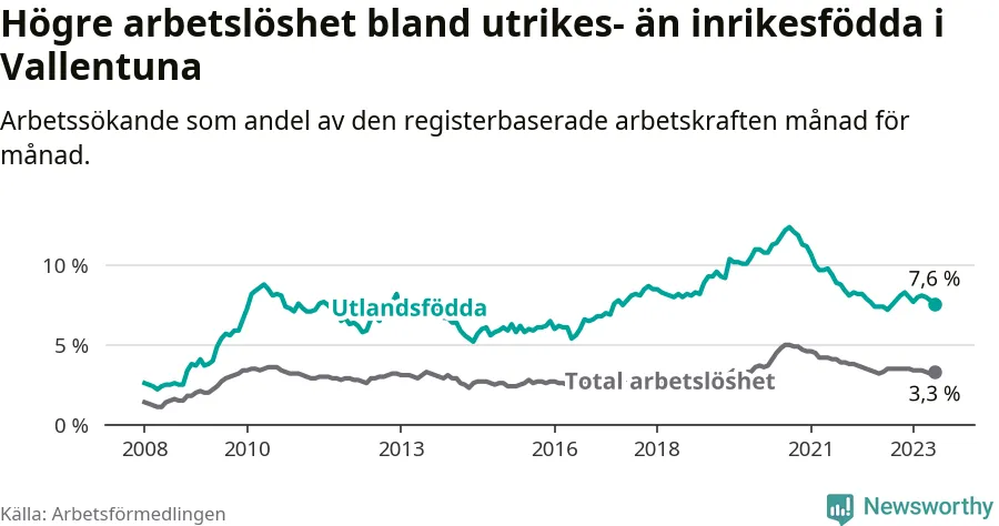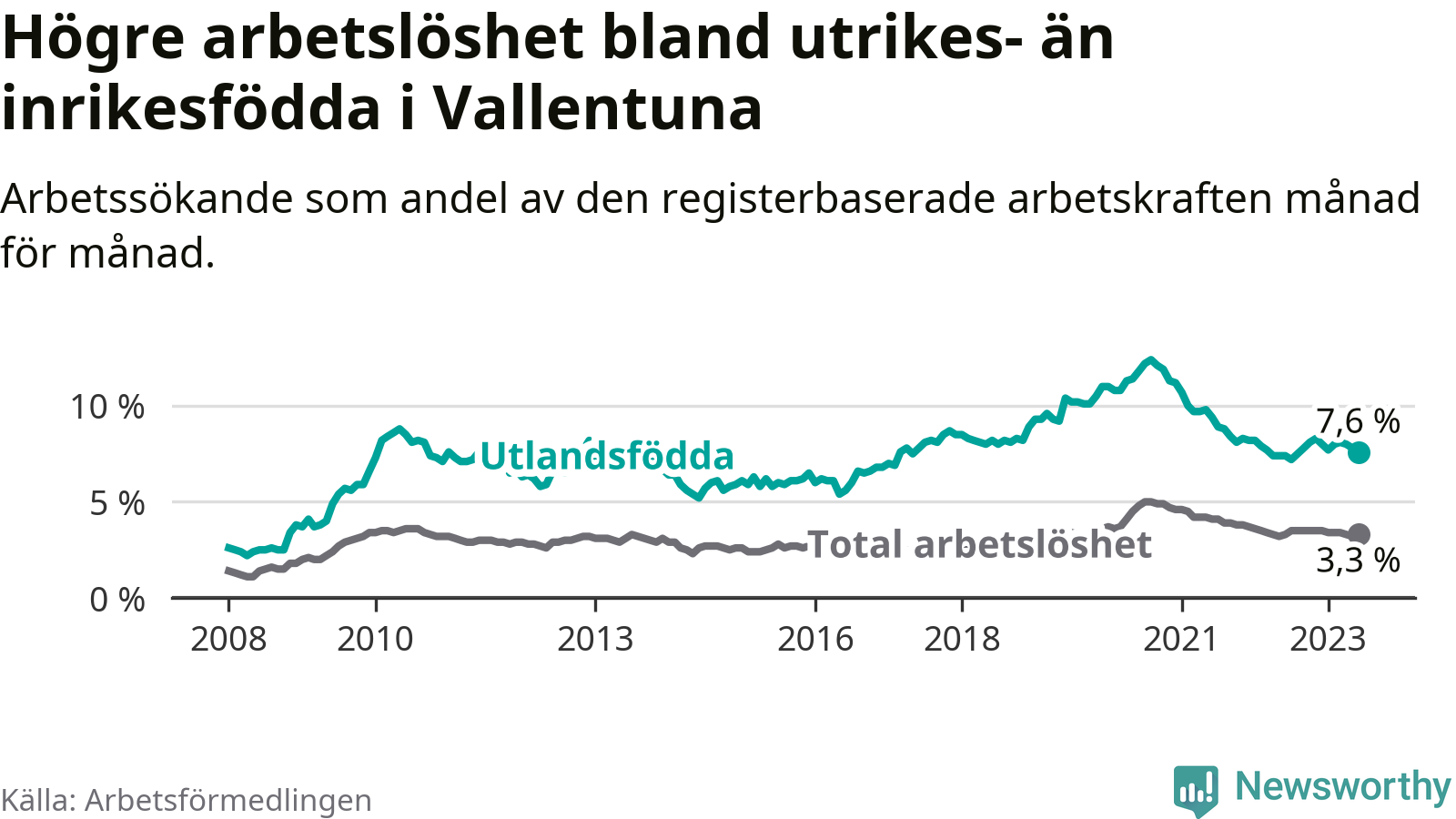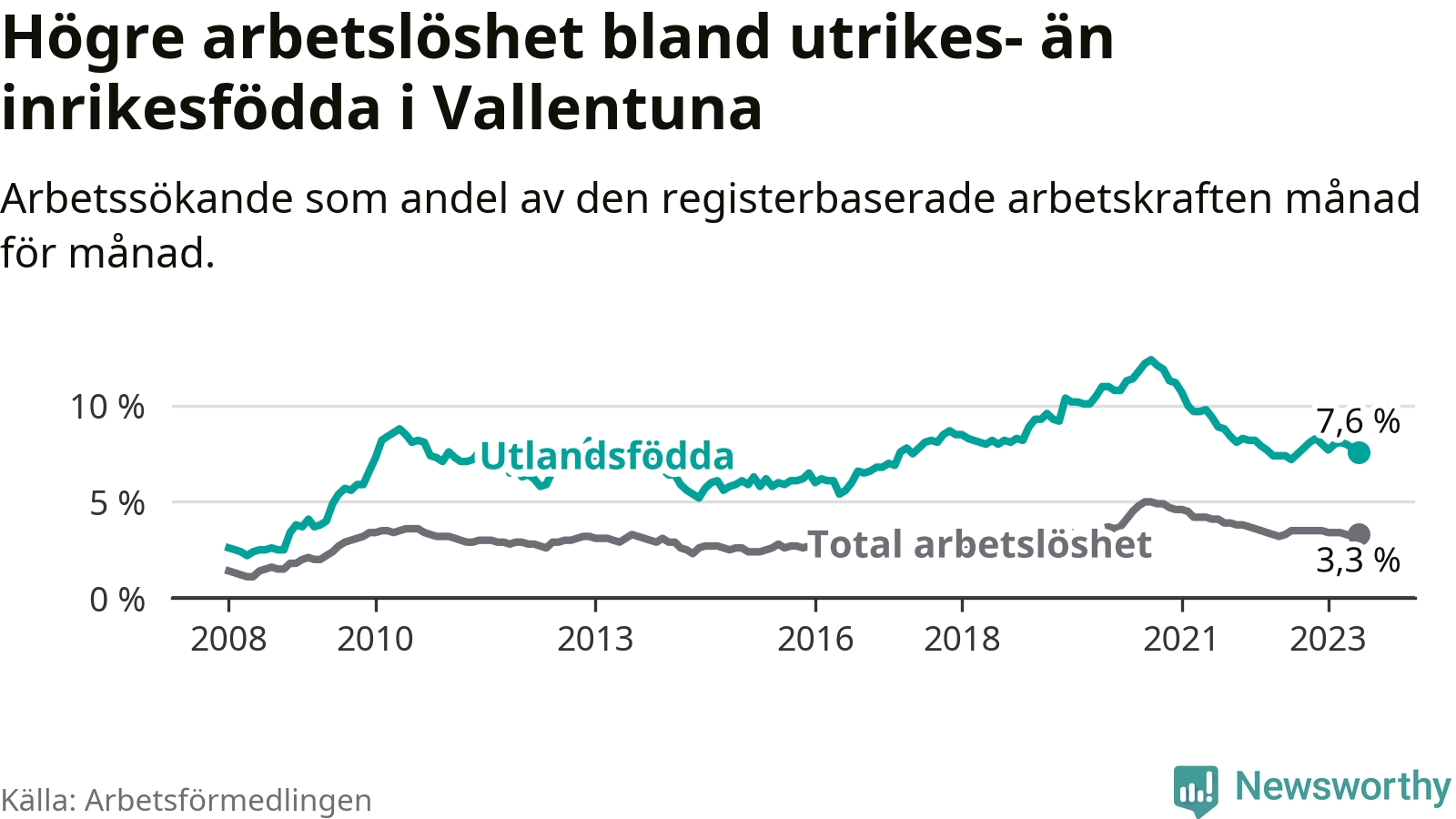 Arbetslösheten bland utlandsfödda var 7,6 procent i Vallentuna under juni månad, motsvarande 254 av 3 342 personer. Det är 0,2 procentenheter fler än vid samma tidpunkt i fjol (+23 om man räknar personer).