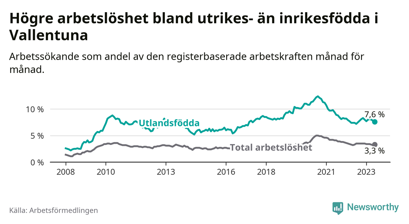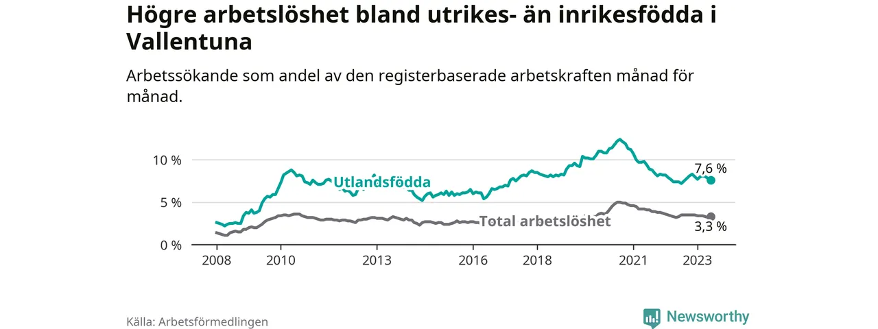 Skillnaden i arbetslöshet mellan utrikesfödda och hela befolkningen är 4,3 procentenheter i Vallentuna.