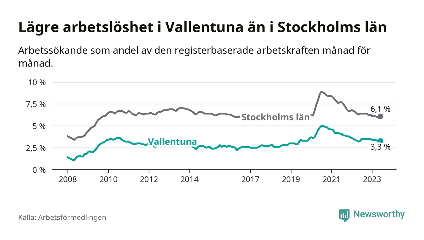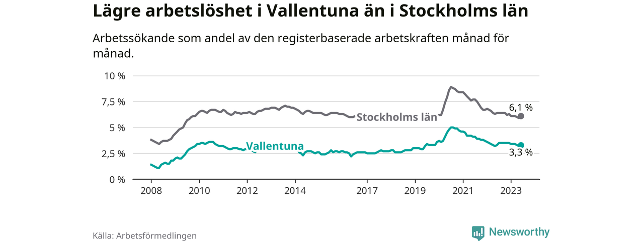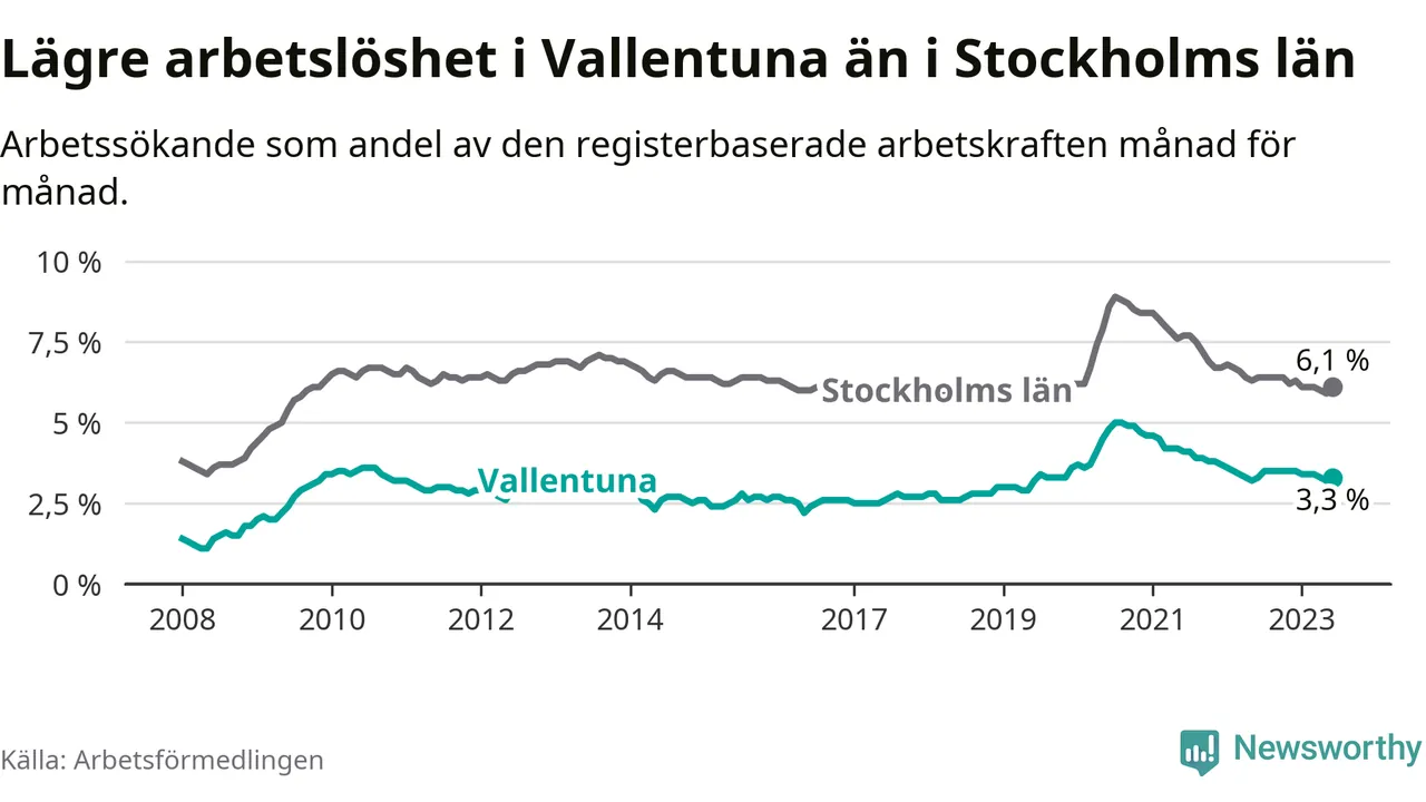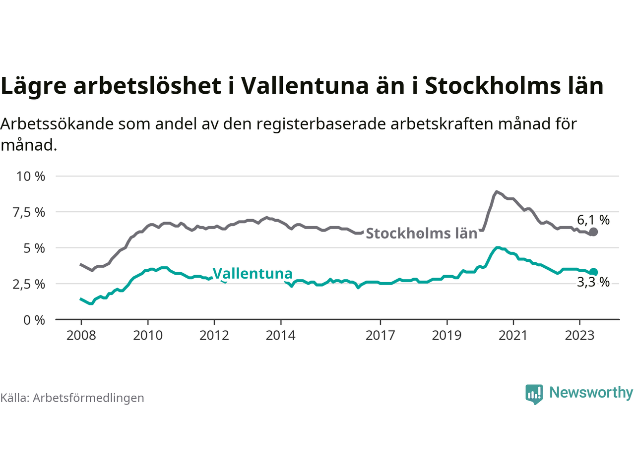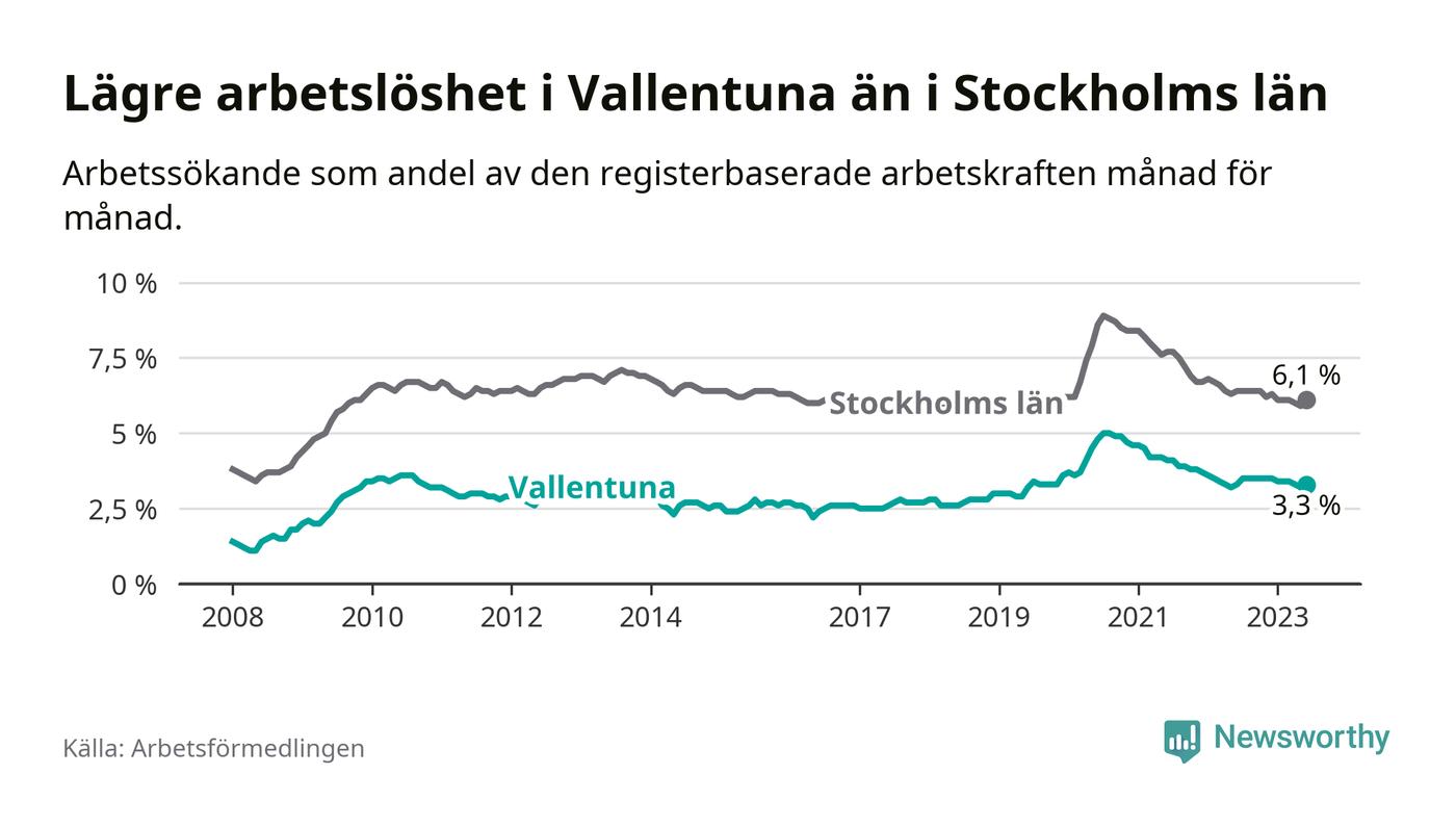 Vallentuna går därmed mot strömmen i förhållande till andra kommuner i Stockholms län. I de flesta andra kommuner i länet går arbetslösheten nedåt. Störst är minskningen i Södertälje, där arbetslösheten sjunker med 1,2 procentenheter. I tabellen längre ner ser du utvecklingen i samtliga kommuner i länet.