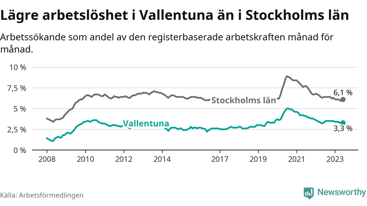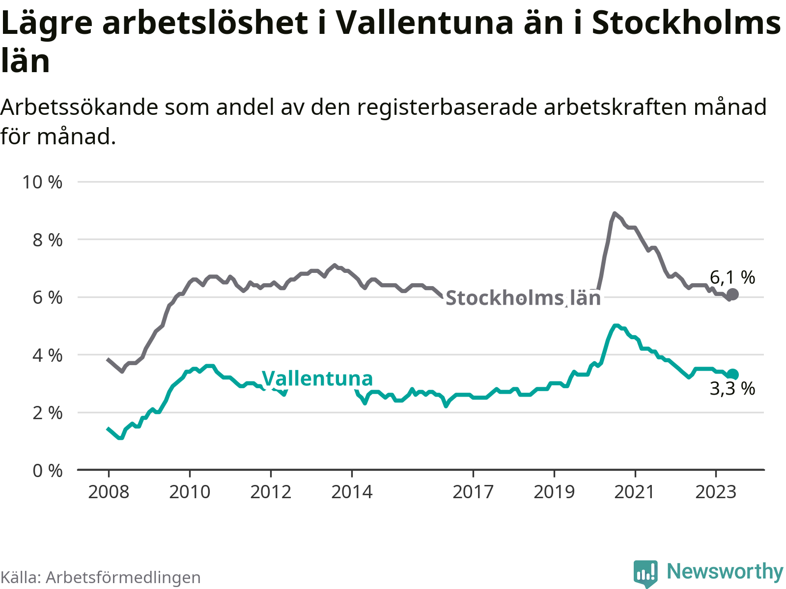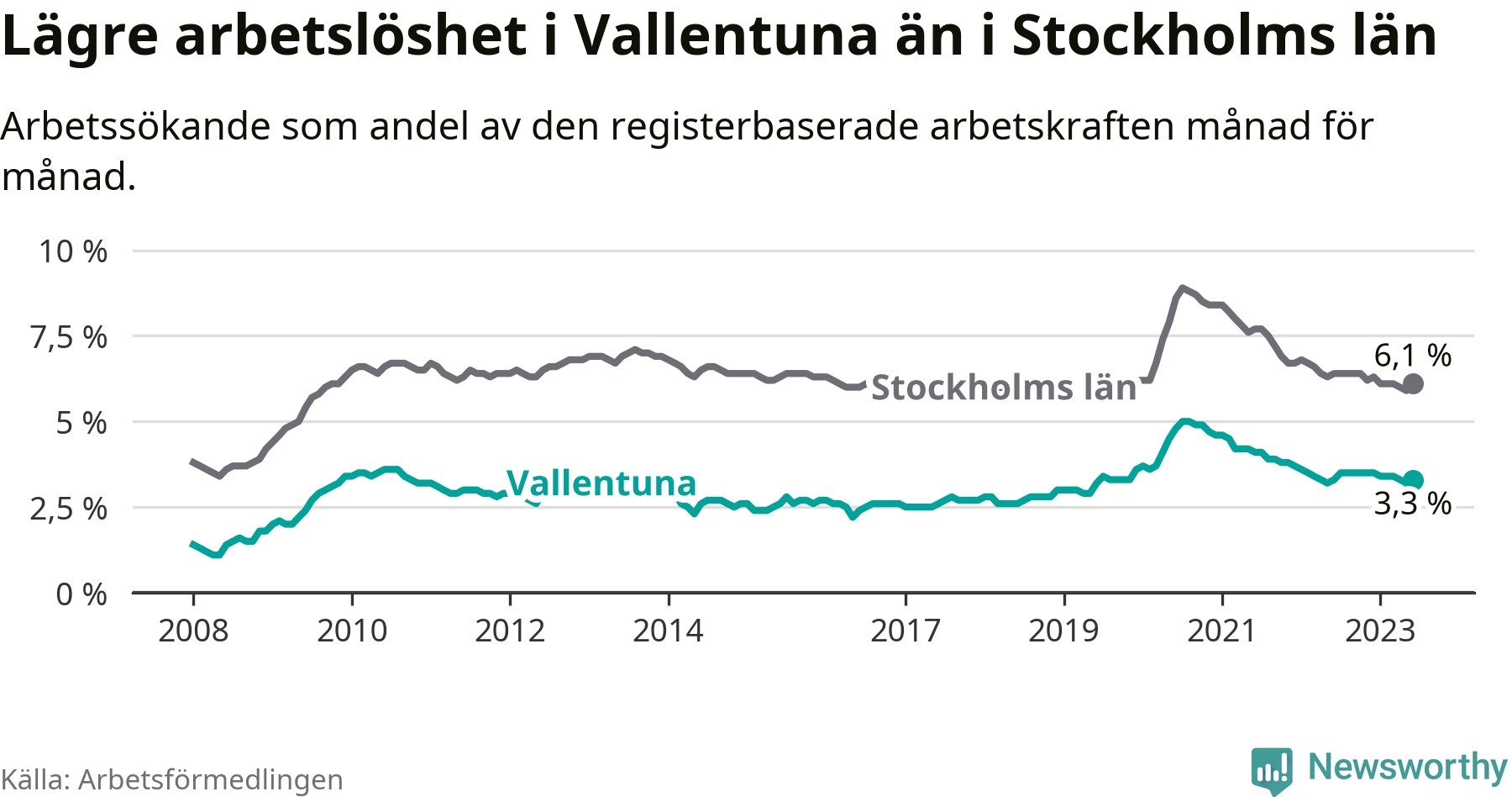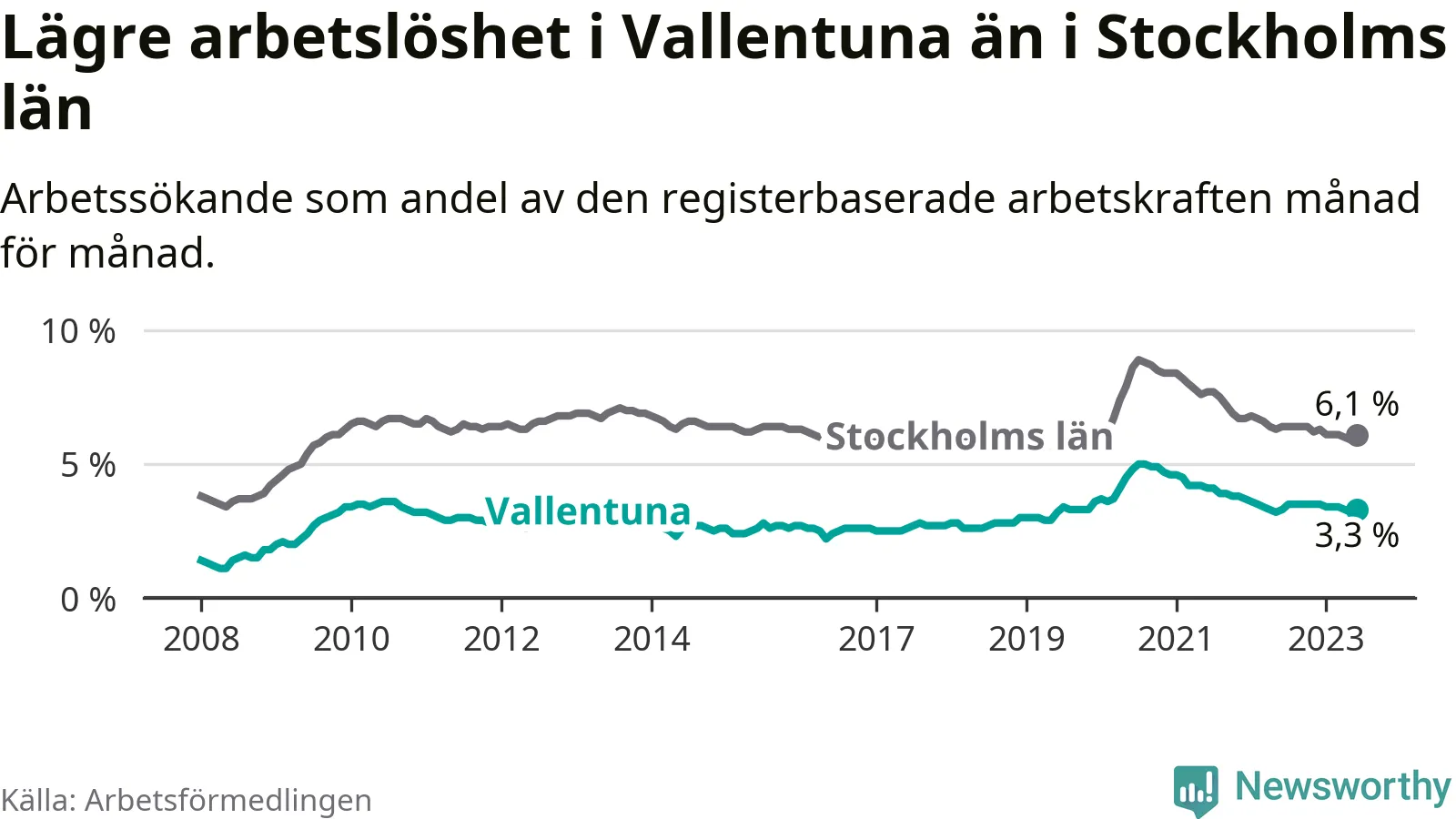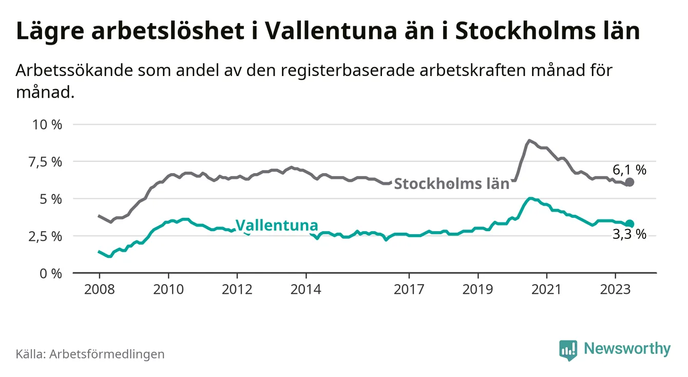 Vallentuna går därmed mot strömmen i förhållande till andra kommuner i Stockholms län. I de flesta andra kommuner i länet går arbetslösheten nedåt. Störst är minskningen i Södertälje, där arbetslösheten sjunker med 1,2 procentenheter. I tabellen längre ner ser du utvecklingen i samtliga kommuner i länet.