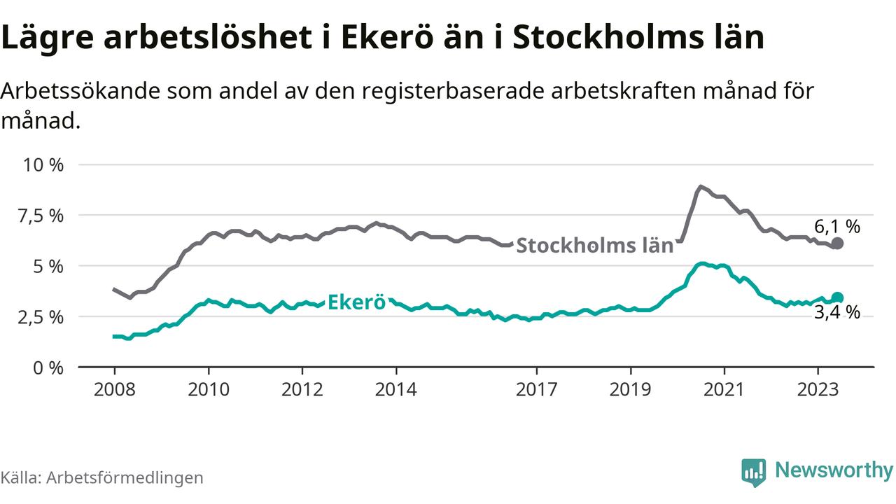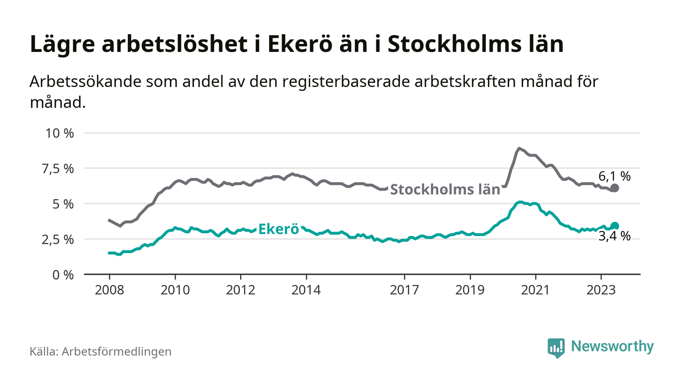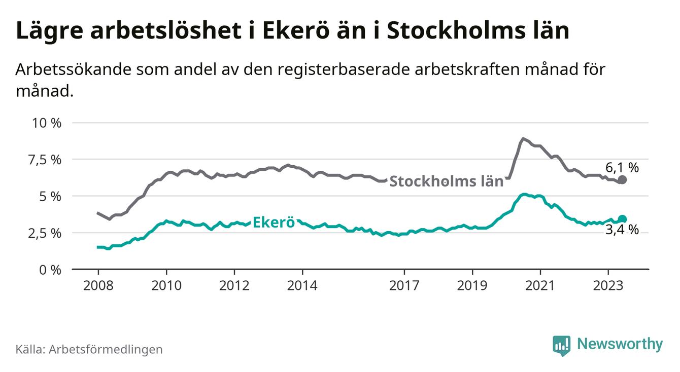 Även om arbetslösheten i Ekerö alltså ökar, så ligger den fortfarande under snittet i hela Stockholms län (3,4 procent i kommunen, jämfört med 6,1 procent i hela länet). Vaxholm har den lägsta arbetslösheten i länet (3,1 procent), medan Botkyrka har den högsta (10,3 procent). För att Ekerö skulle komma ner i samma arbetslöshetsnivå som Vaxholm skulle 42 personer behöva sysselsättas.
