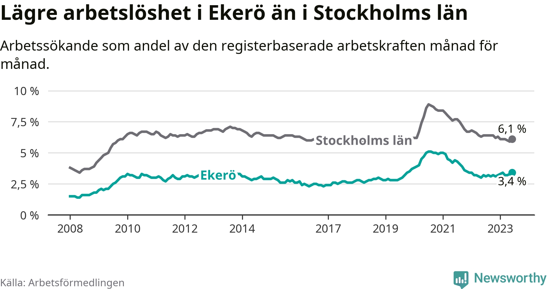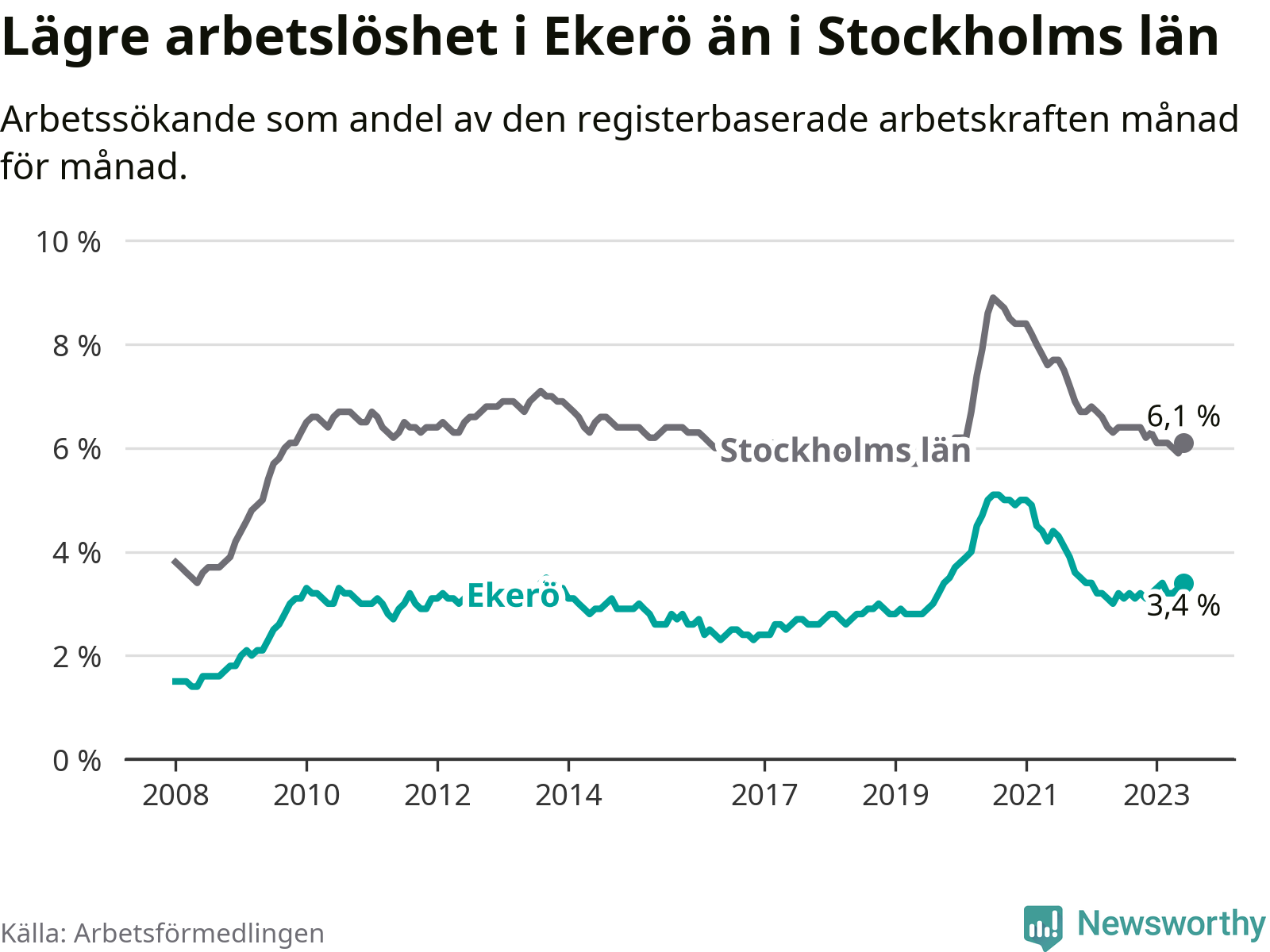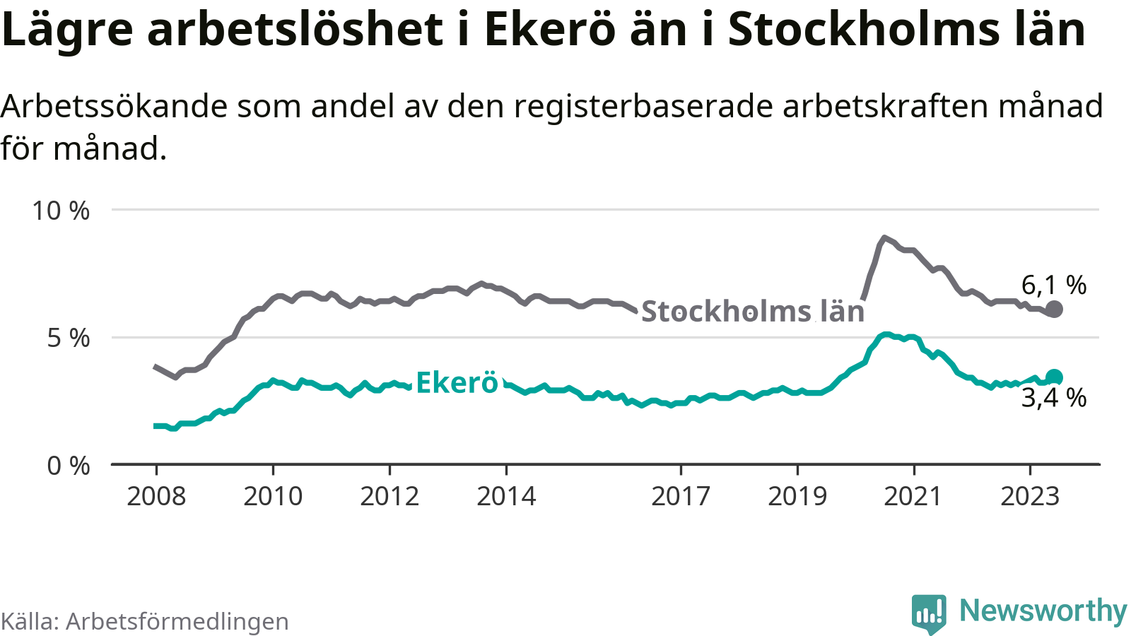 Även om arbetslösheten i Ekerö alltså ökar, så ligger den fortfarande under snittet i hela Stockholms län (3,4 procent i kommunen, jämfört med 6,1 procent i hela länet). Vaxholm har den lägsta arbetslösheten i länet (3,1 procent), medan Botkyrka har den högsta (10,3 procent). För att Ekerö skulle komma ner i samma arbetslöshetsnivå som Vaxholm skulle 42 personer behöva sysselsättas.