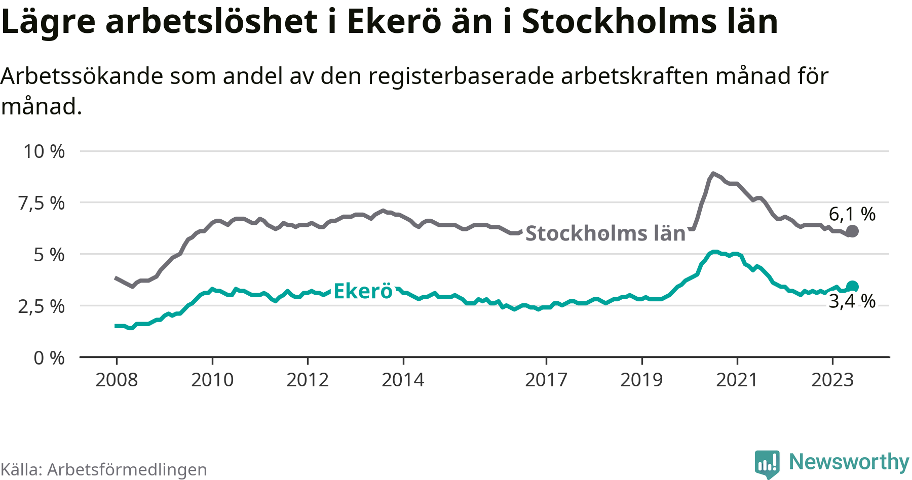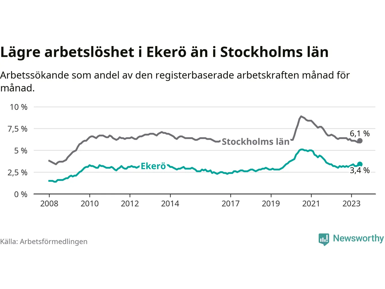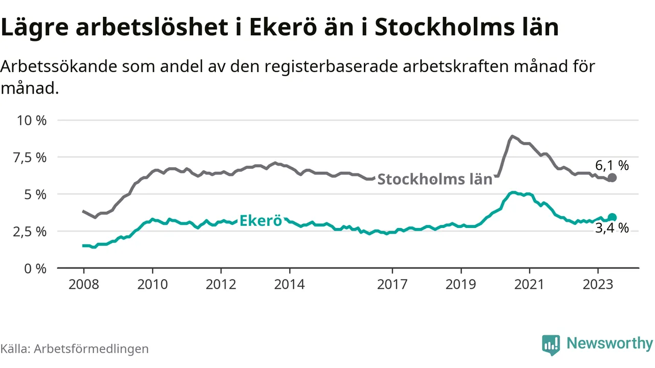 Ekerö går därmed mot strömmen i förhållande till andra kommuner i Stockholms län. I de flesta andra kommuner i länet går arbetslösheten nedåt. Störst är minskningen i Södertälje, där arbetslösheten sjunker med 1,2 procentenheter. I tabellen längre ner ser du utvecklingen i samtliga kommuner i länet.
