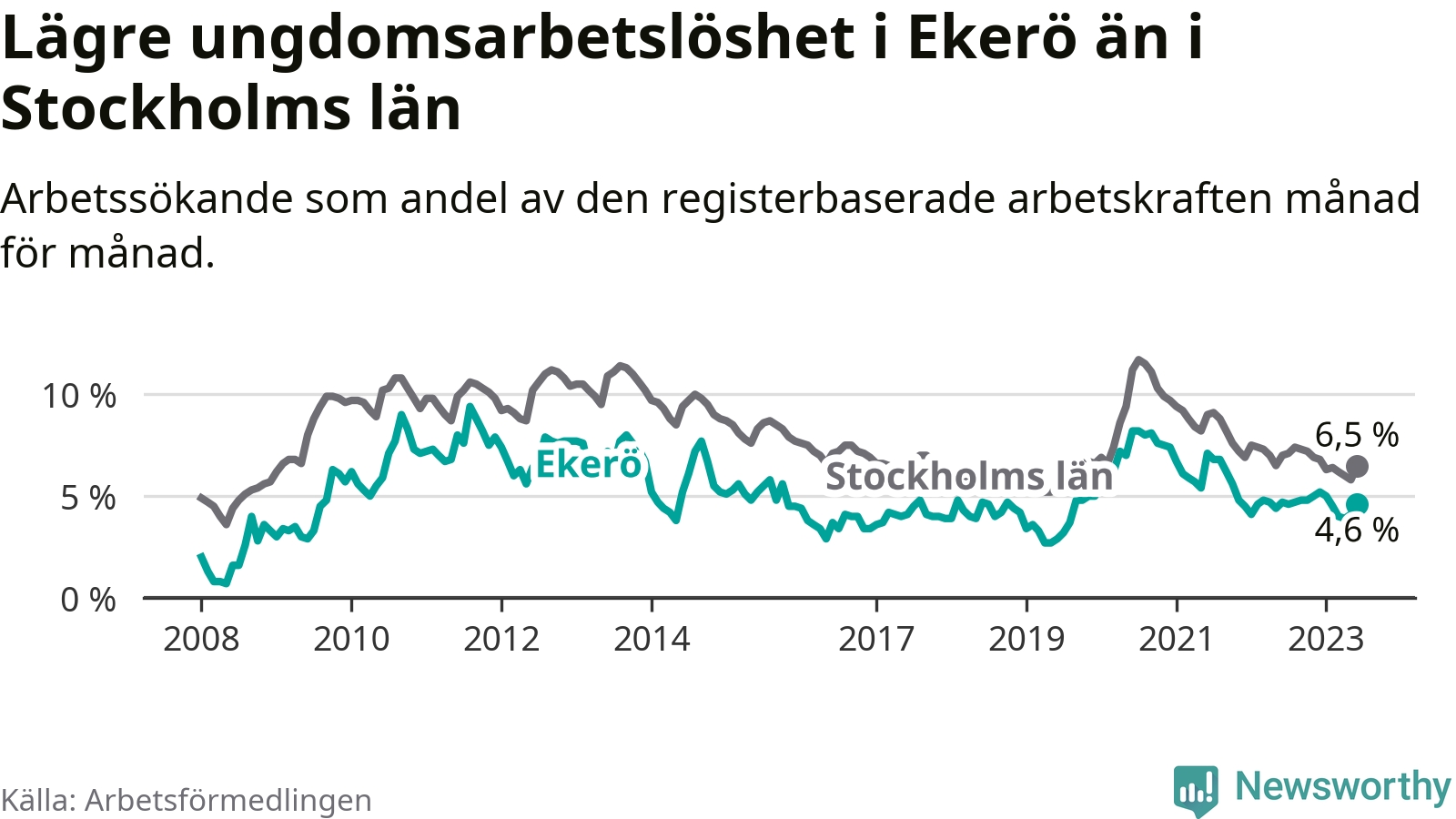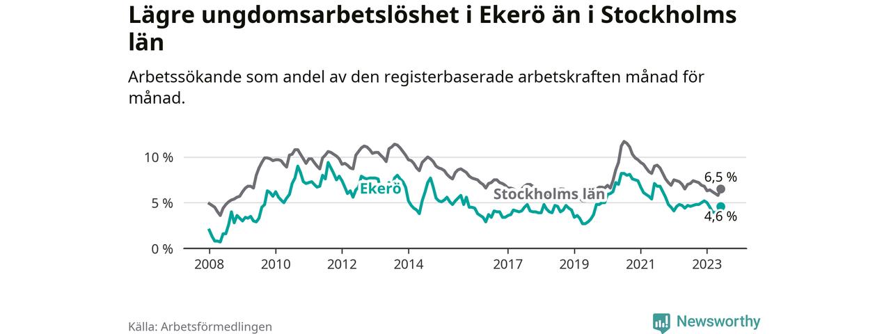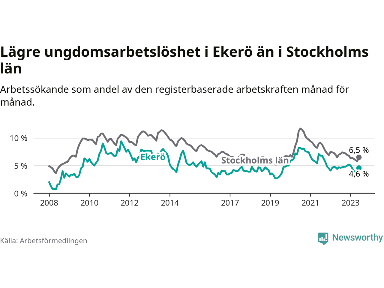 Precis som den totala arbetslösheten ligger ungdomsarbetslösheten i Ekerö lägre än i Stockholms län som helhet. Skillnaden mellan kommunen och länet är 1,9 procentenheter.