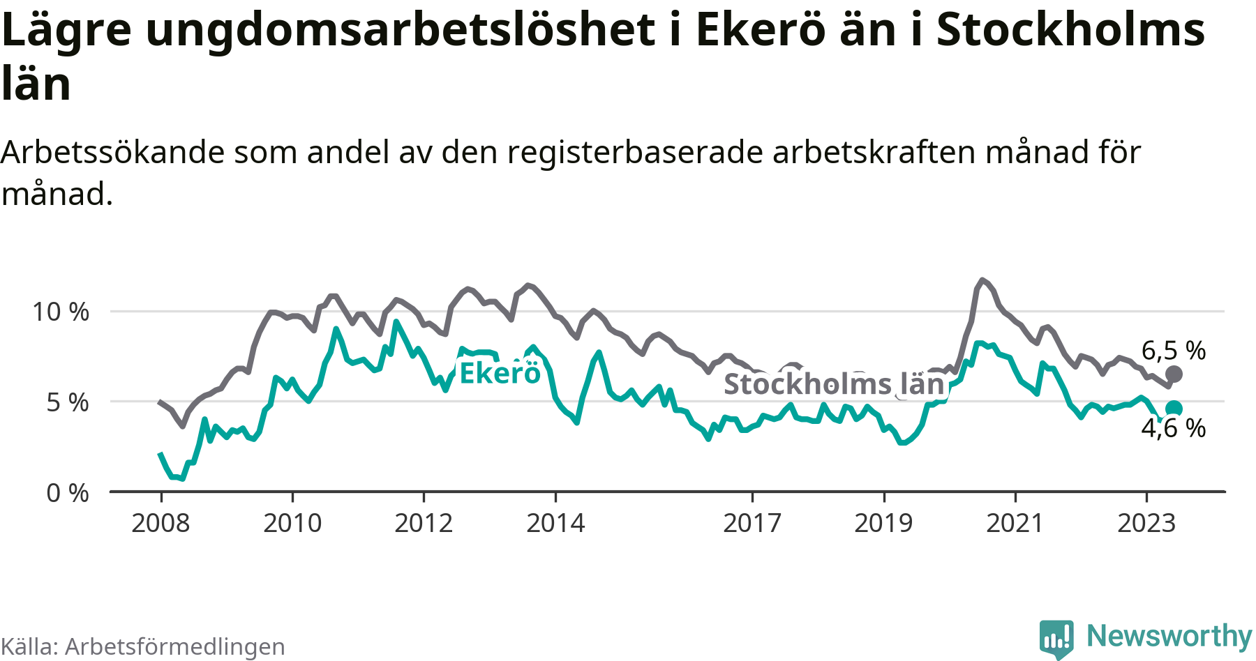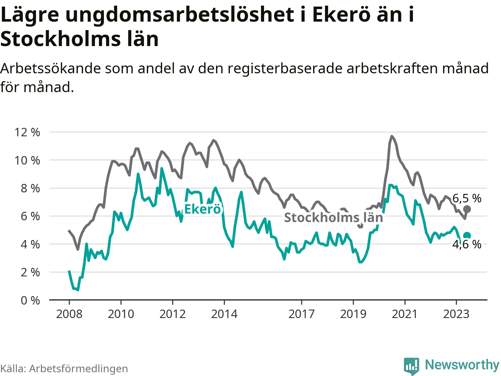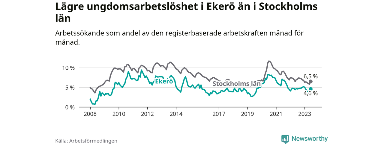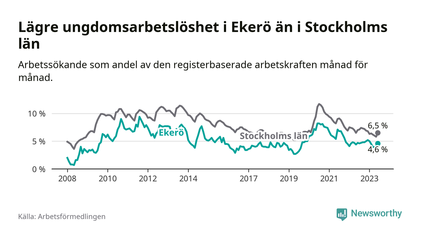 Precis som den totala arbetslösheten ligger ungdomsarbetslösheten i Ekerö lägre än i Stockholms län som helhet. Skillnaden mellan kommunen och länet är 1,9 procentenheter.