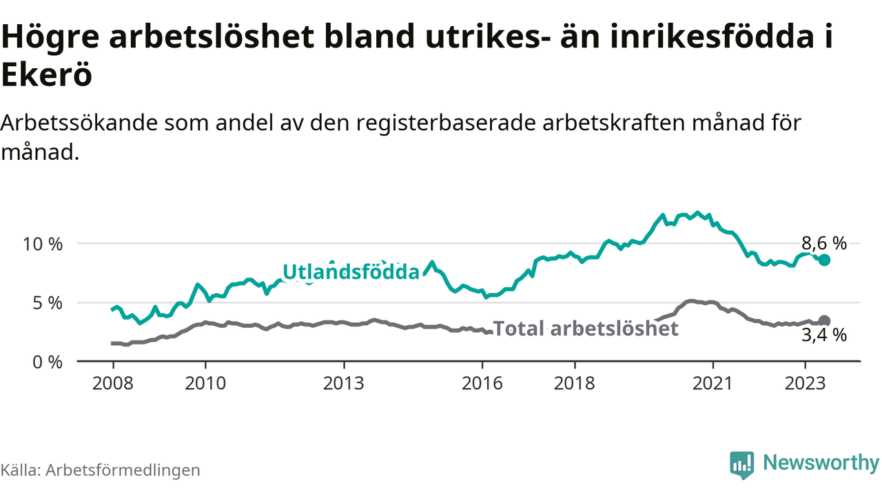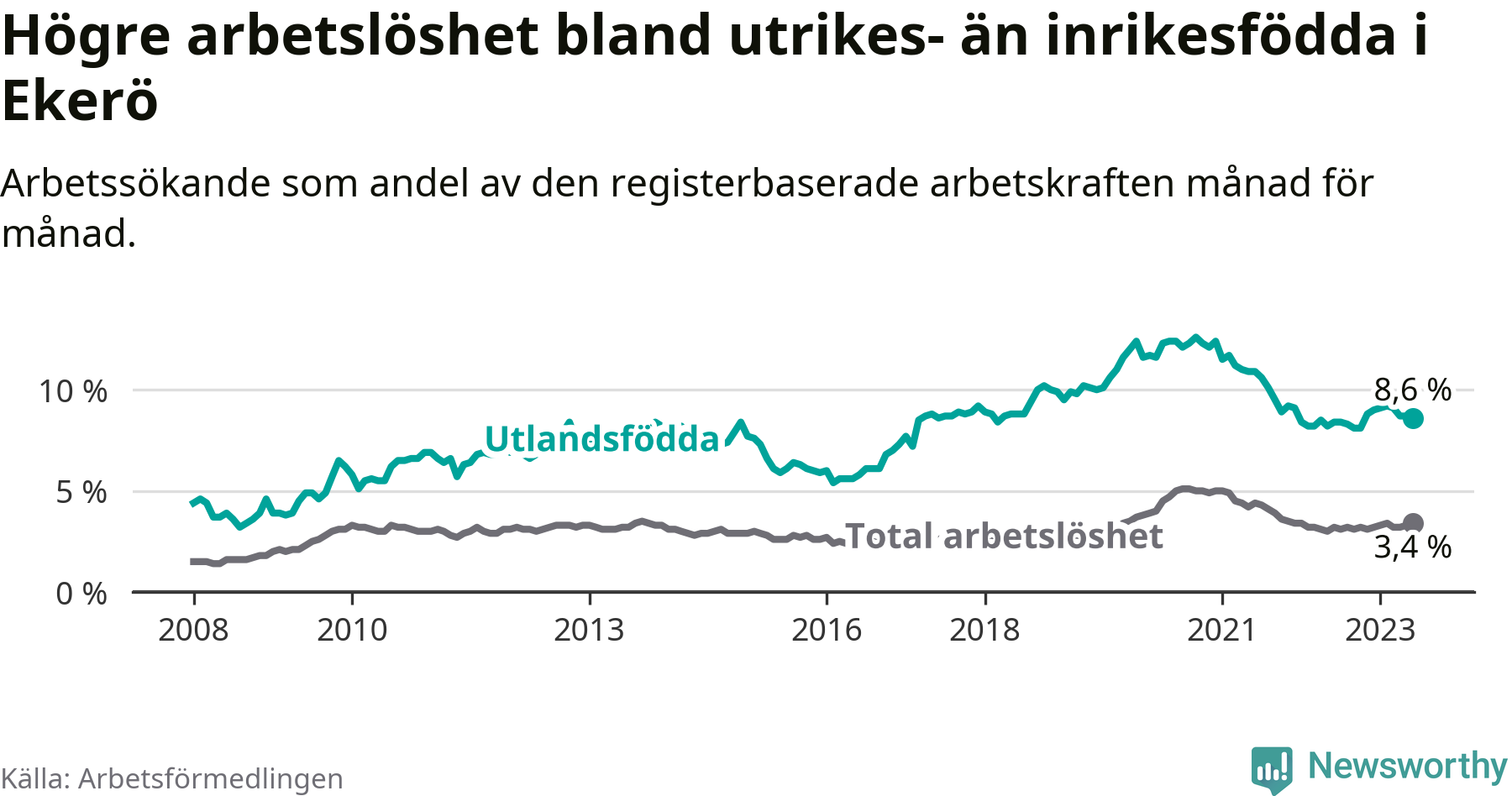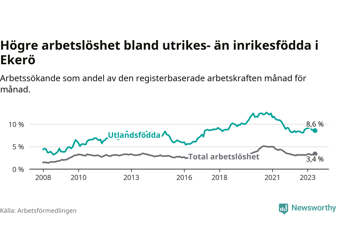 Arbetslösheten bland utlandsfödda var 8,6 procent i Ekerö under juni månad, motsvarande 209 av 2 430 personer. Det är 0,2 procentenheter fler än vid samma tidpunkt i fjol (+9 om man räknar personer). Därmed är de utlandsföddas arbetslöshet högre än vid samma tidpunkt i fjol för sjätte månaden i följd.