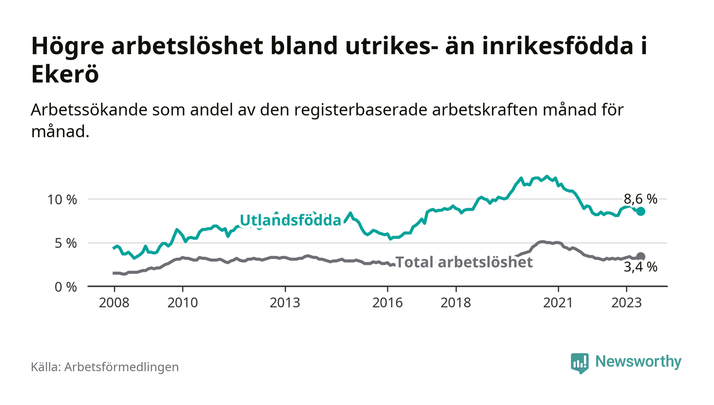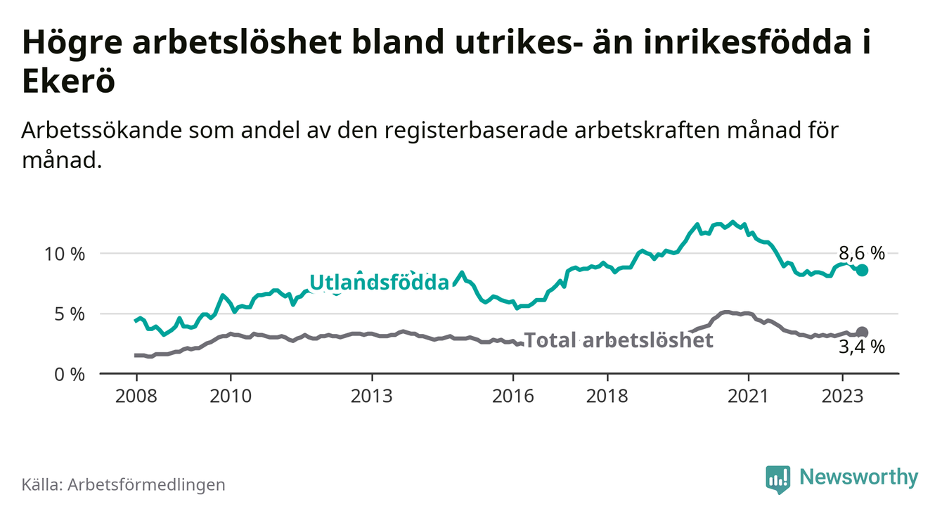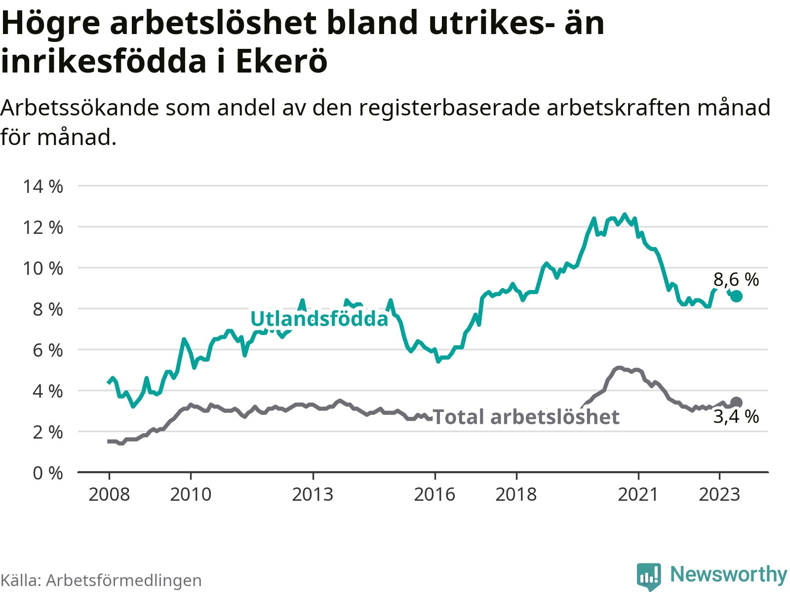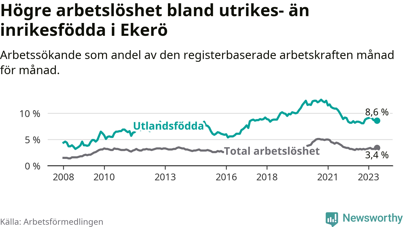 Arbetslösheten bland utlandsfödda var 8,6 procent i Ekerö under juni månad, motsvarande 209 av 2 430 personer. Det är 0,2 procentenheter fler än vid samma tidpunkt i fjol (+9 om man räknar personer). Därmed är de utlandsföddas arbetslöshet högre än vid samma tidpunkt i fjol för sjätte månaden i följd.