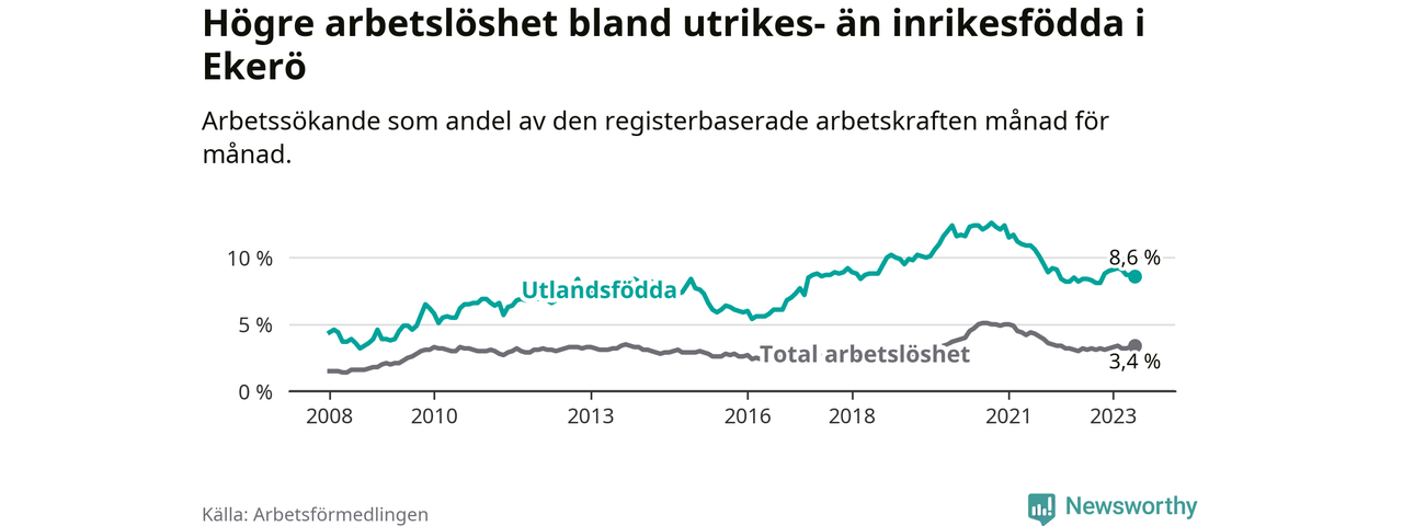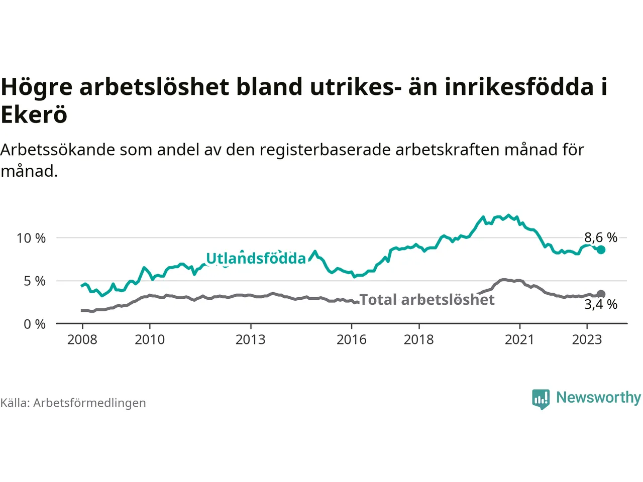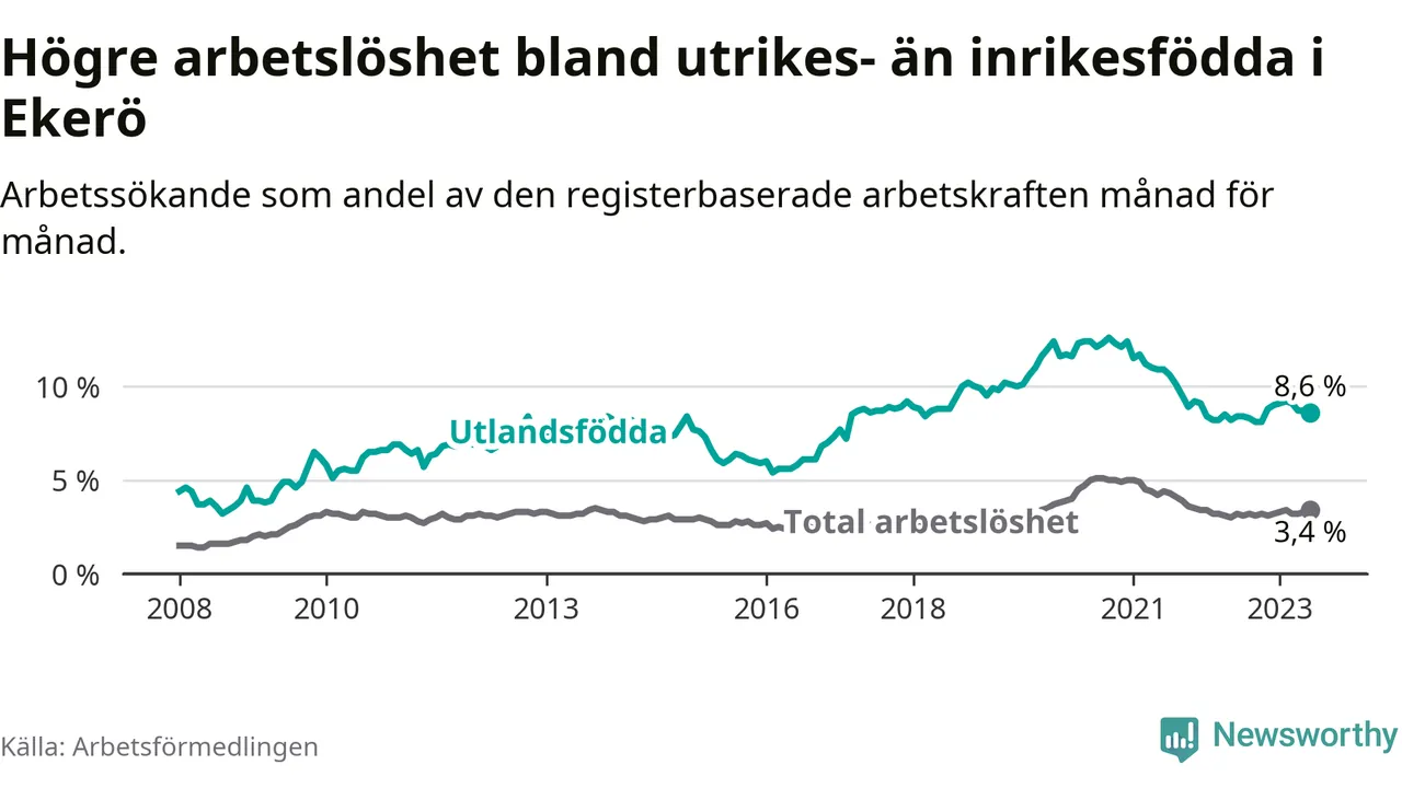 Skillnaden i arbetslöshet mellan utrikesfödda och hela befolkningen är 5,2 procentenheter i Ekerö. Det är ungefär samma skillnad som för ett år sedan.