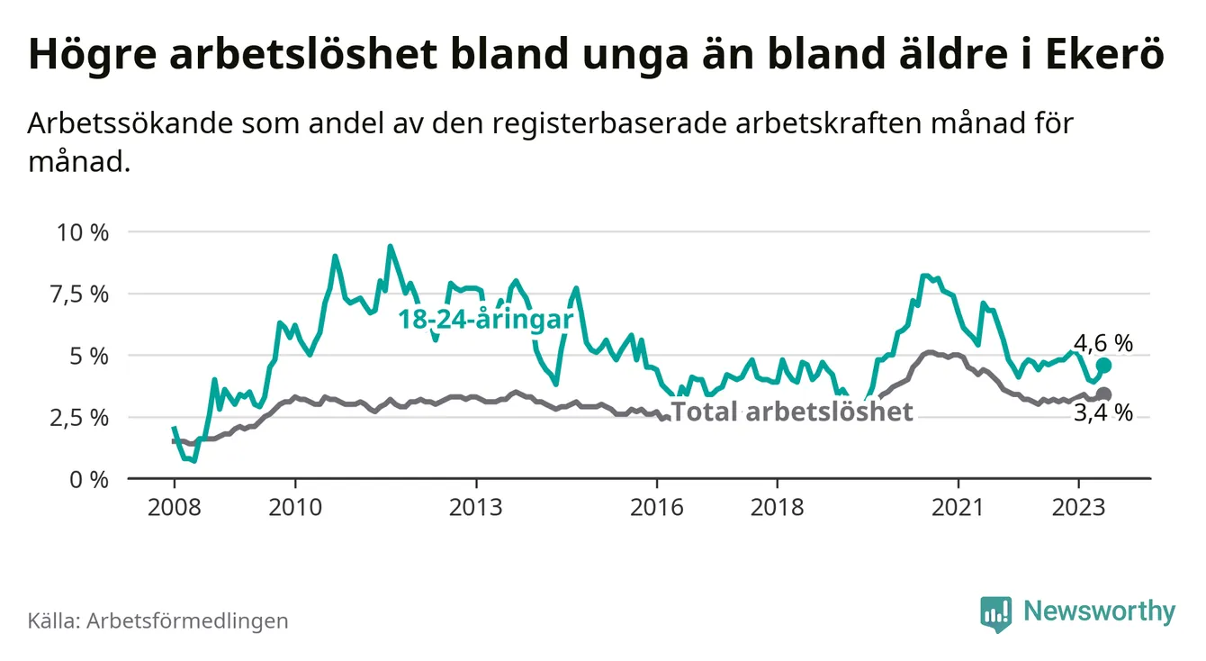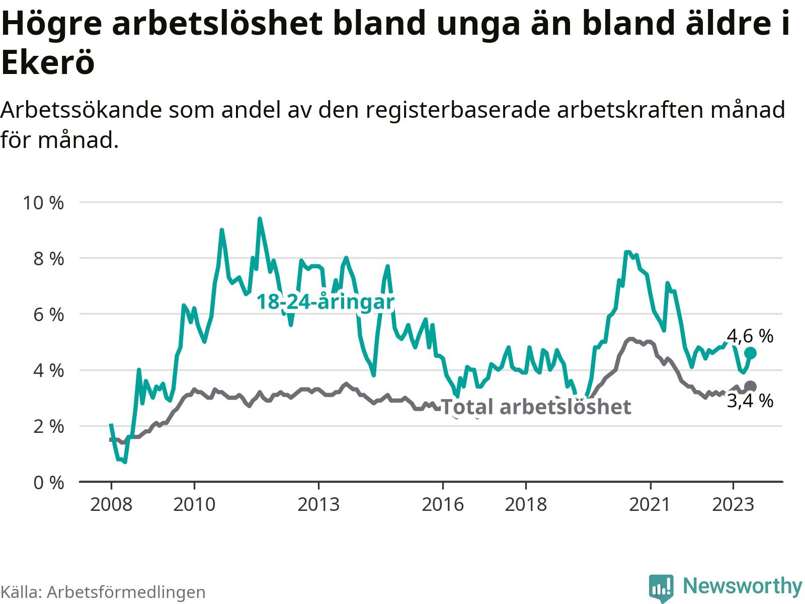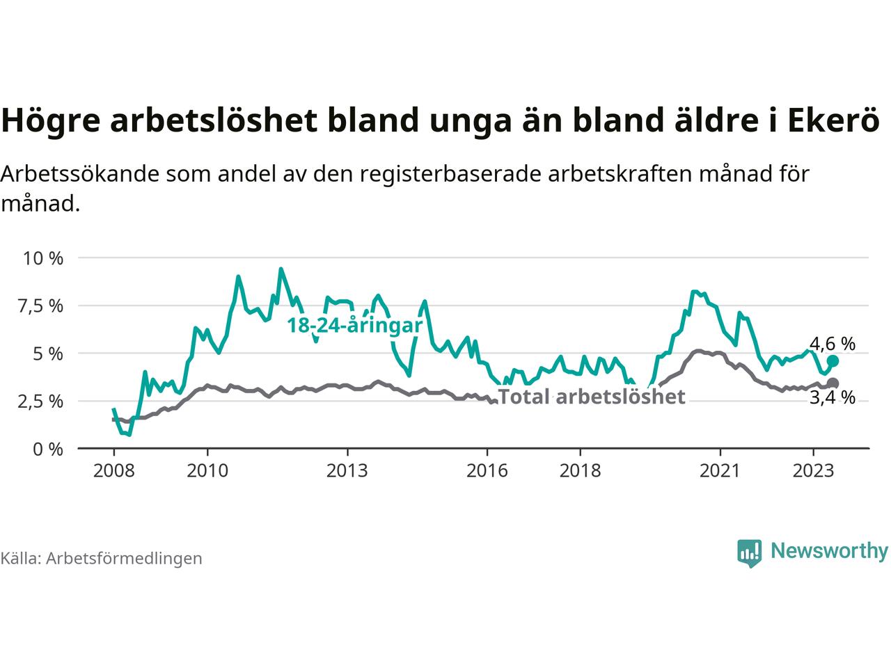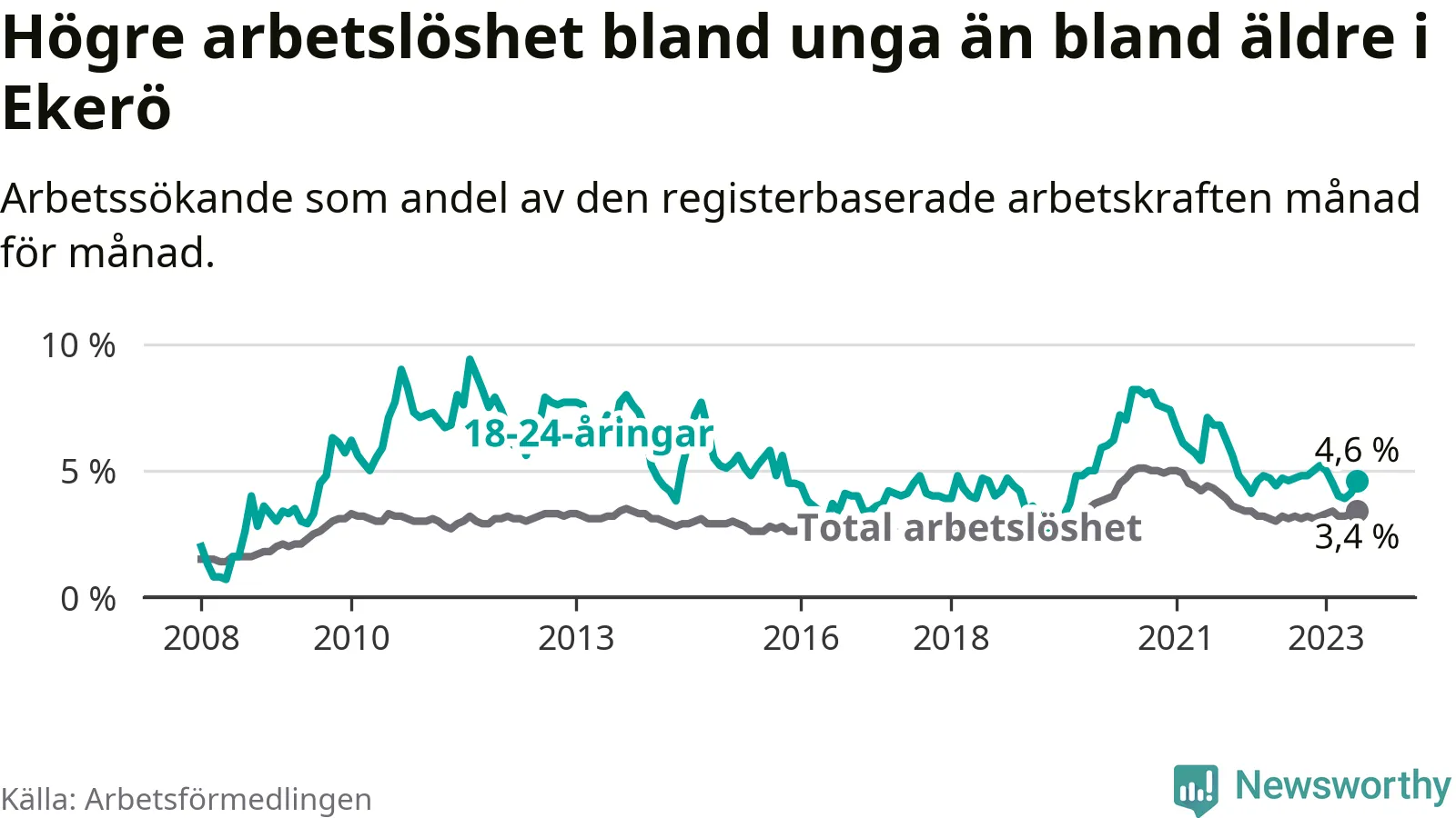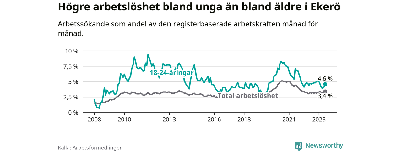 Till skillnad från den totala arbetslösheten sjunker arbetslösheten bland unga (−0,1 procentenheter). I juni var 4,6 procent av 18–24-åringarna inskrivna som arbetssökande (motsvarande 51 personer). Mäter vi antalet inskrivna ser vi en ökning med tre personer på ett års sikt.