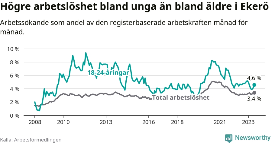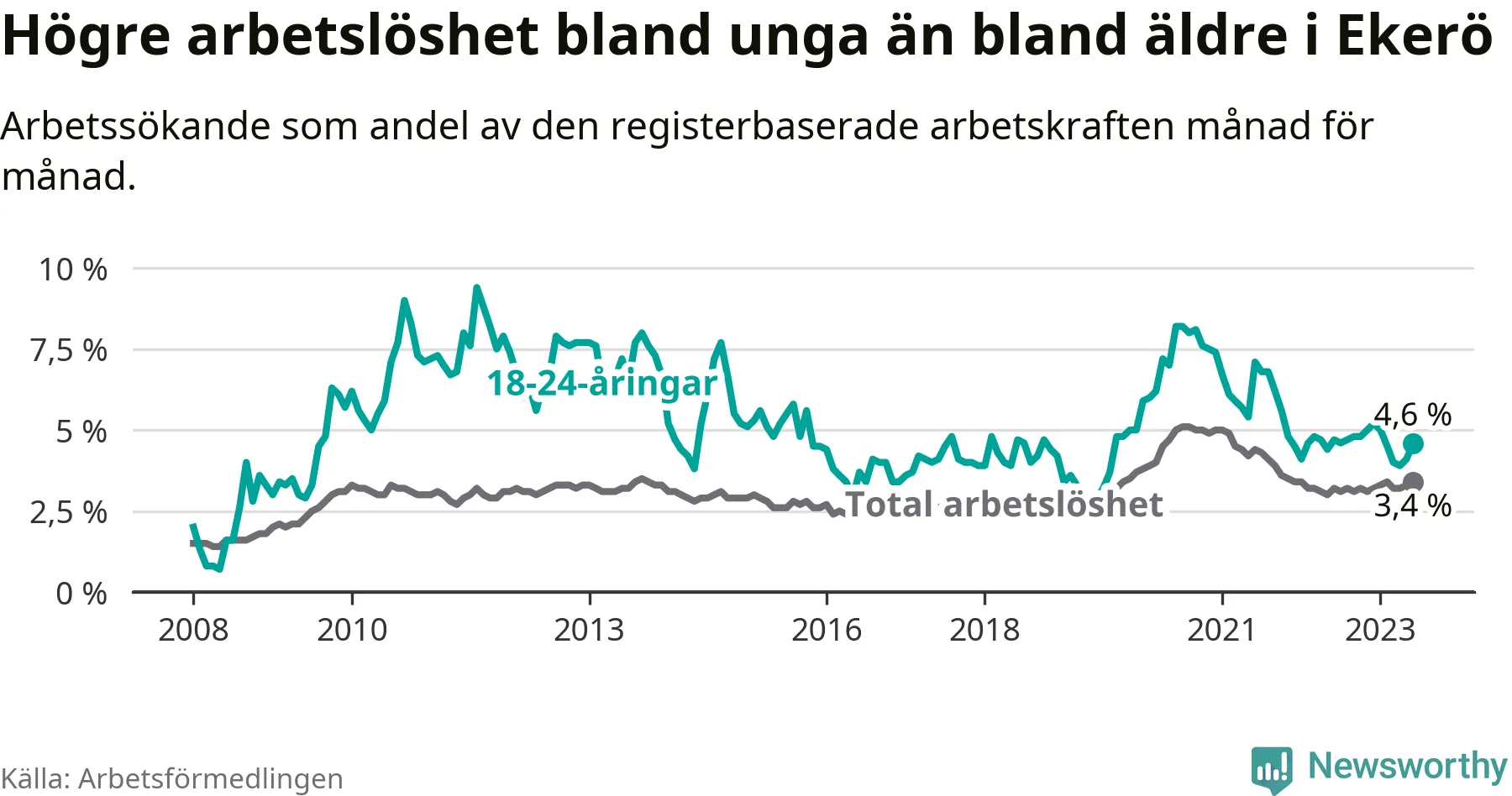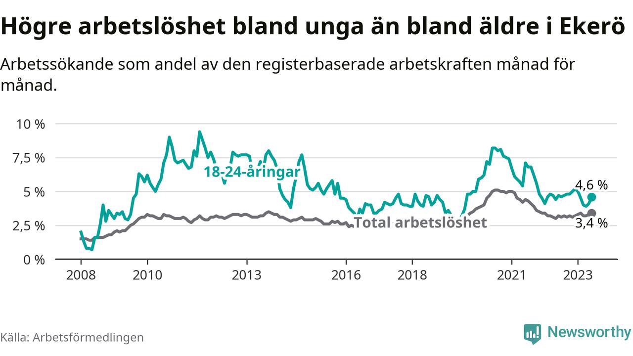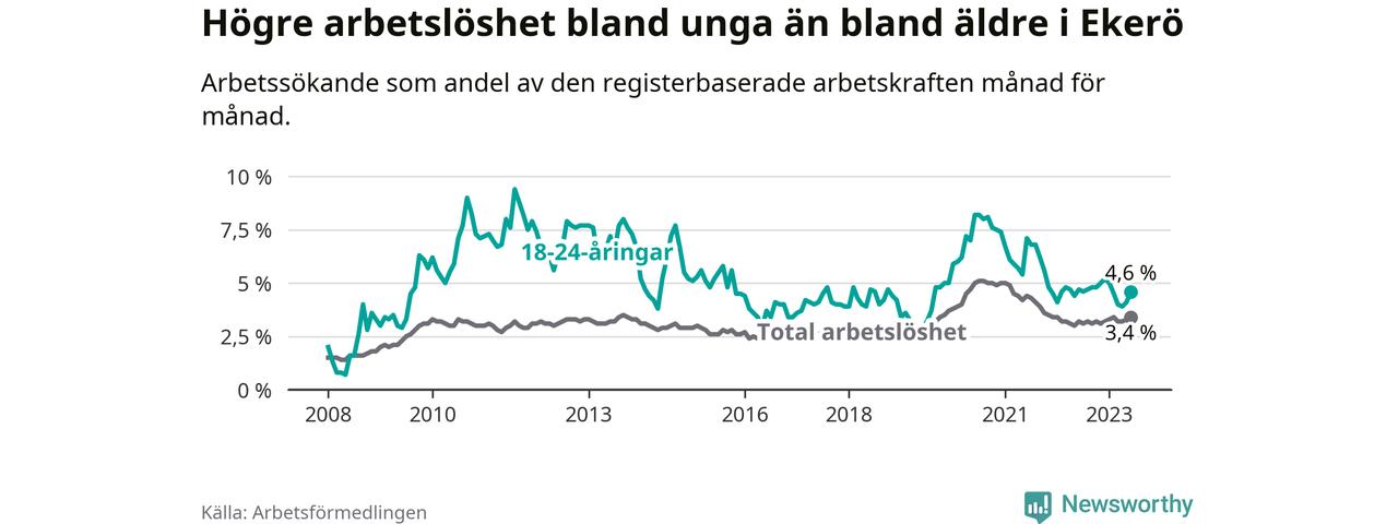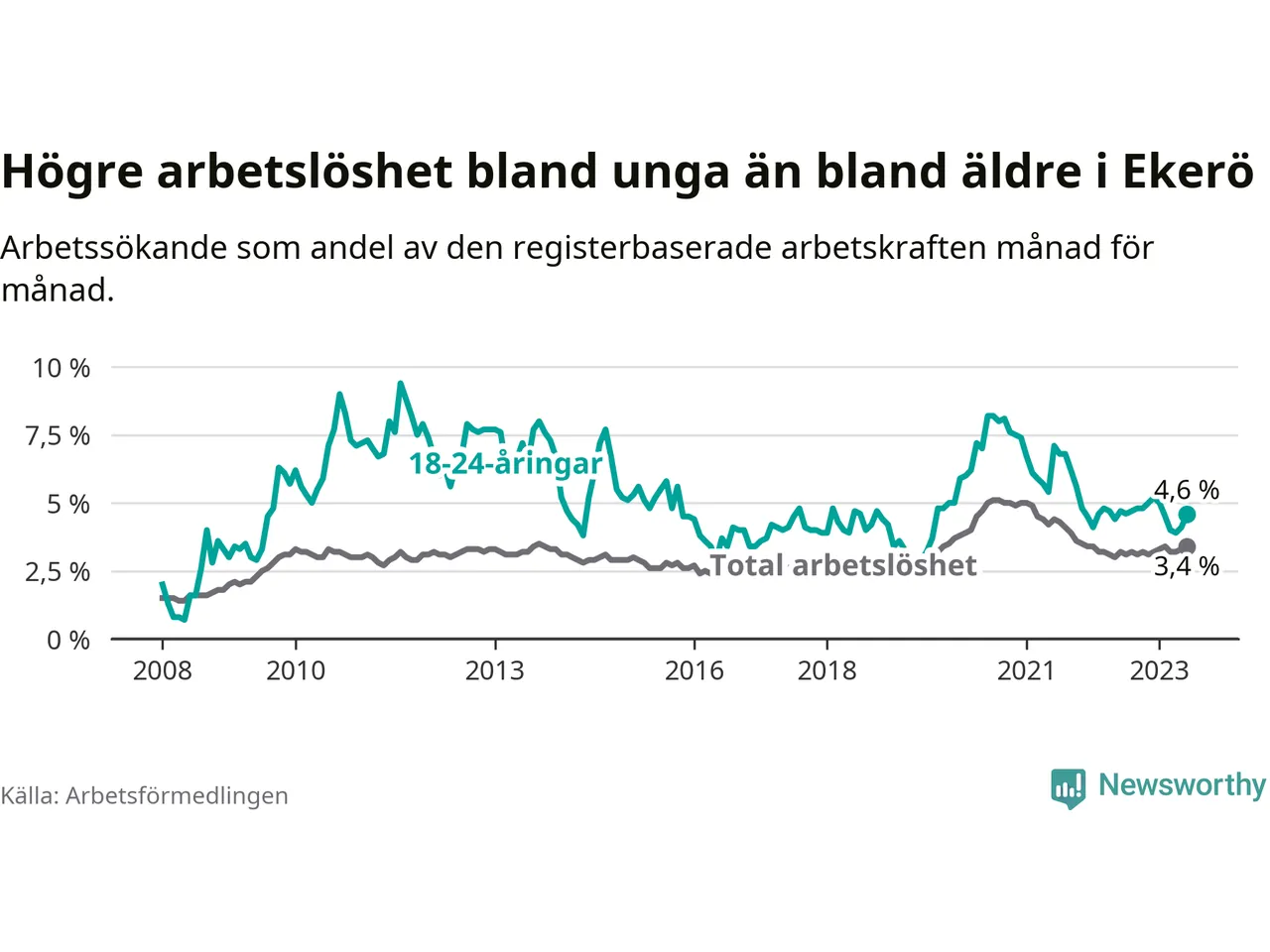 Till skillnad från den totala arbetslösheten sjunker arbetslösheten bland unga (−0,1 procentenheter). I juni var 4,6 procent av 18–24-åringarna inskrivna som arbetssökande (motsvarande 51 personer). Mäter vi antalet inskrivna ser vi en ökning med tre personer på ett års sikt.
