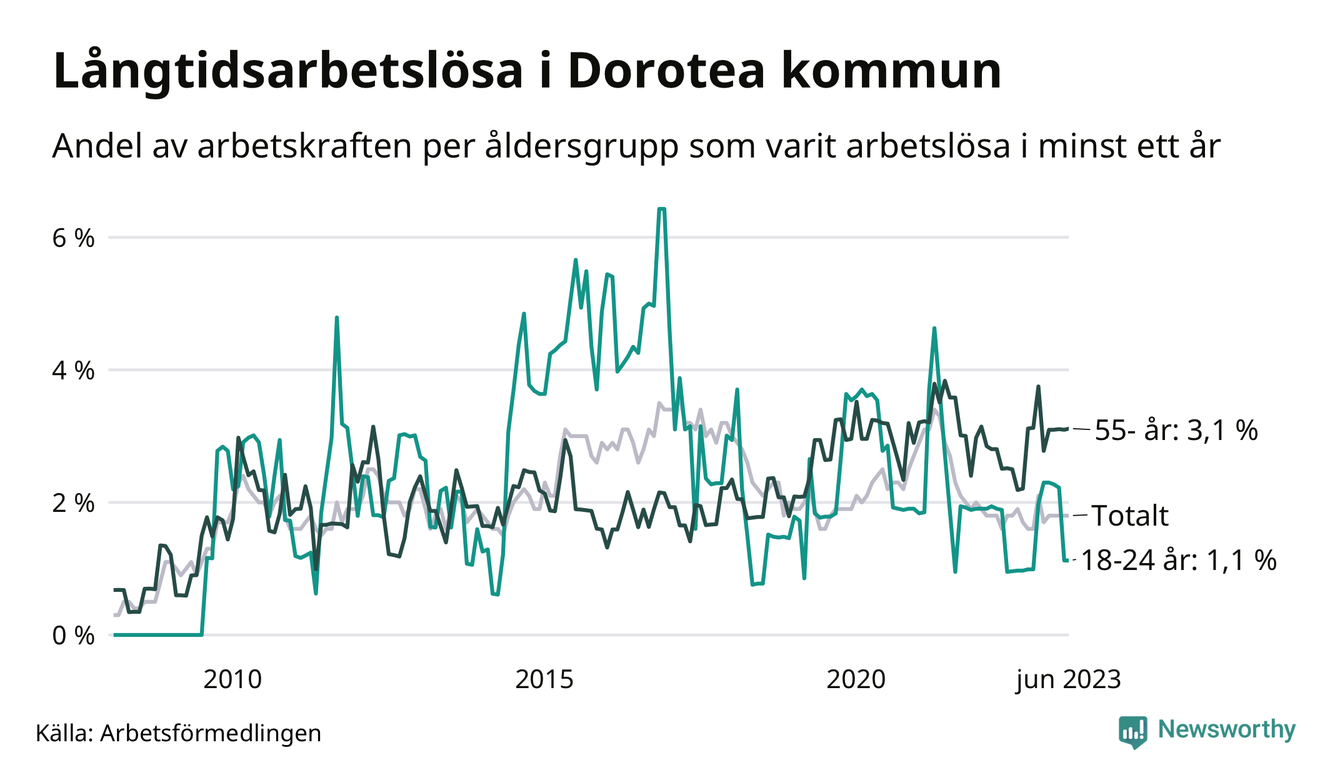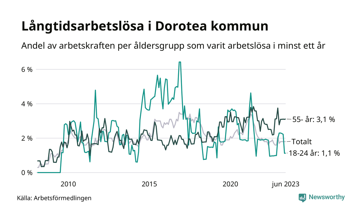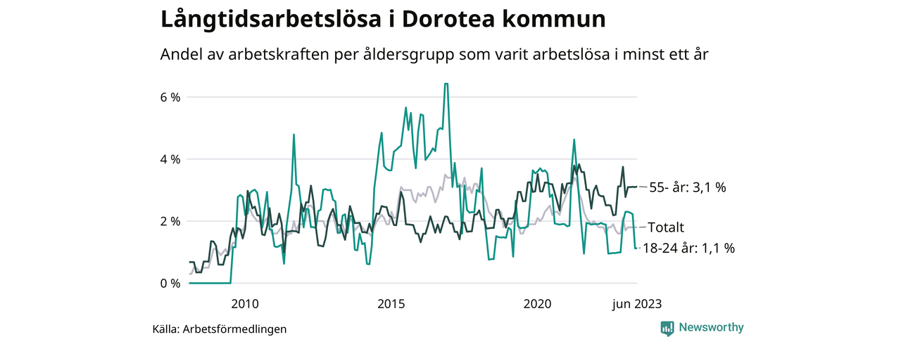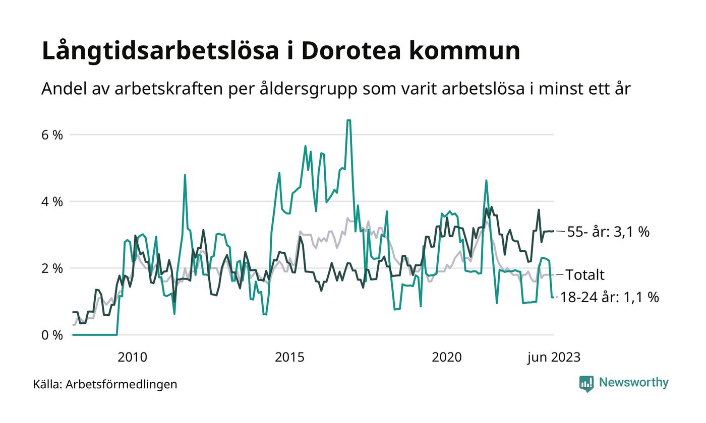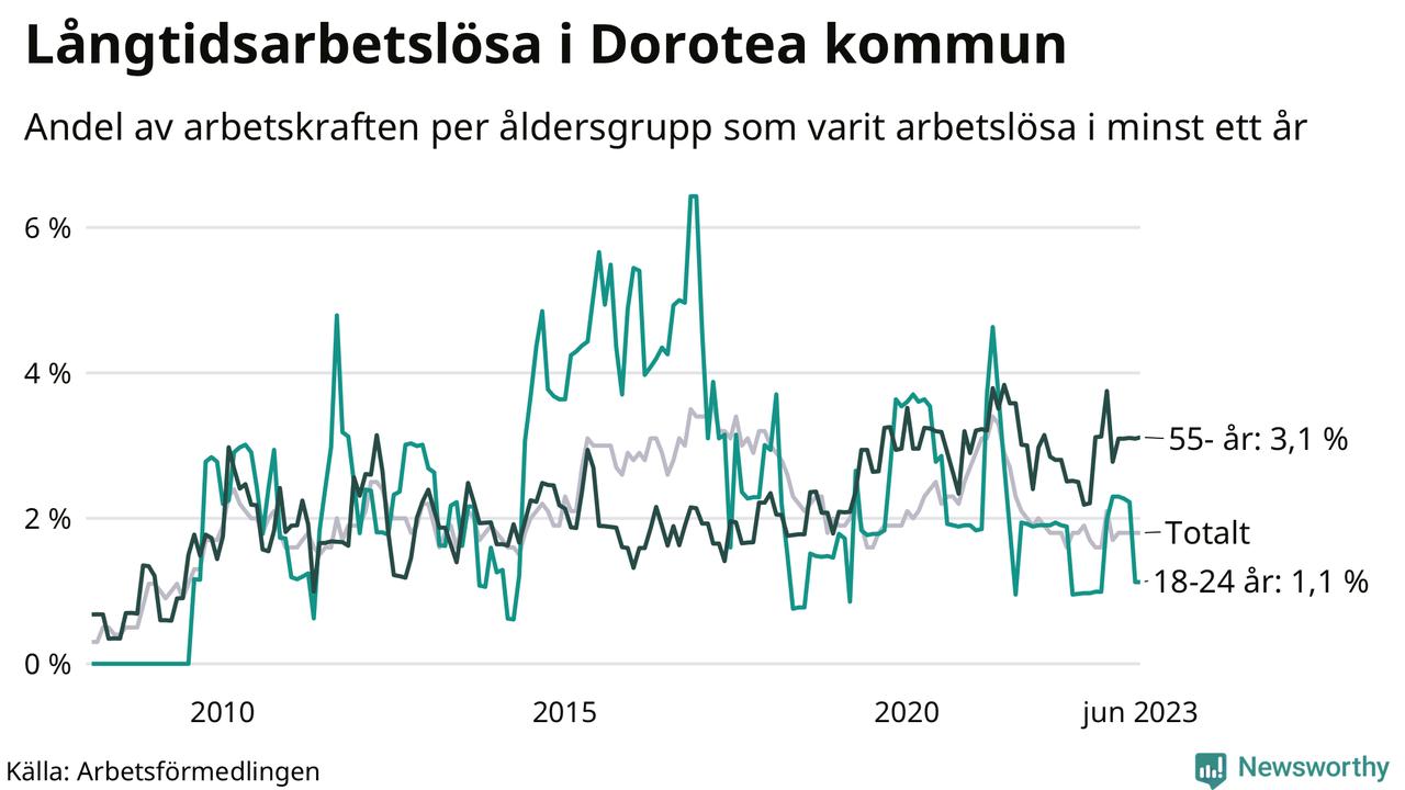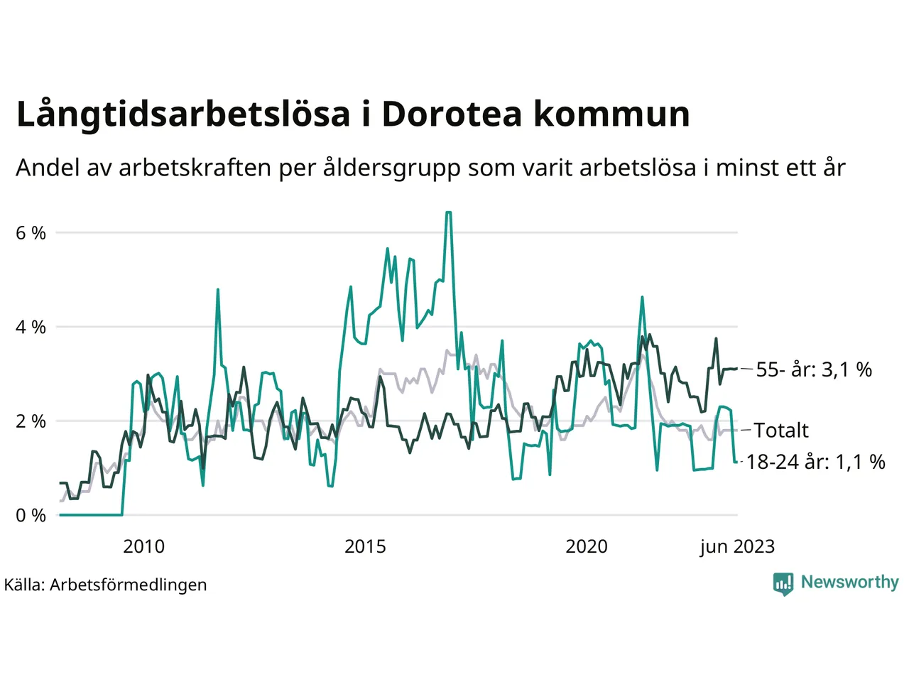 Av de 19 personerna som varit arbetslösa i mer än ett år i Dorotea kommun är tio personer mellan 55 och 651 år och en är mellan 18 och 24 år. För den äldre gruppen är andelen arbetslösa 3,1 procent medan den i den yngre gruppen är 1,1 procent. Även i riket som helhet är långtidsarbetslösheten högre i gruppen äldre.