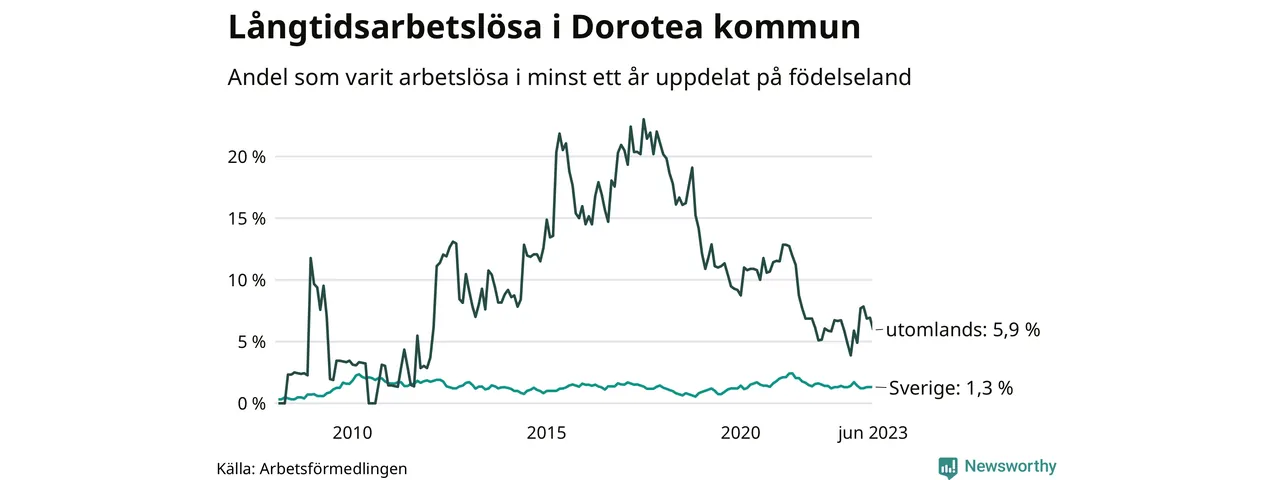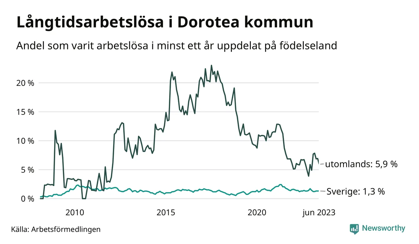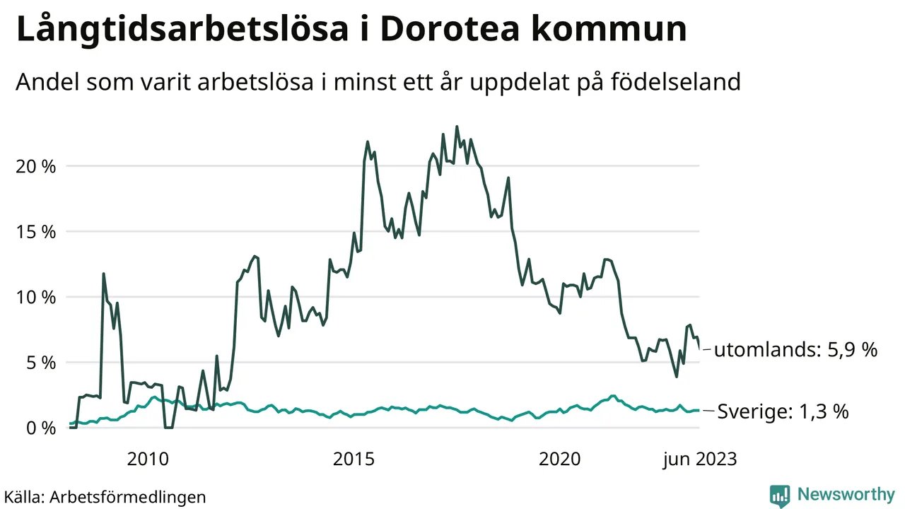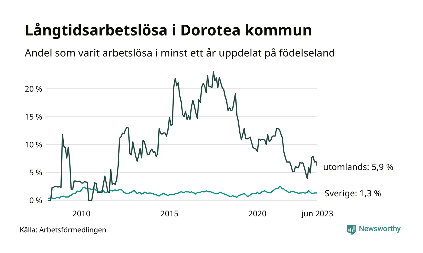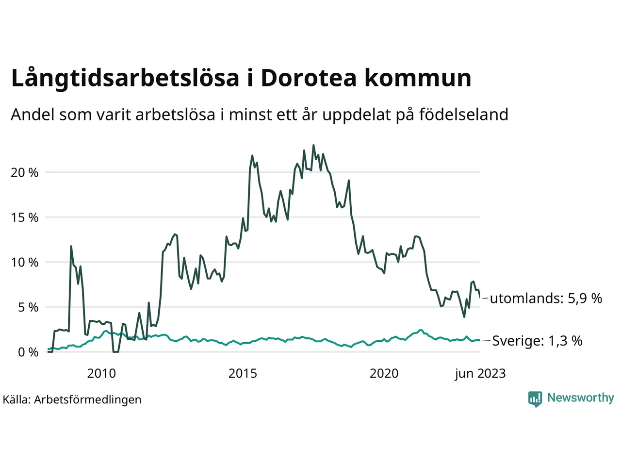 13 av de långtidsarbetslösa i Dorotea är födda i Sverige, medan sex är födda utomlands. Det innebär att långtidsarbetslösheten bland Sverigefödda är 1,3 procent, medan den är fem gånger så hög – 5,9 procent – bland födda utomlands. Även i riket som helhet är arbetslösheten högre bland utrikesfödda.