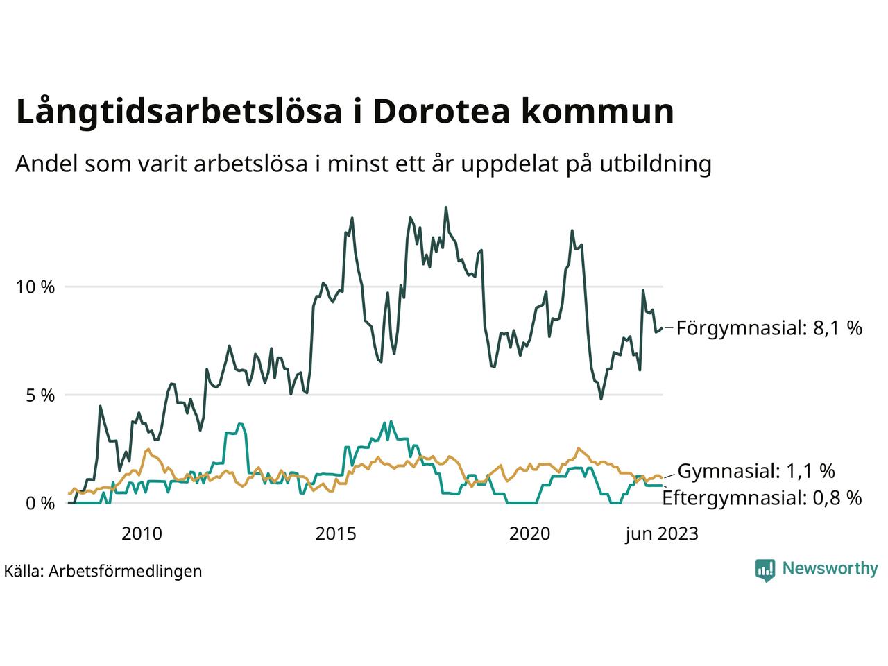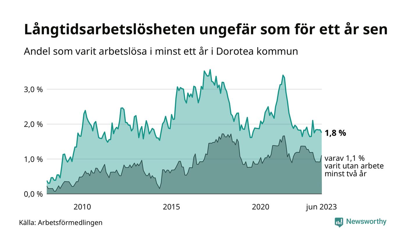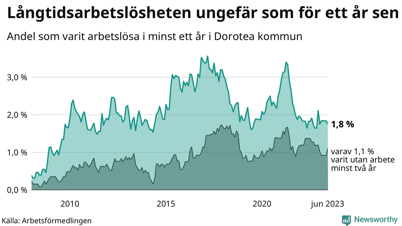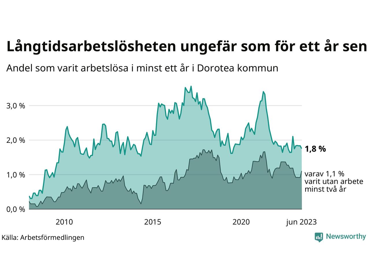 Andelen som varit utan arbete i minst ett år i Dorotea var ungefär lika stor i juni jämfört med samma månad för ett år sedan. Det visar Arbetsfömedlingens senaste månadsstatistik.
