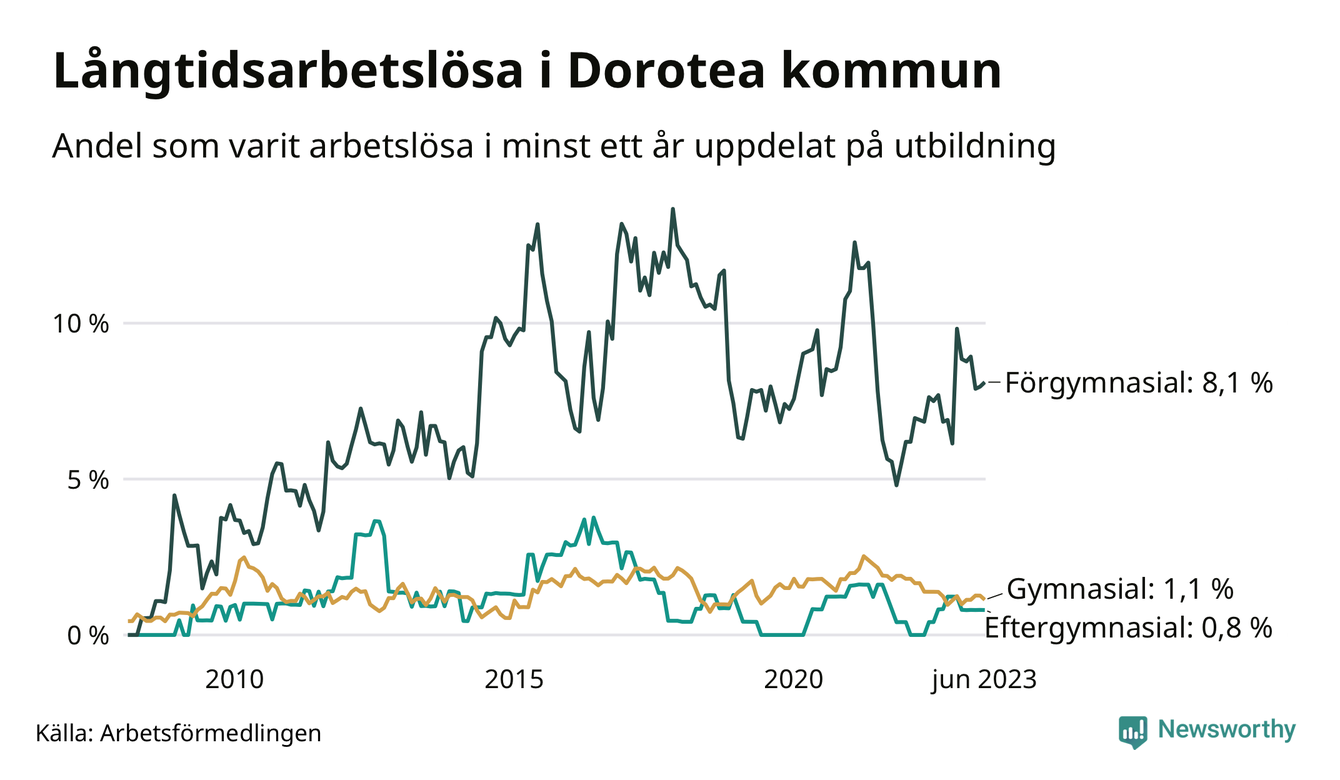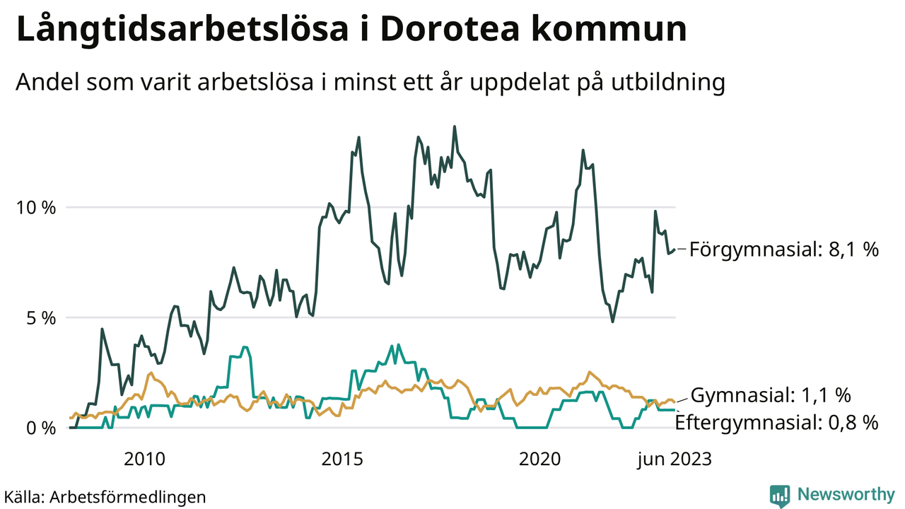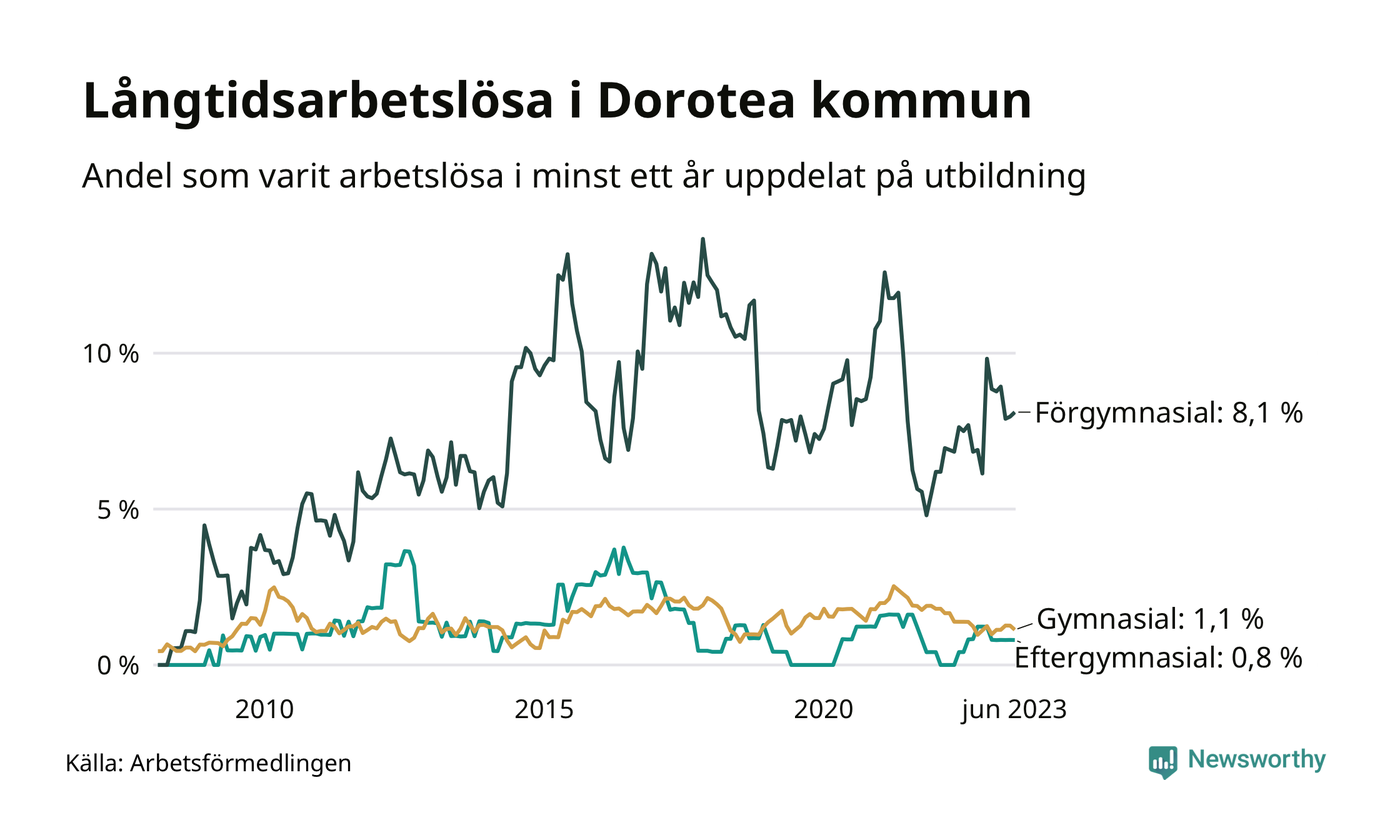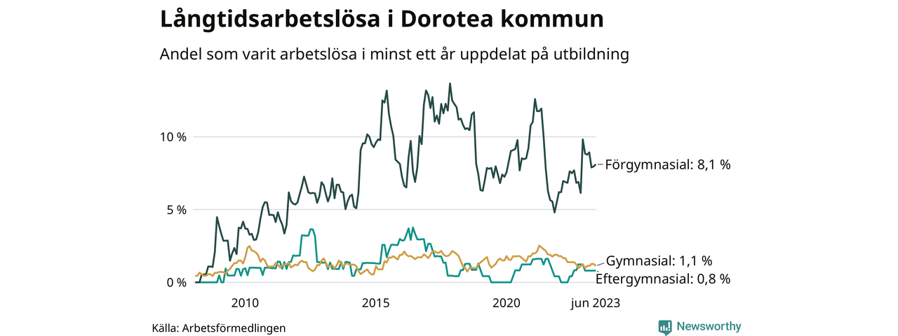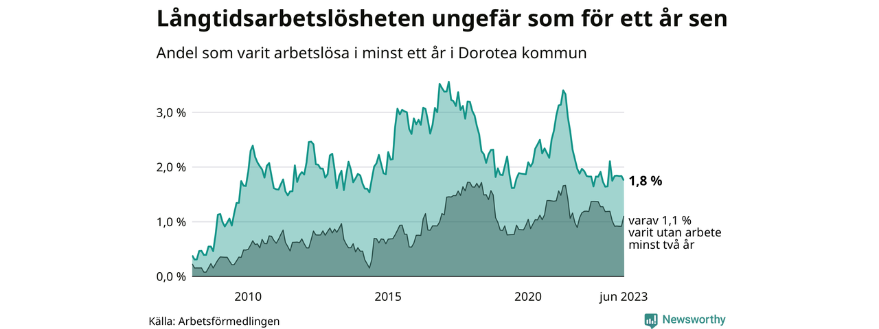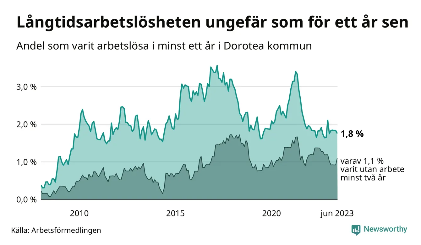 Andelen som varit utan arbete i minst ett år i Dorotea var ungefär lika stor i juni jämfört med samma månad för ett år sedan. Det visar Arbetsfömedlingens senaste månadsstatistik.