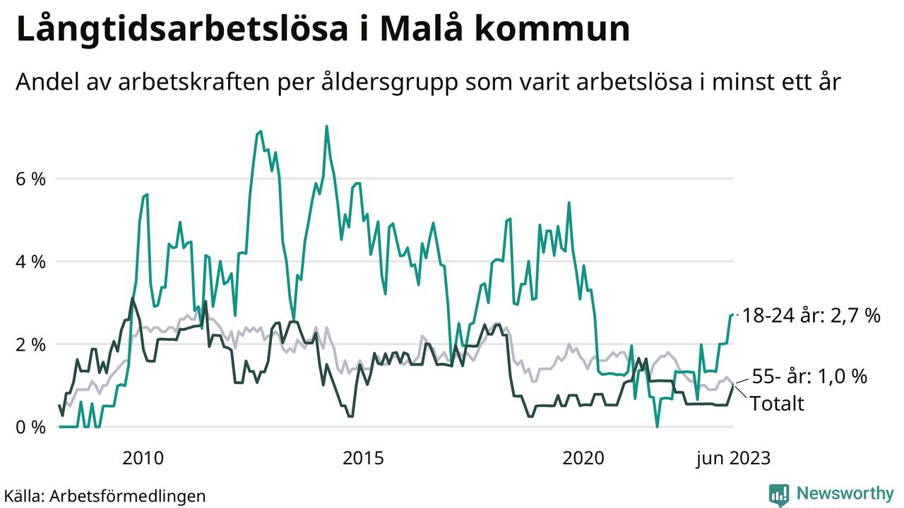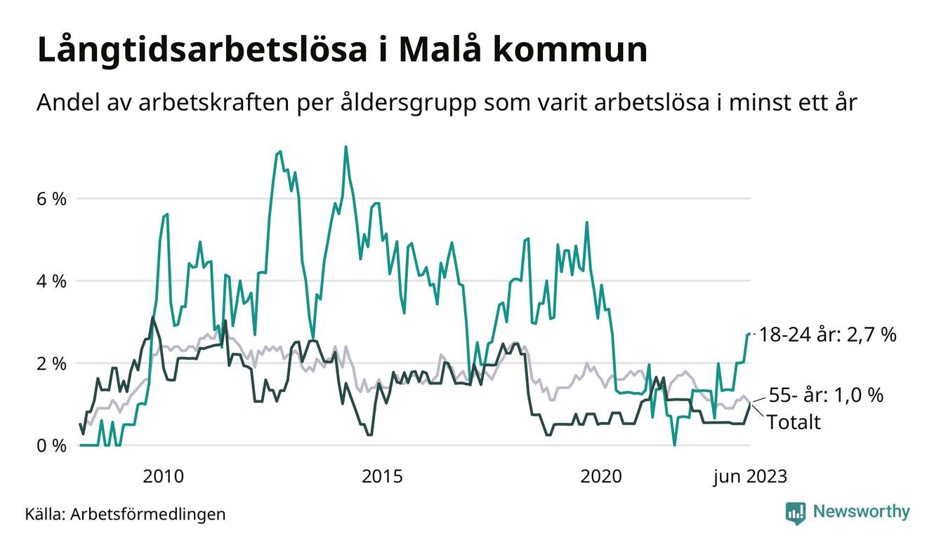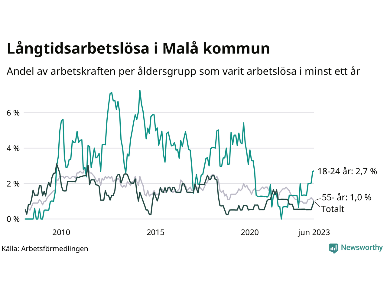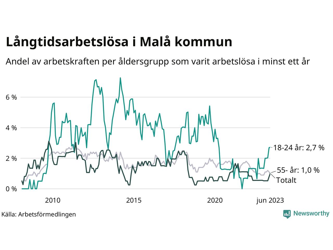 Av de 14 personerna som varit arbetslösa i mer än ett år i Malå kommun är fyra personer mellan 55 och 651 år och fyra är mellan 18 och 24 år. För den yngre gruppen är andelen arbetslösa 2,7 procent medan den bland yngre gruppen är 1,0. I riket som helhet är andelen långtidsarbetslösa högre i den äldre gruppen.