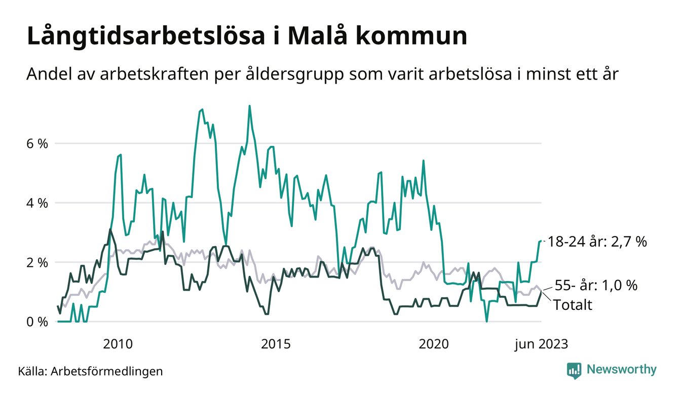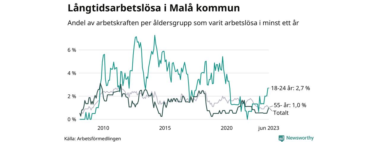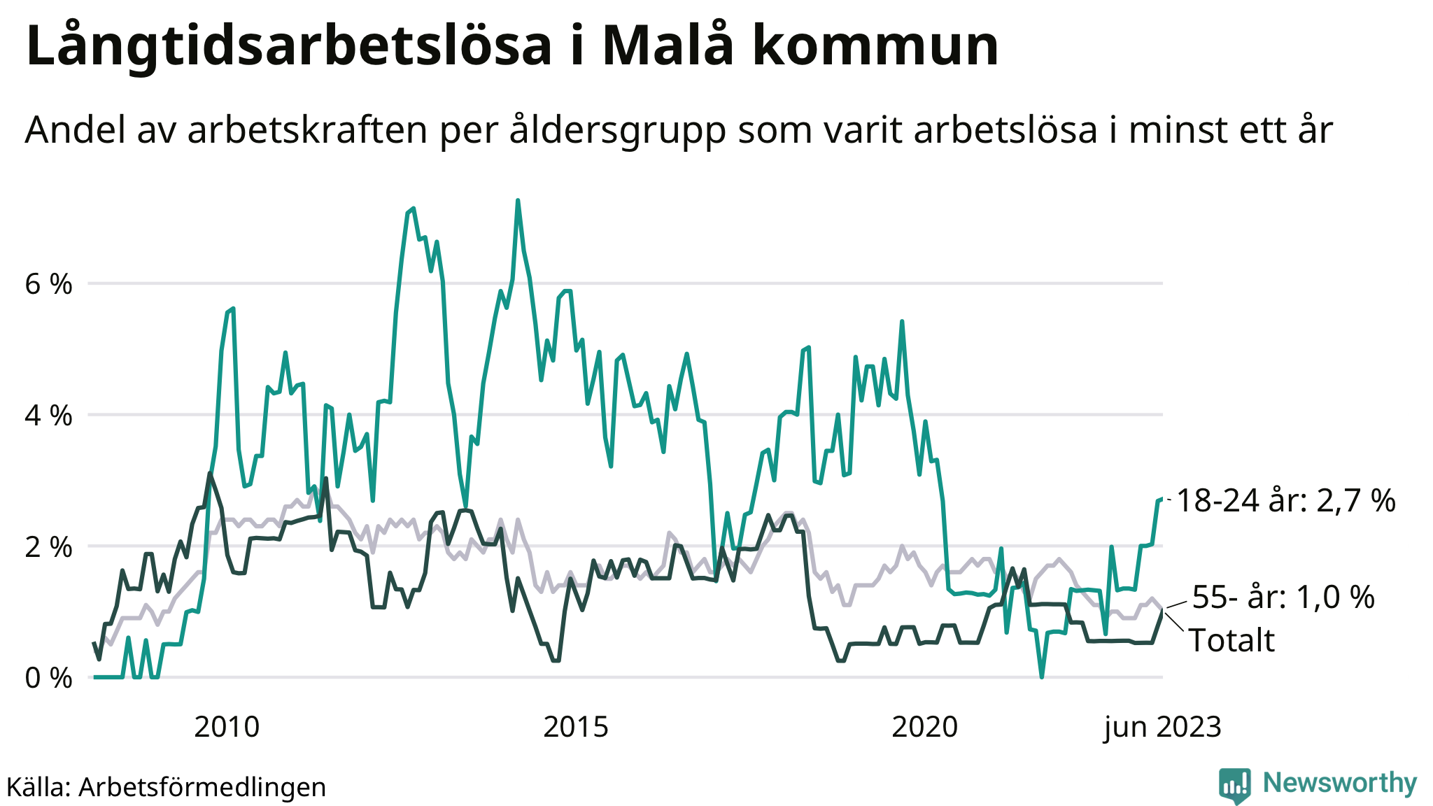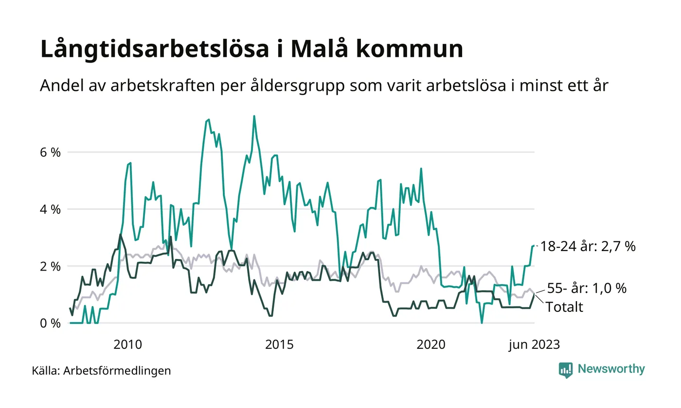 Av de 14 personerna som varit arbetslösa i mer än ett år i Malå kommun är fyra personer mellan 55 och 651 år och fyra är mellan 18 och 24 år. För den yngre gruppen är andelen arbetslösa 2,7 procent medan den bland yngre gruppen är 1,0. I riket som helhet är andelen långtidsarbetslösa högre i den äldre gruppen.