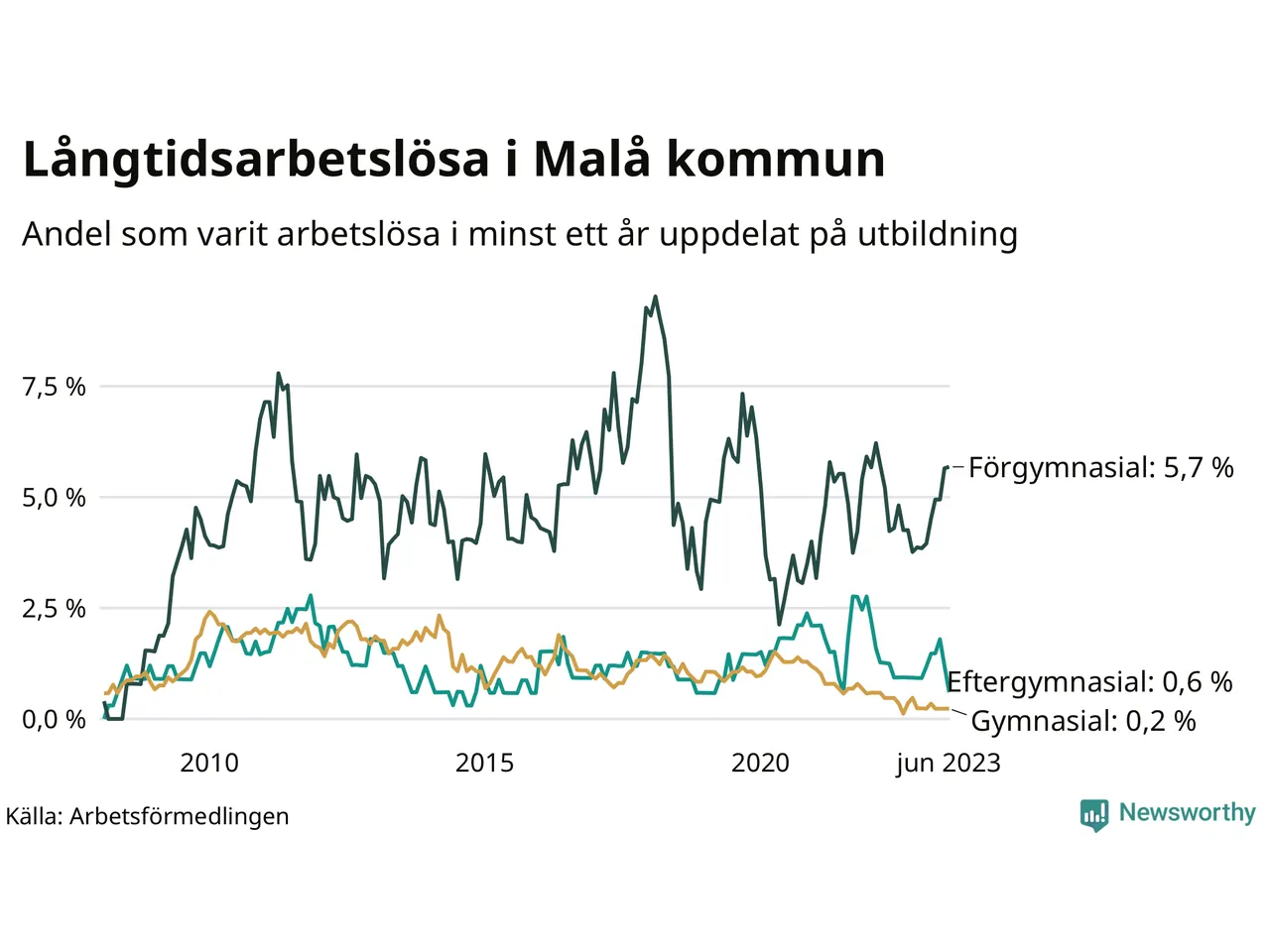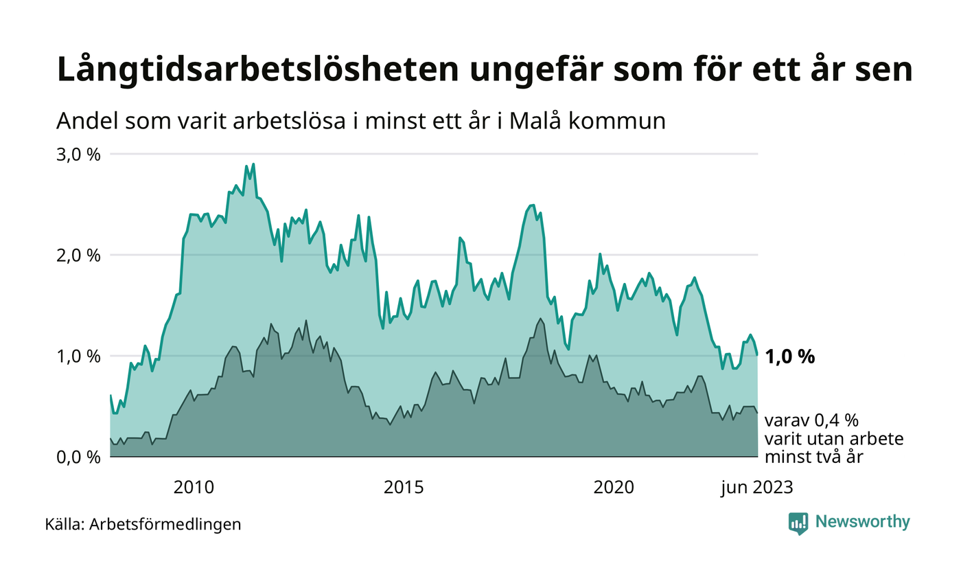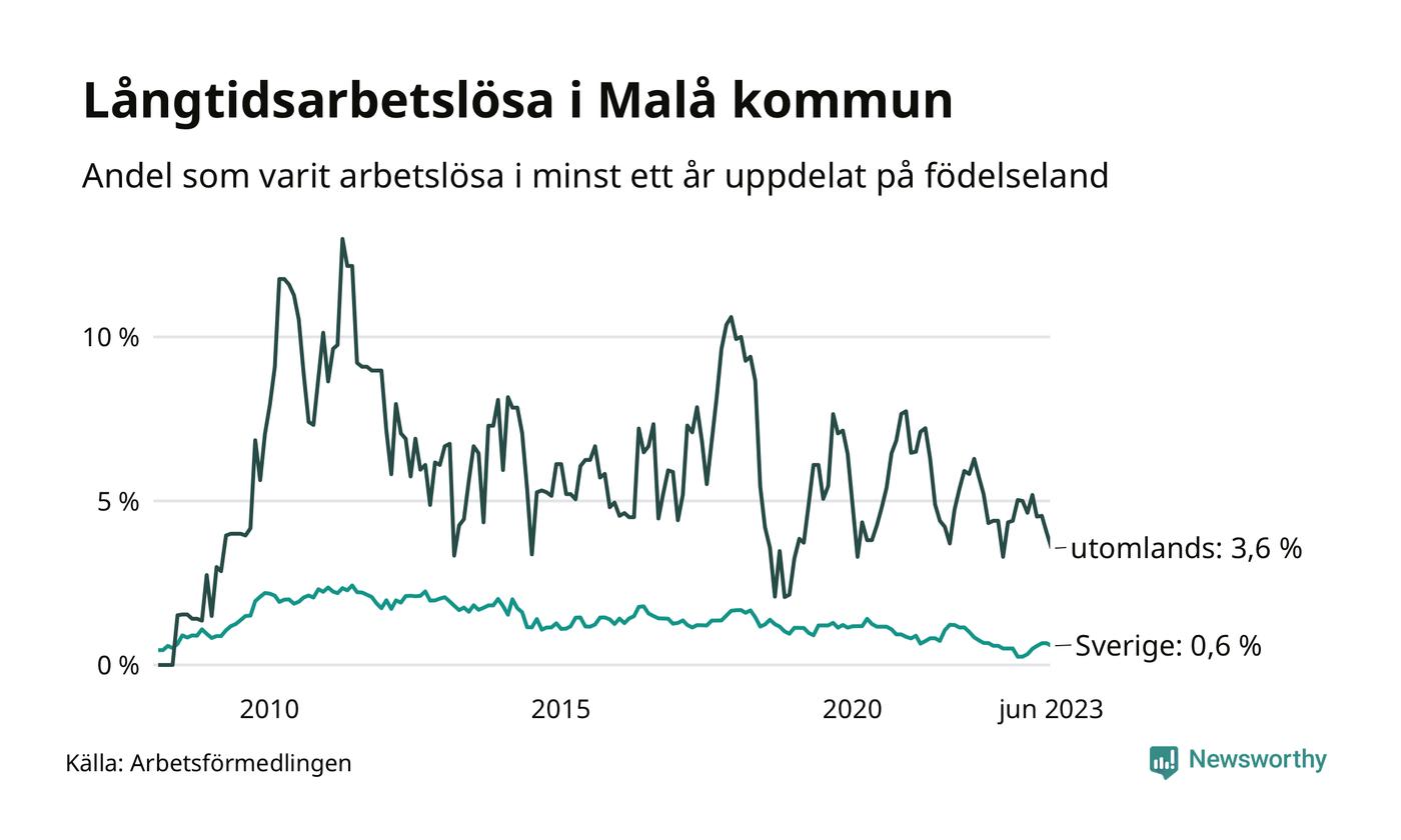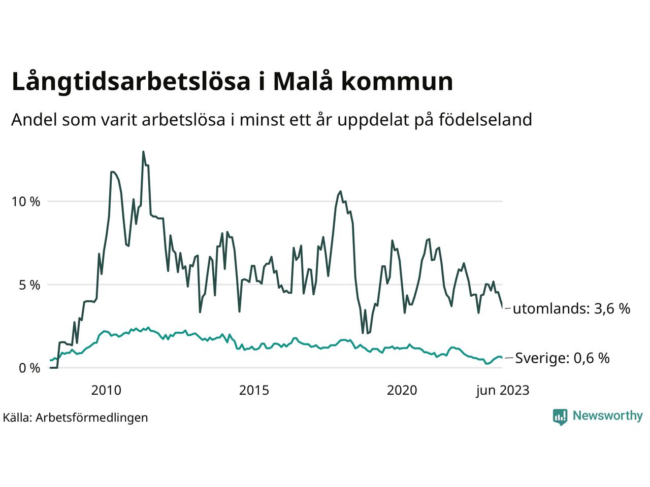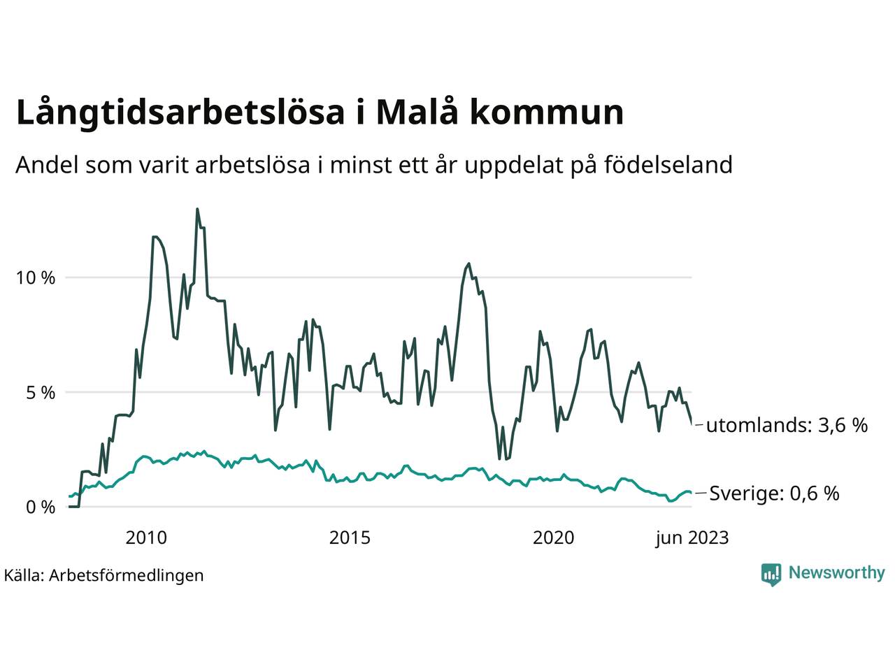 I juni hade 14 Malåbor varit arbetslösa i minst ett år, vilket är två färre än månaden innan. 14 personer motsvarar 1,0 procent av arbetskraften i kommunen – andelen långtidsarbetslösa är ungefär på samma nivå som för ett år sedan. Malå tillhör de kommuner med lägst andel långtidsarbetslösa i hela landet just nu.