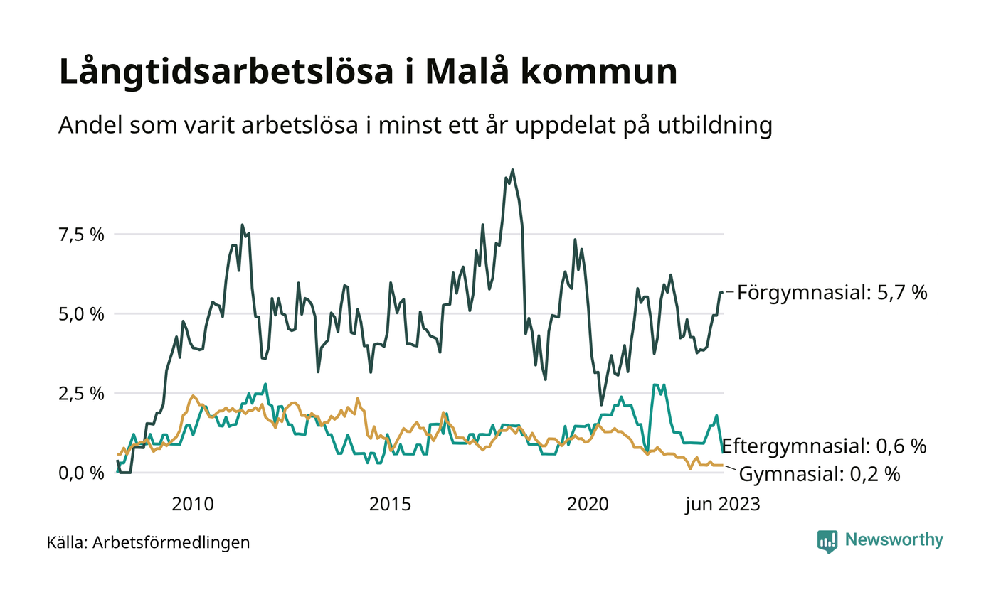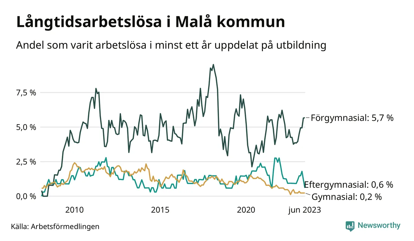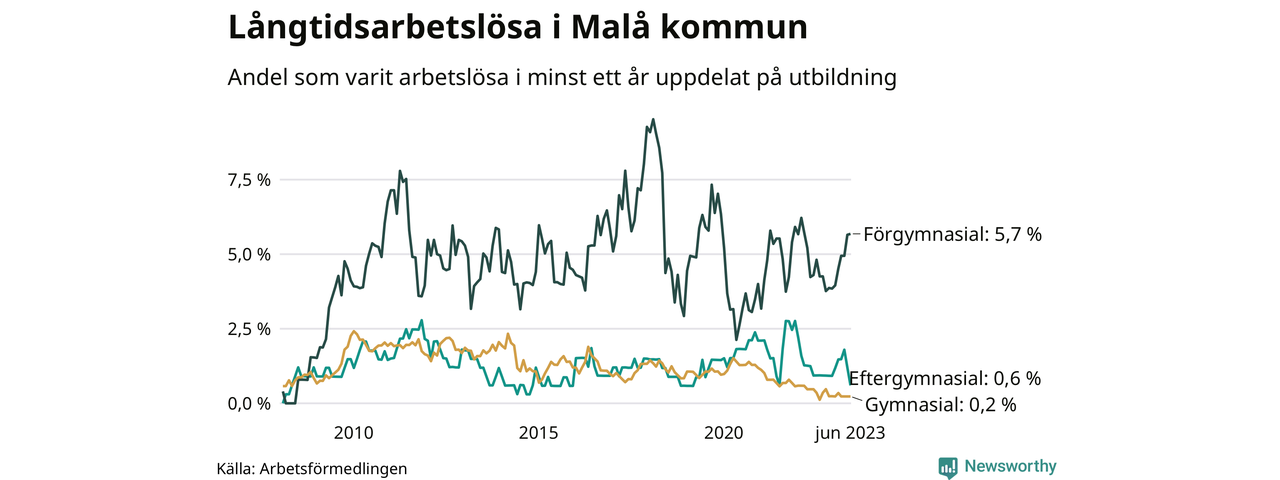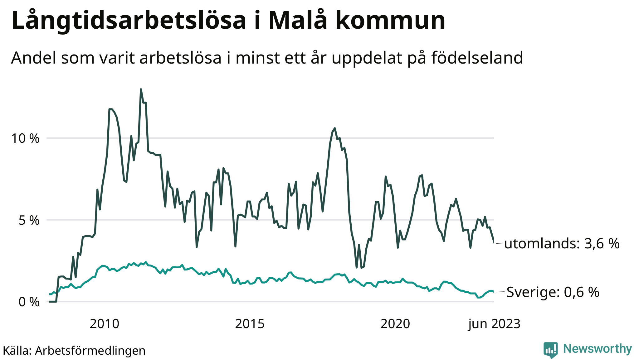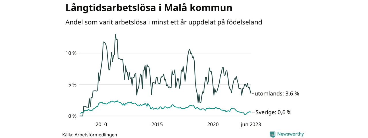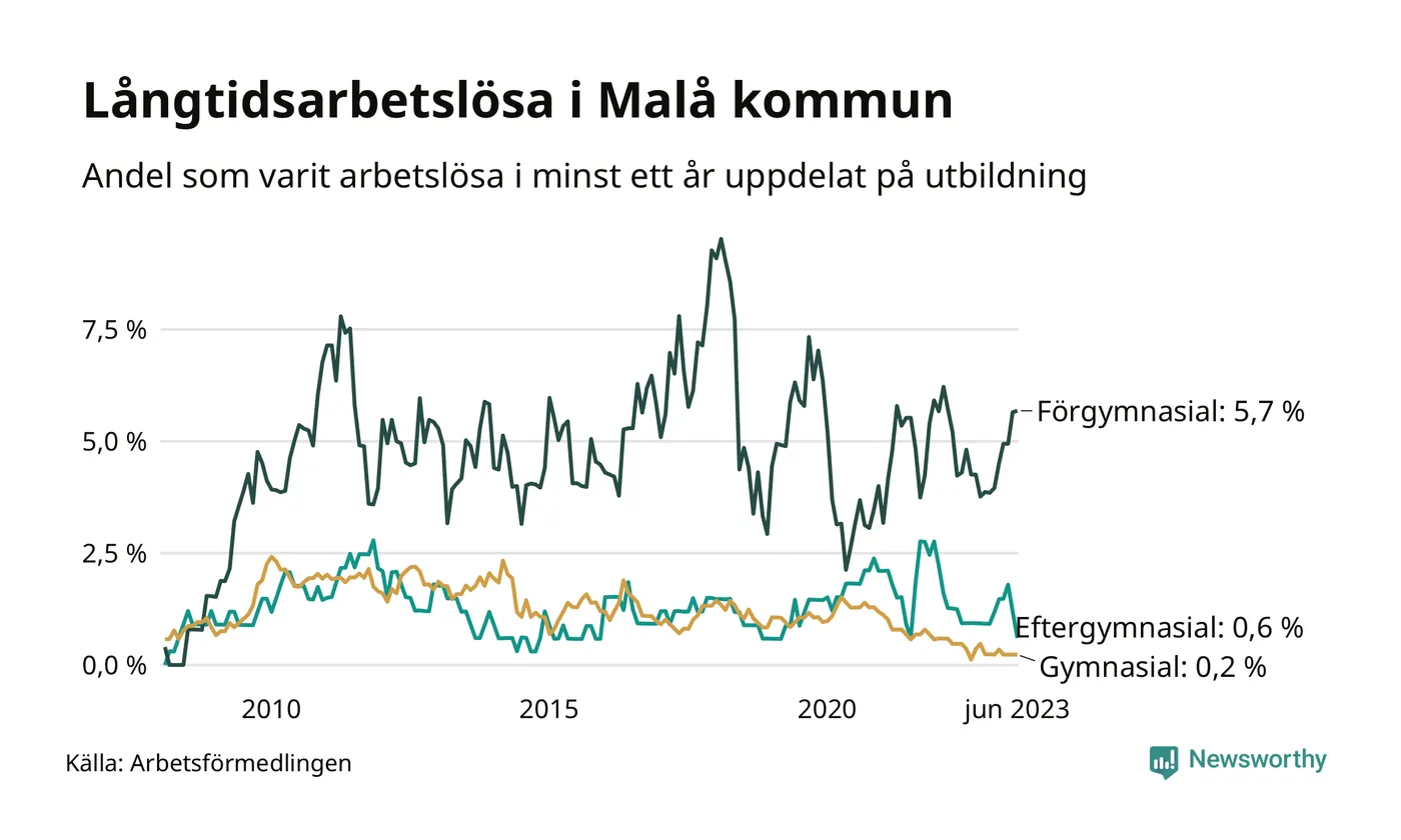 I juni hade 14 Malåbor varit arbetslösa i minst ett år, vilket är två färre än månaden innan. 14 personer motsvarar 1,0 procent av arbetskraften i kommunen – andelen långtidsarbetslösa är ungefär på samma nivå som för ett år sedan. Malå tillhör de kommuner med lägst andel långtidsarbetslösa i hela landet just nu.
