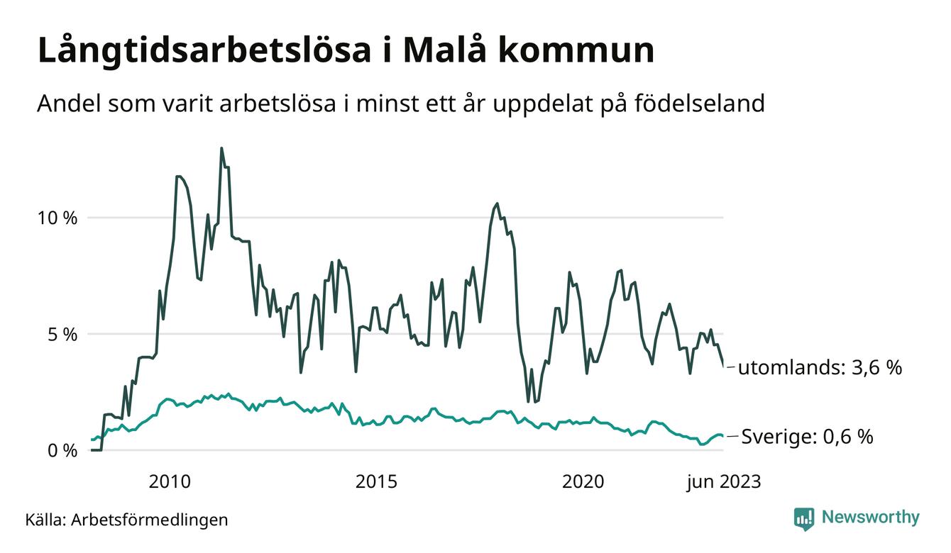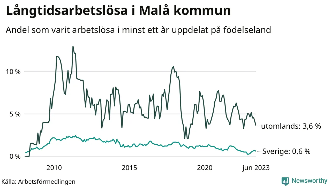 Sju av de långtidsarbetslösa i Malå är födda i Sverige, medan sju är födda utomlands. Det innebär att långtidsarbetslösheten bland Sverigefödda är 0,6 procent, medan den är 3,6 procent bland födda utomlands. Även i riket som helhet är arbetslösheten högre bland utrikesfödda.
