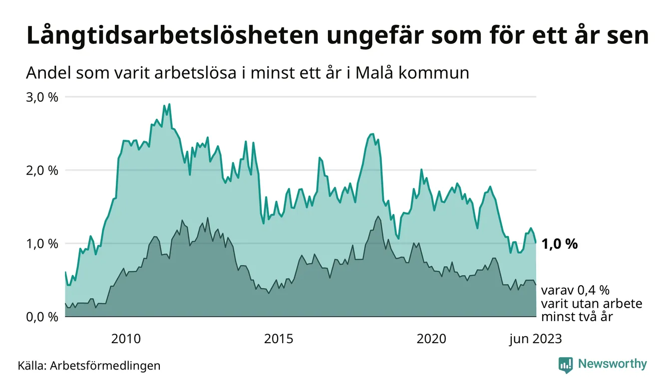 Andelen långtidsarbetslösa i Malå är den lägsta i Västerbottens län. I Åsele finns länets högsta långtidsarbetslöshet, 3,1 procent. I Västerbotten som helhet hade 1 884 personer (1,4 procent) varit arbetslösa i minst ett år i juni. Det är 94 personer färre än månaden innan, och det är den tjugosjätte månaden i rad som antalet sjunkit.