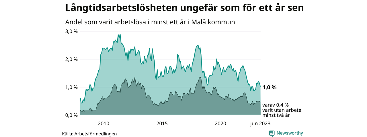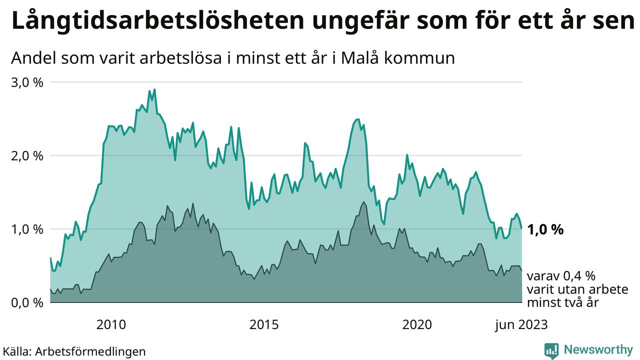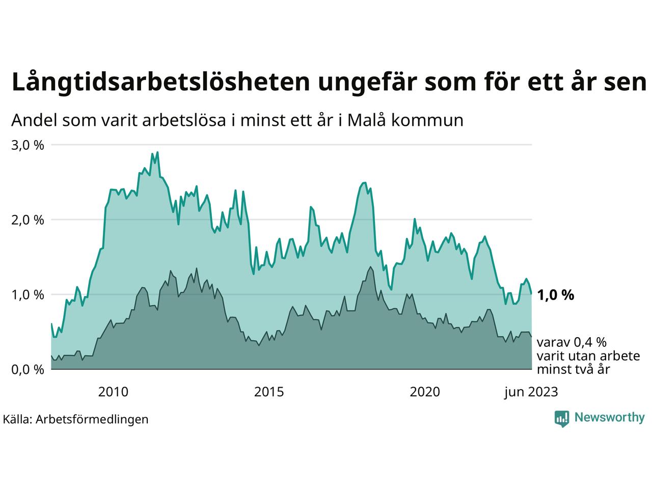 Andelen som varit utan arbete i minst ett år i Malå var ungefär lika stor i juni jämfört med samma månad för ett år sedan. Det visar Arbetsfömedlingens senaste månadsstatistik.