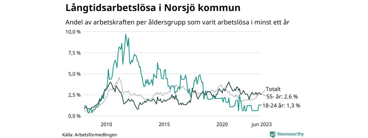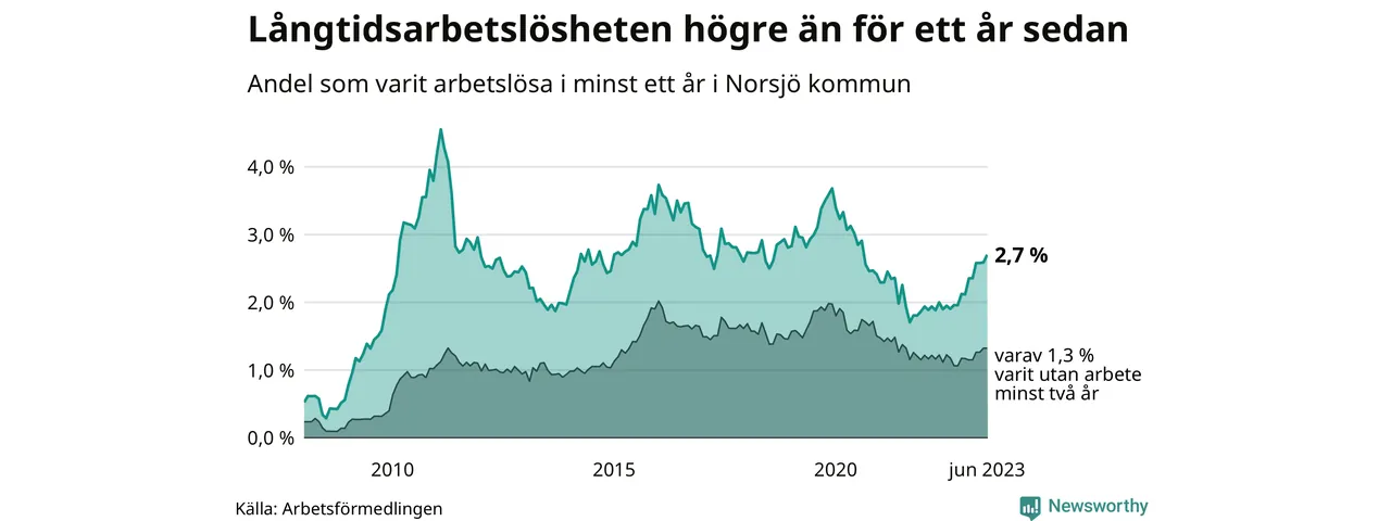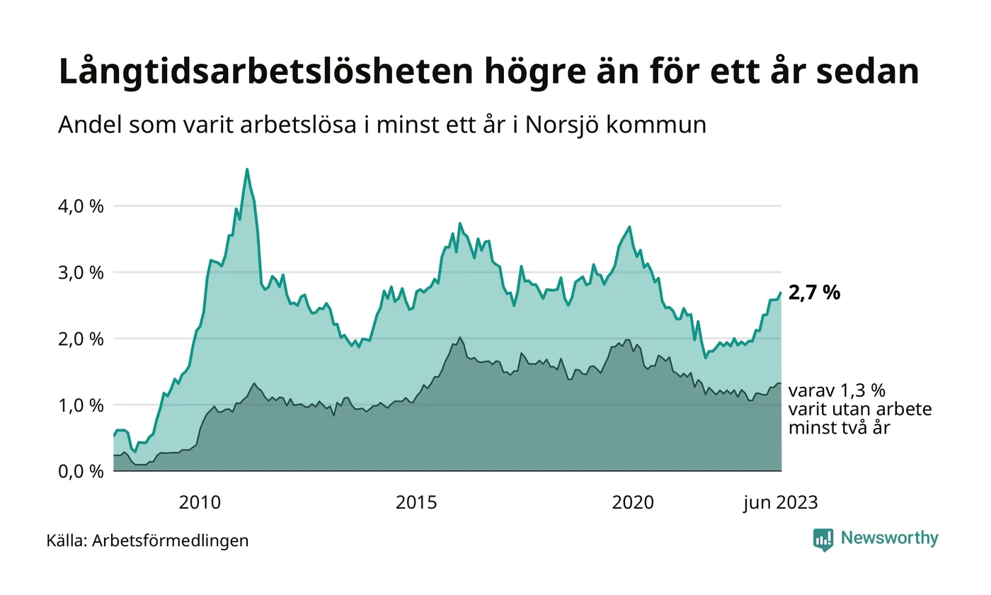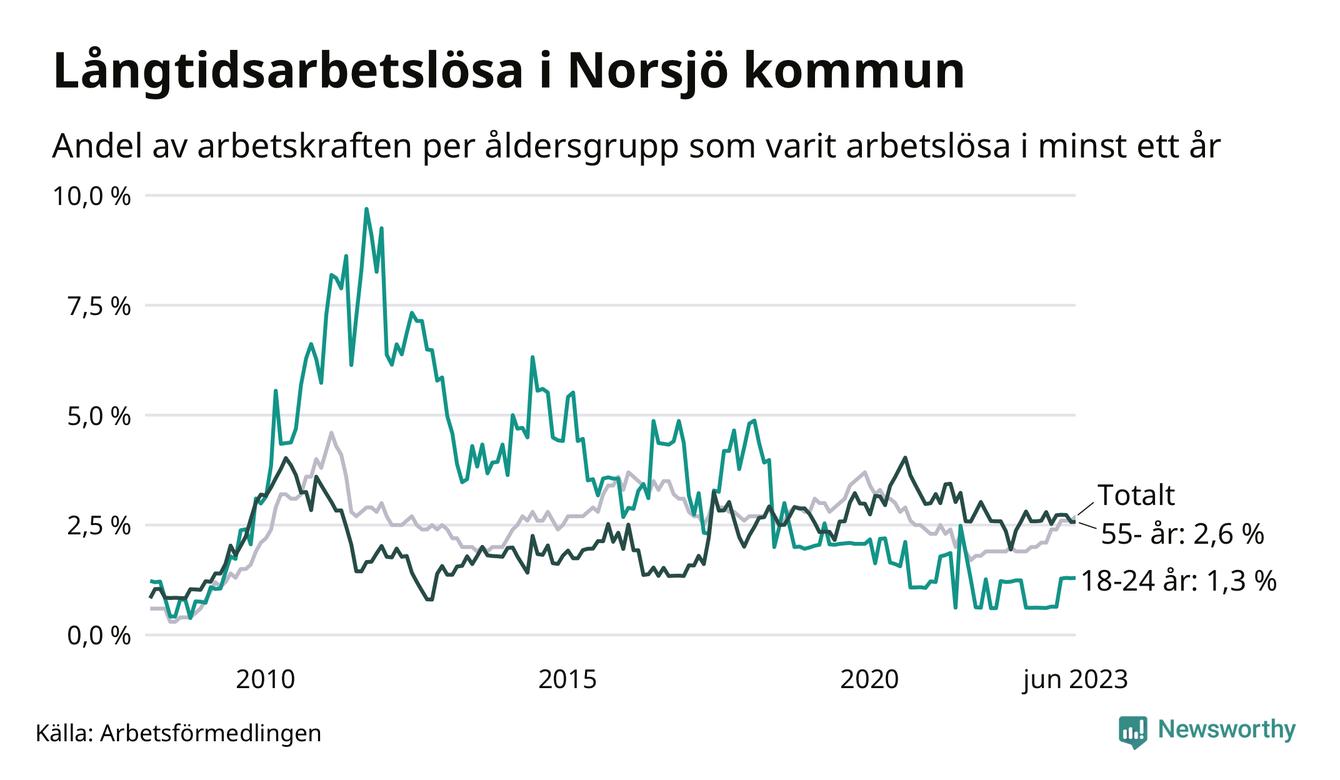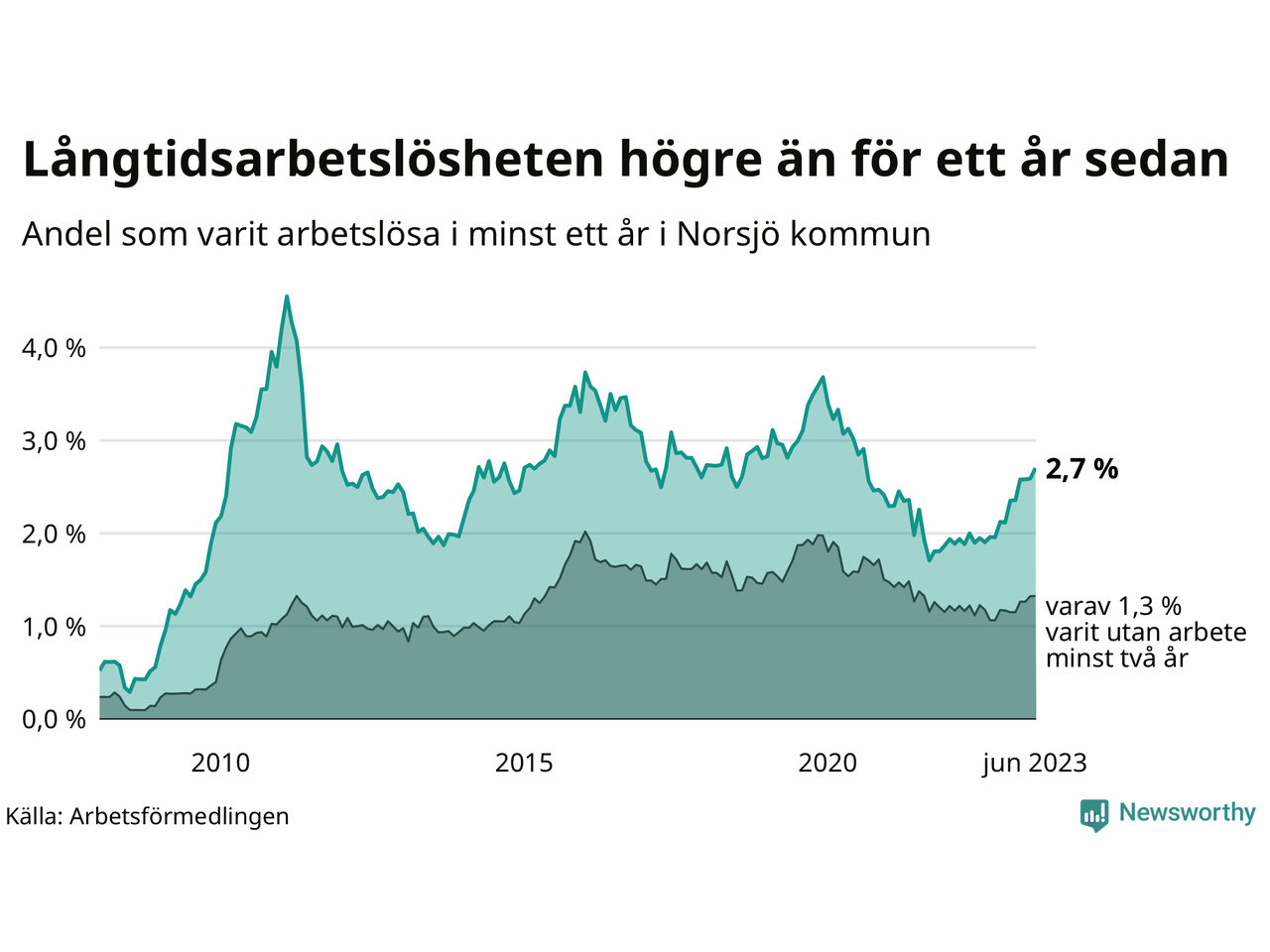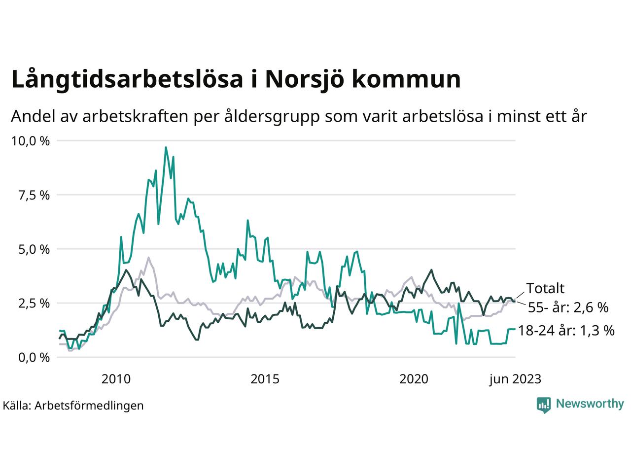 I juni hade 49 Norsjöbor varit arbetslösa i minst ett år, vilket är två fler än månaden innan. 49 personer motsvarar 2,7 procent av arbetskraften i kommunen – andelen långtidsarbetslösa är 0,8 procentenheter högre än samma månad för ett år sedan.