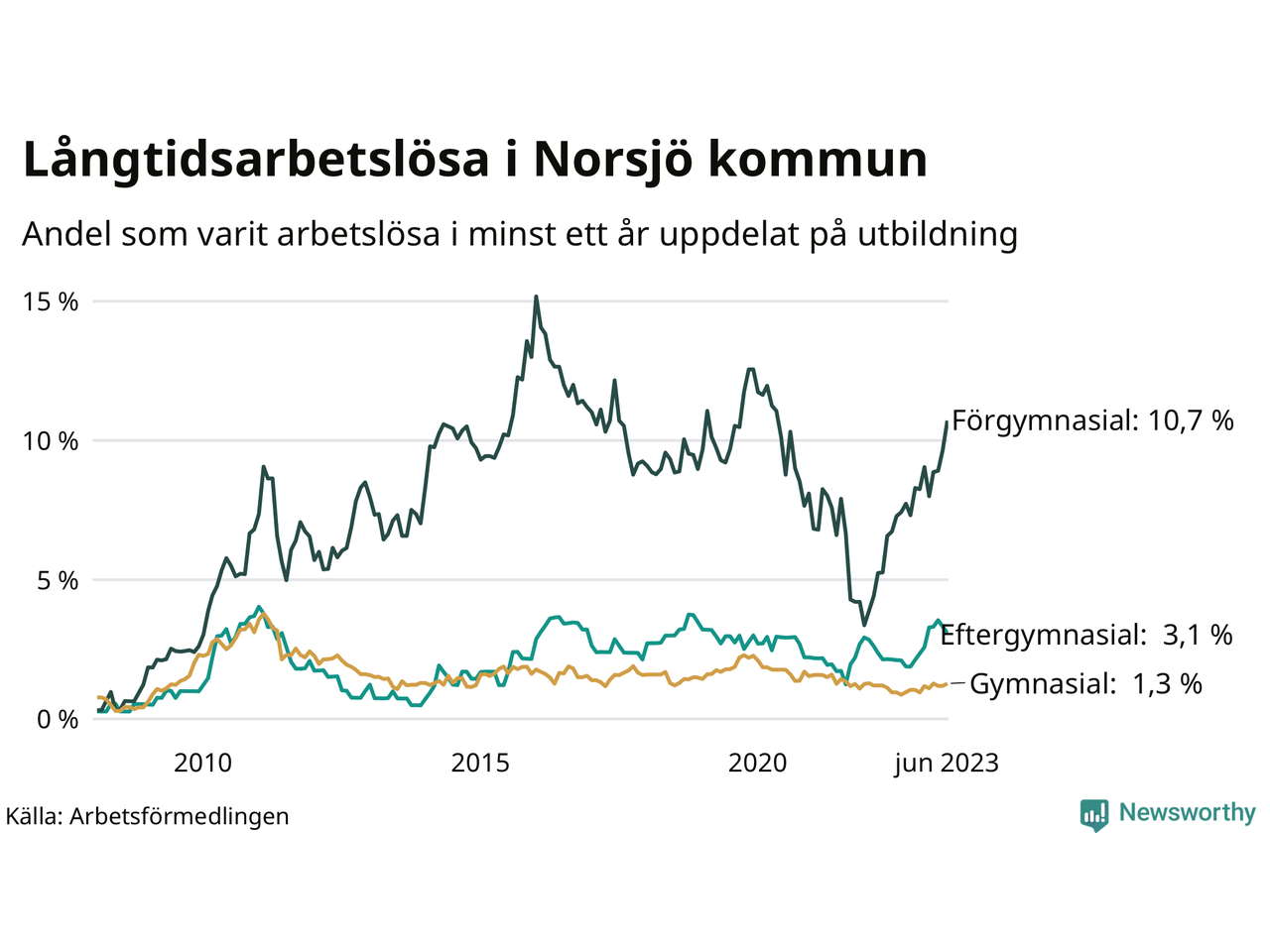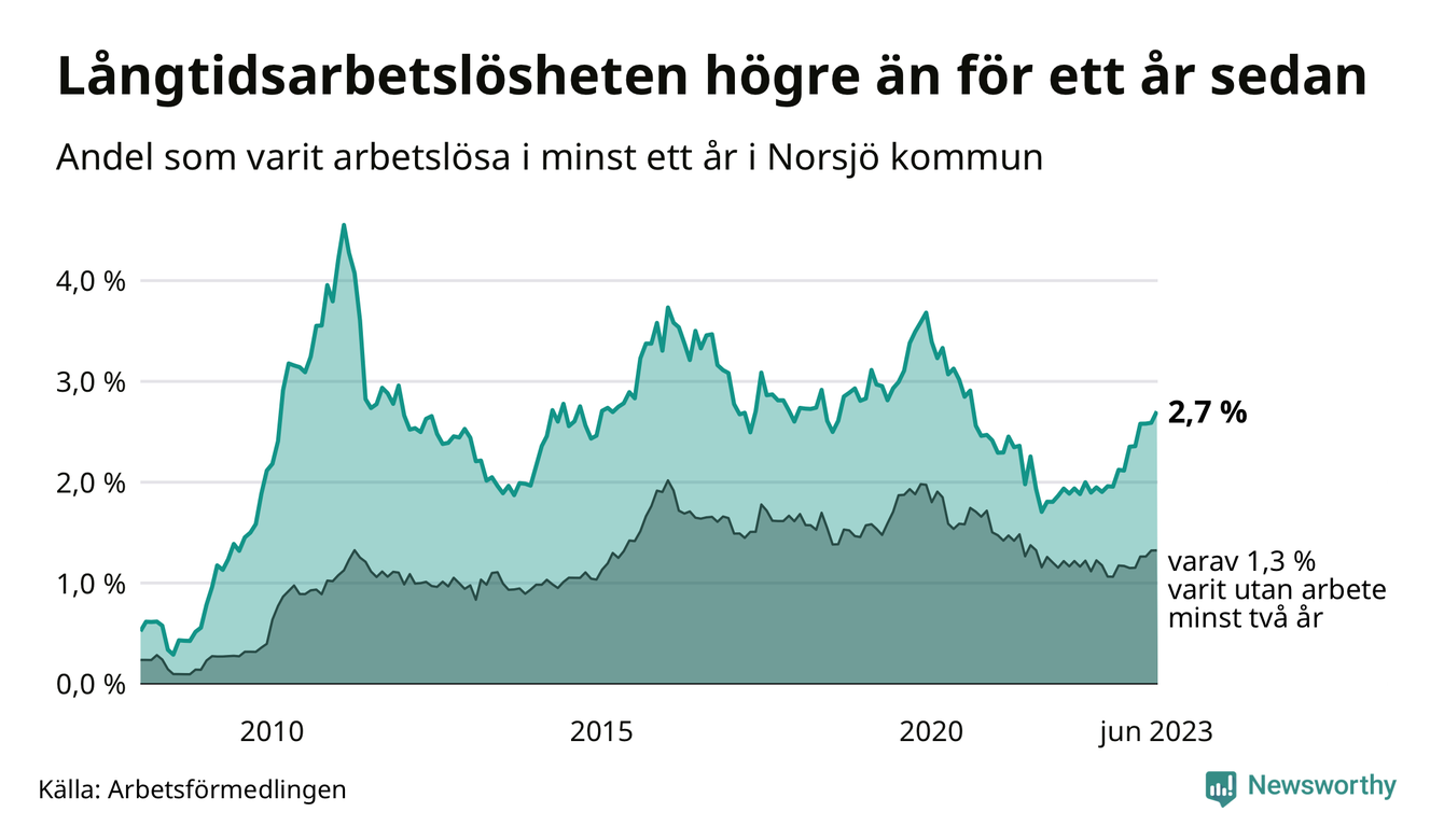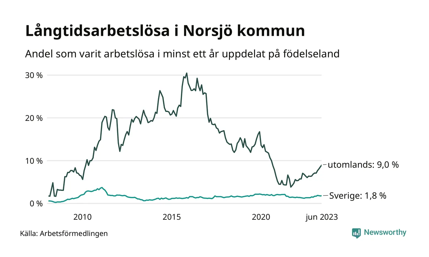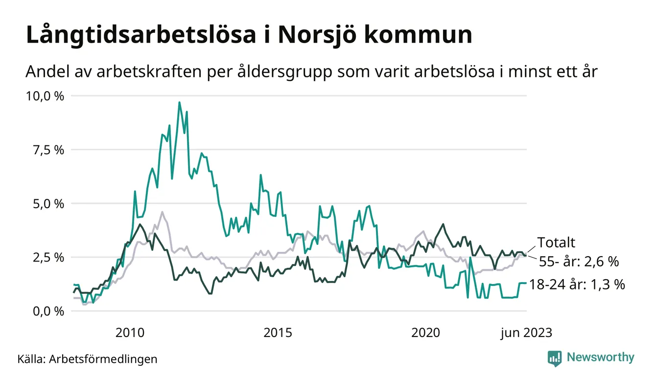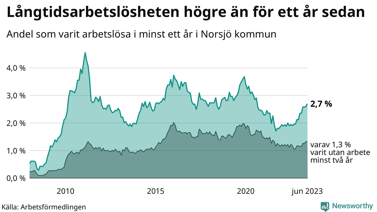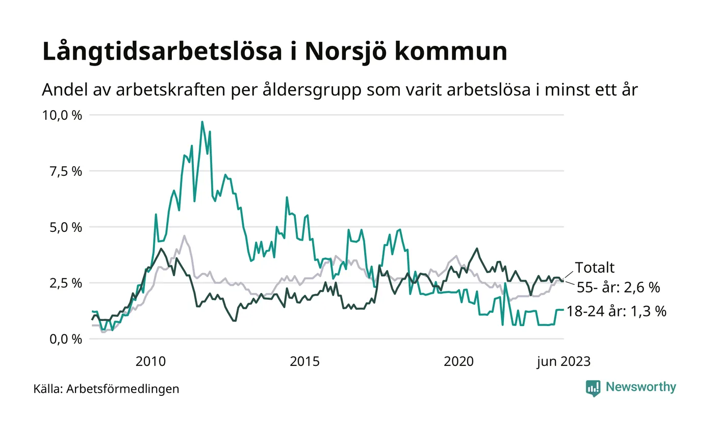 I juni hade 49 Norsjöbor varit arbetslösa i minst ett år, vilket är två fler än månaden innan. 49 personer motsvarar 2,7 procent av arbetskraften i kommunen – andelen långtidsarbetslösa är 0,8 procentenheter högre än samma månad för ett år sedan.