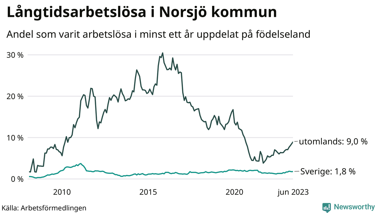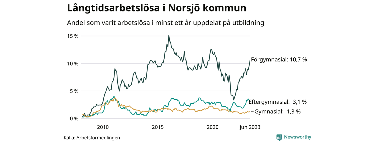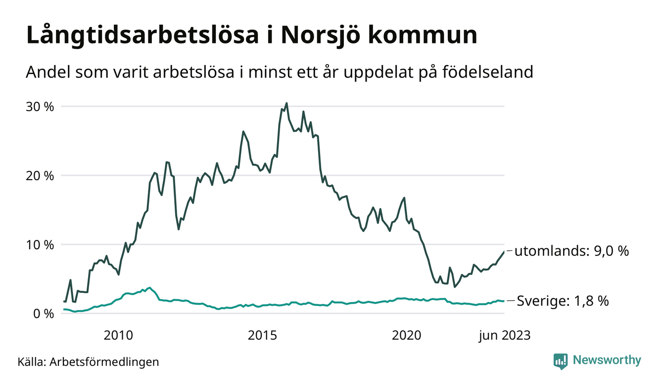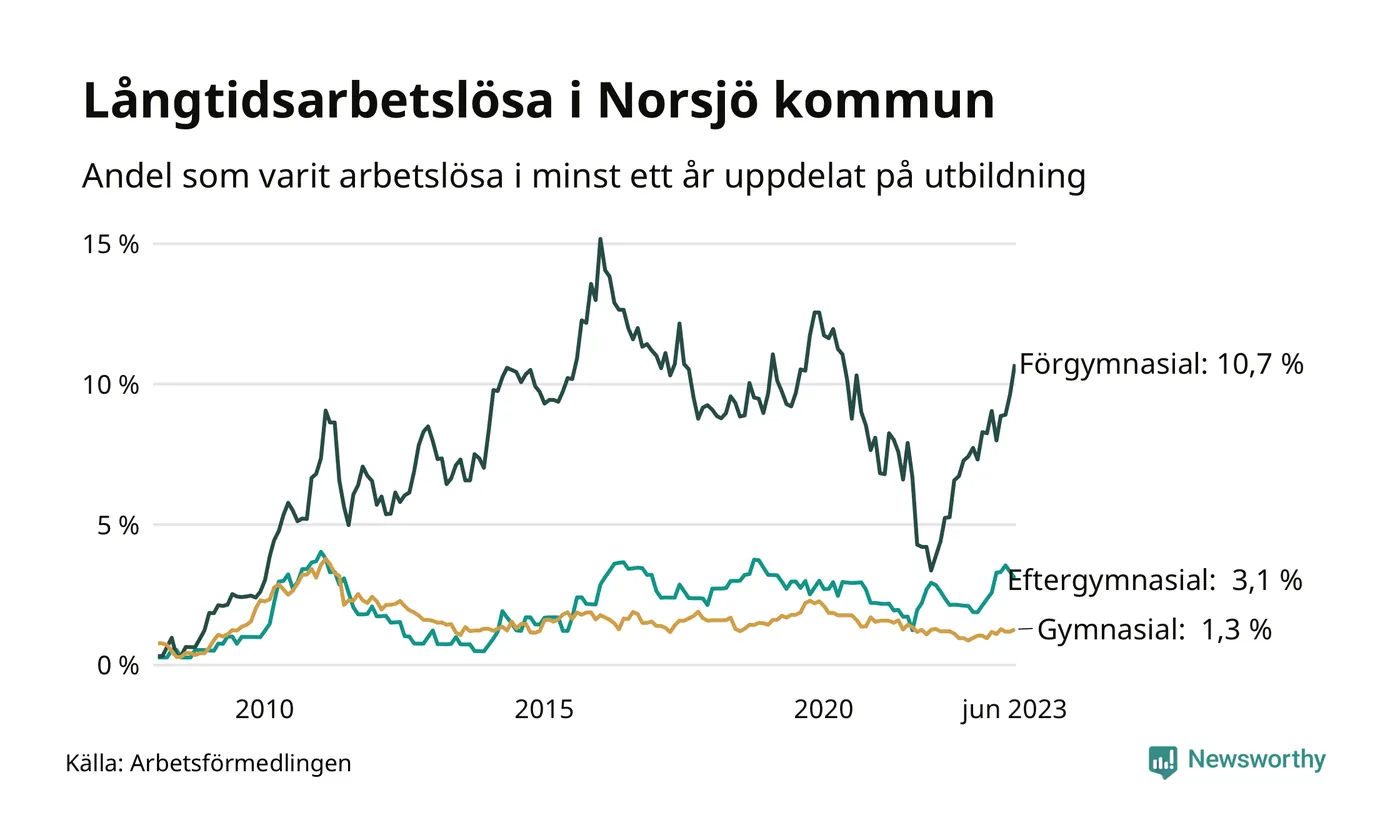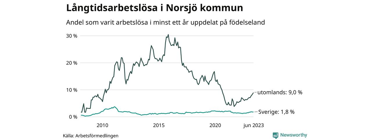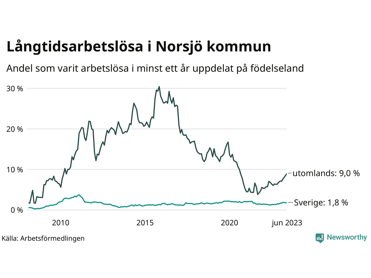I juni hade 49 Norsjöbor varit arbetslösa i minst ett år, vilket är två fler än månaden innan. 49 personer motsvarar 2,7 procent av arbetskraften i kommunen – andelen långtidsarbetslösa är 0,8 procentenheter högre än samma månad för ett år sedan.