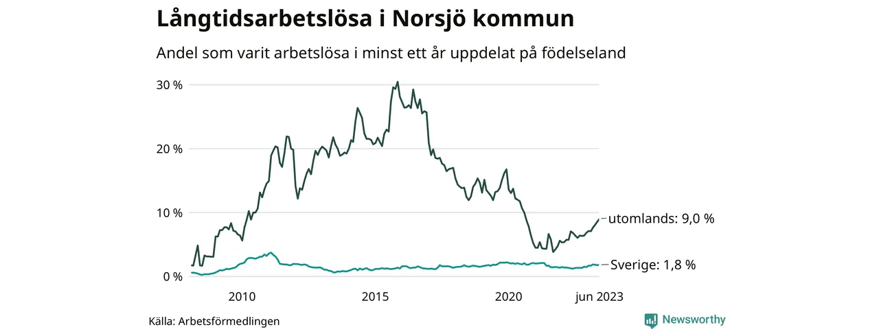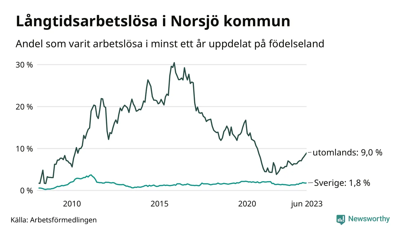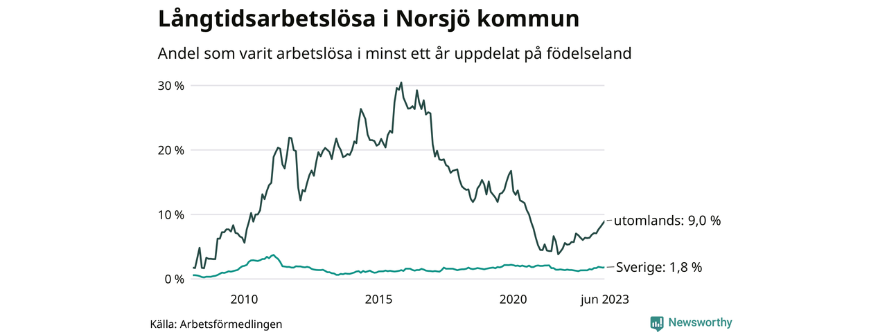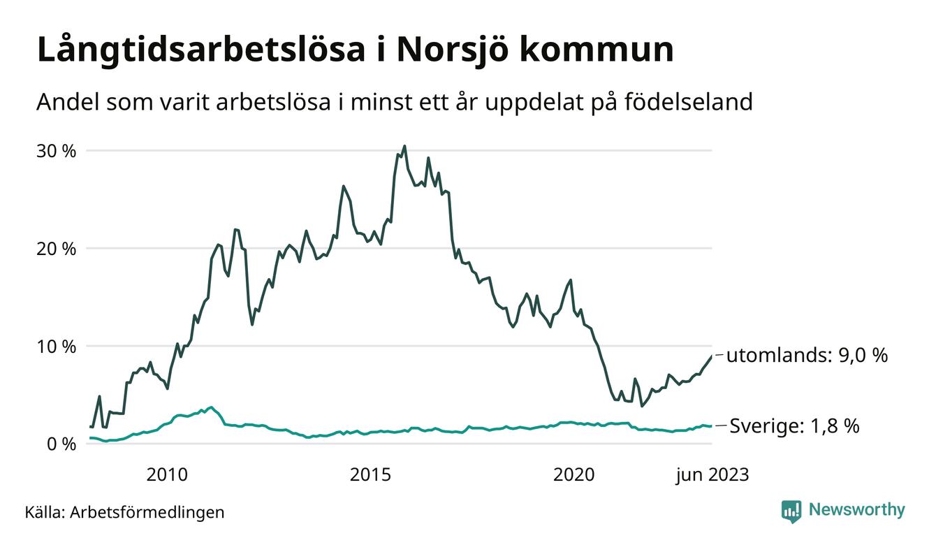 29 av de långtidsarbetslösa i Norsjö är födda i Sverige, medan 20 är födda utomlands. Det innebär att långtidsarbetslösheten bland Sverigefödda är 1,8 procent, medan den är fem gånger så hög – 9,0 procent – bland födda utomlands. Även i riket som helhet är arbetslösheten högre bland utrikesfödda.