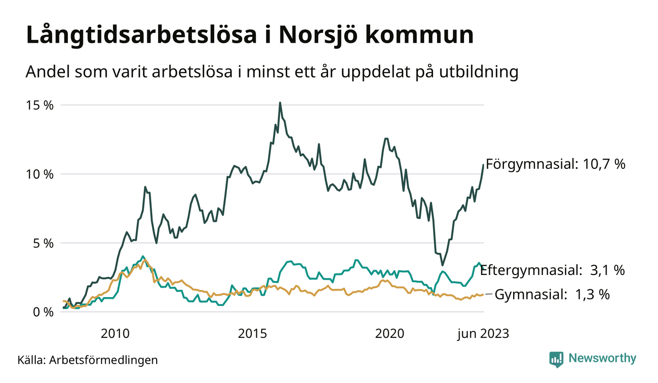 Inte sedan augusti 2020 har andelen långtidsarbetslösa varit så hög i Norsjö. Det visar Arbetsförmedlingens senaste månadsstatistik.