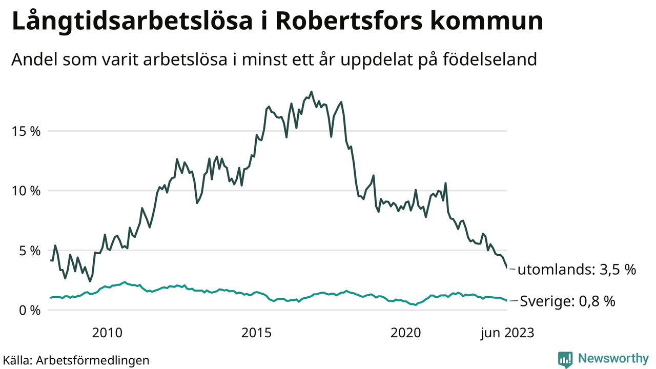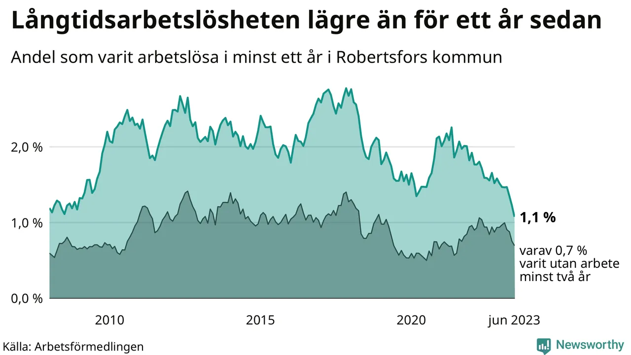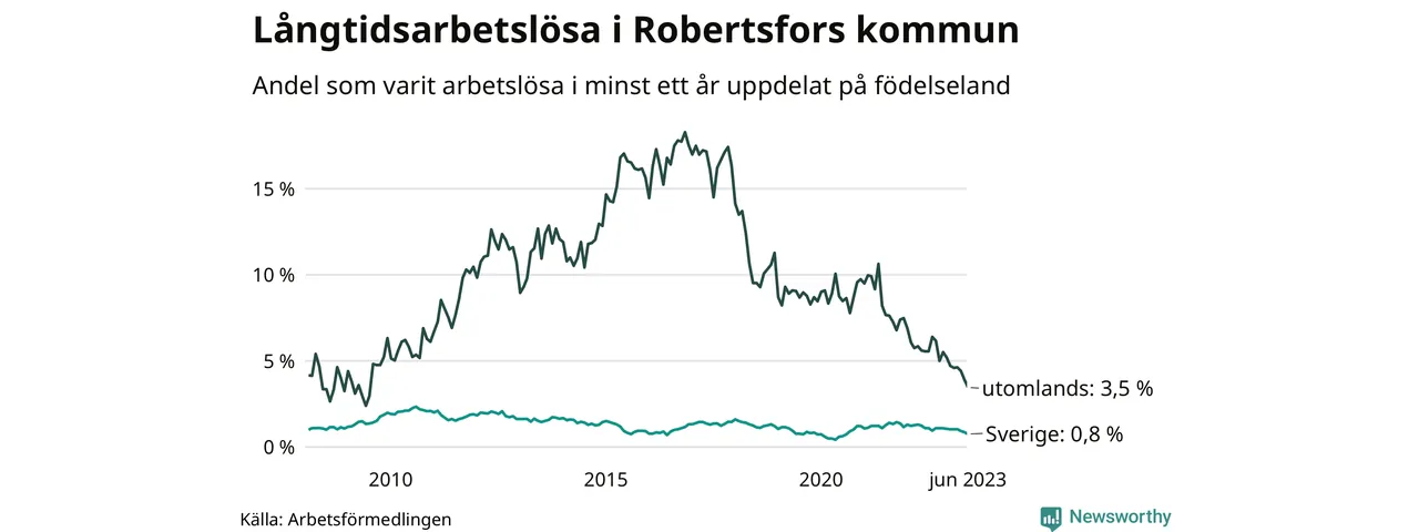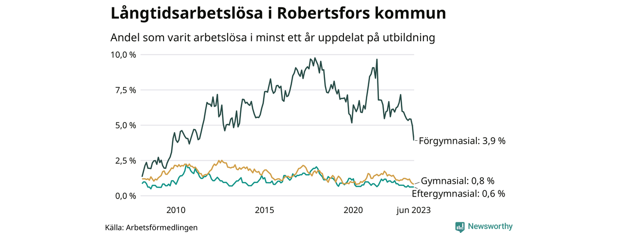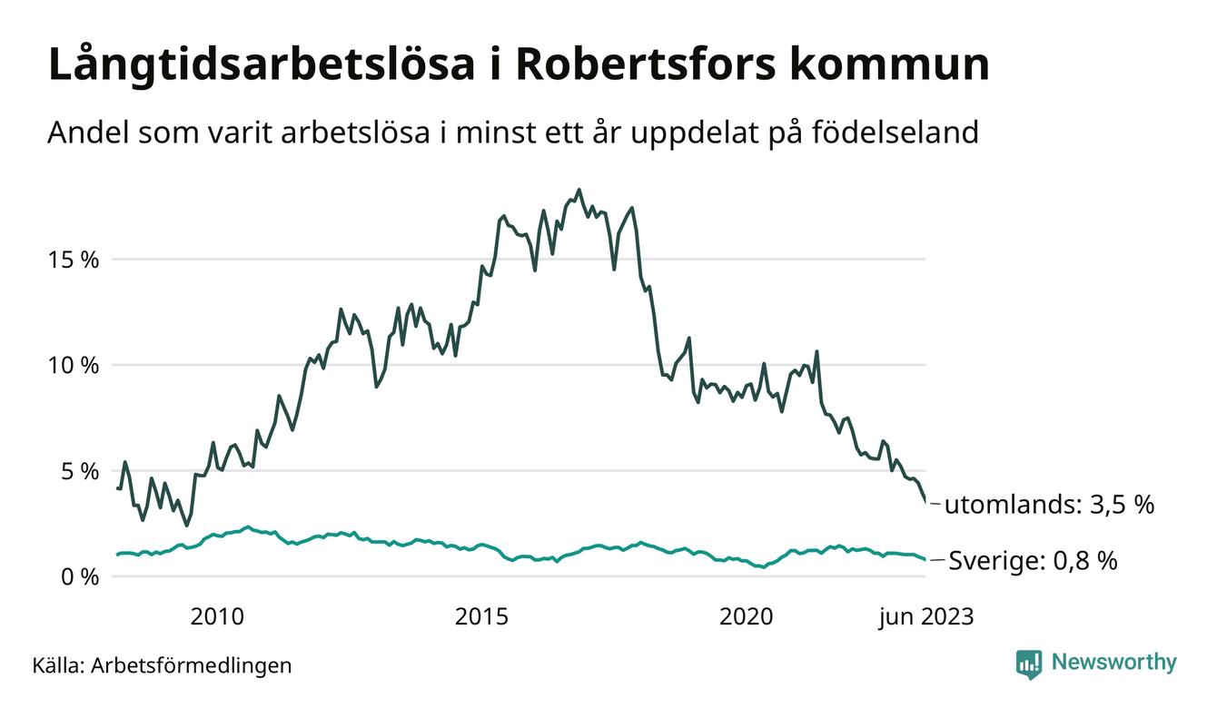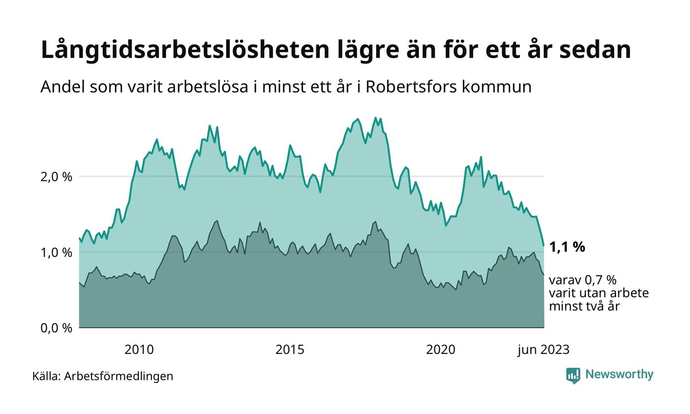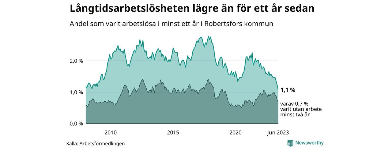 I juni hade 34 Robertsforsbor varit arbetslösa i minst ett år, vilket är fem färre än månaden innan. 34 personer motsvarar 1,1 procent av arbetskraften i kommunen – andelen långtidsarbetslösa är 0,5 procentenheter lägre än samma månad för ett år sedan. Det är också den den lägsta andelen långtidsarbetslösa under de senaste 15 åren.