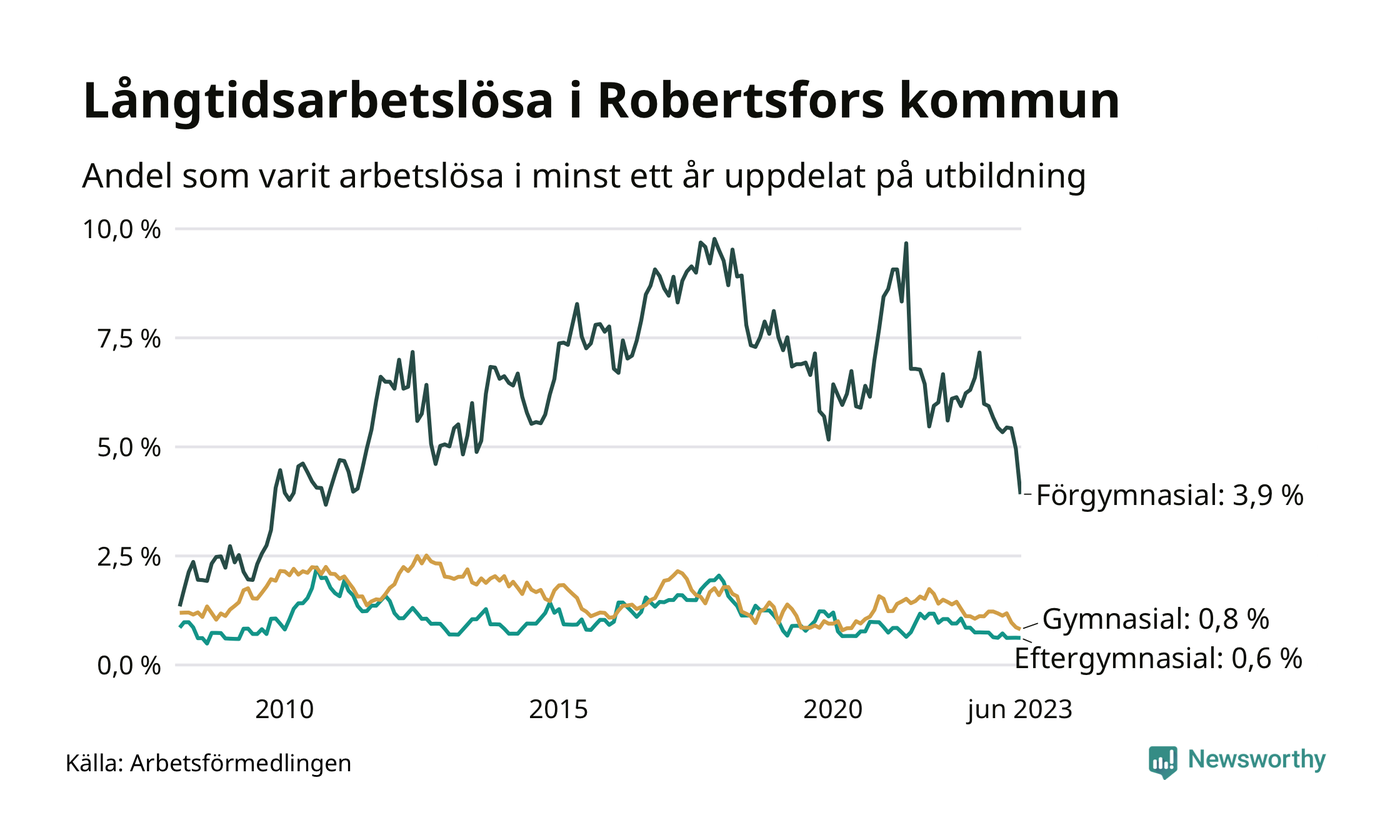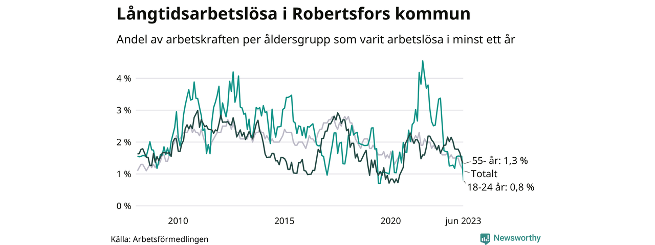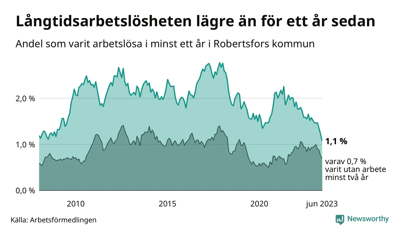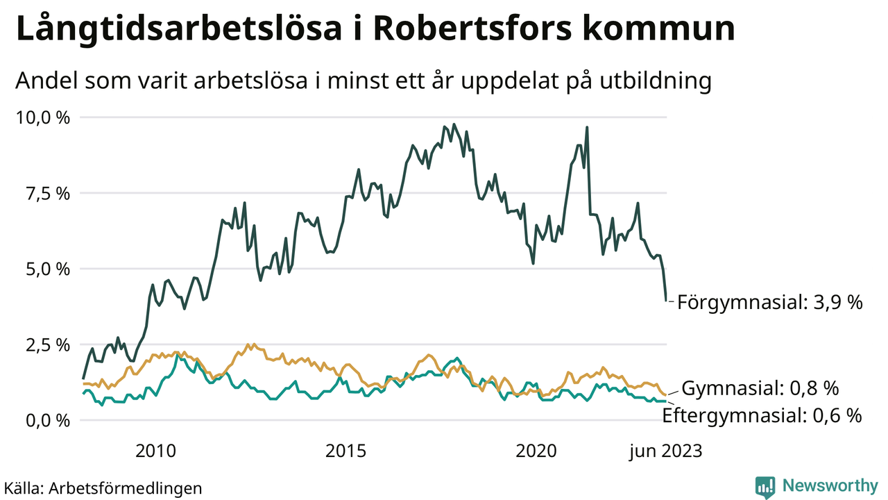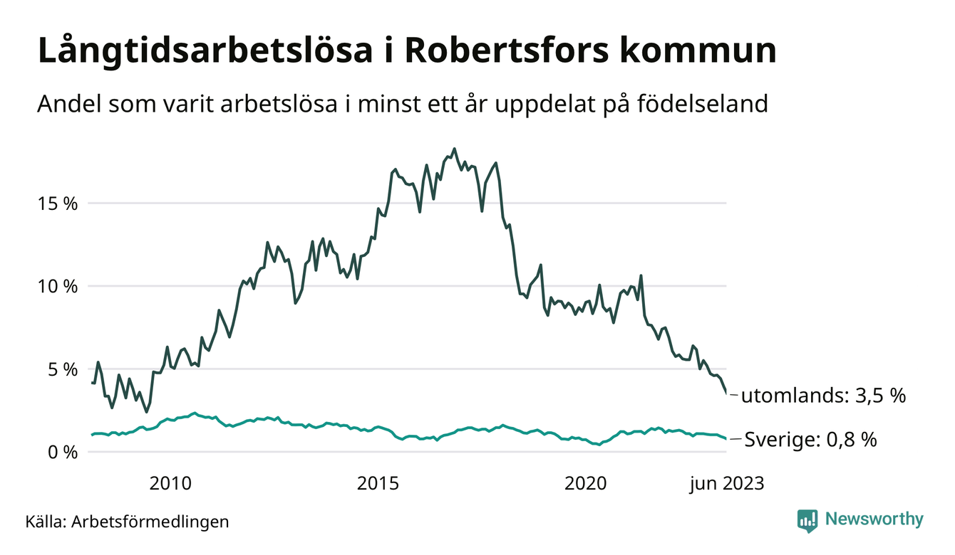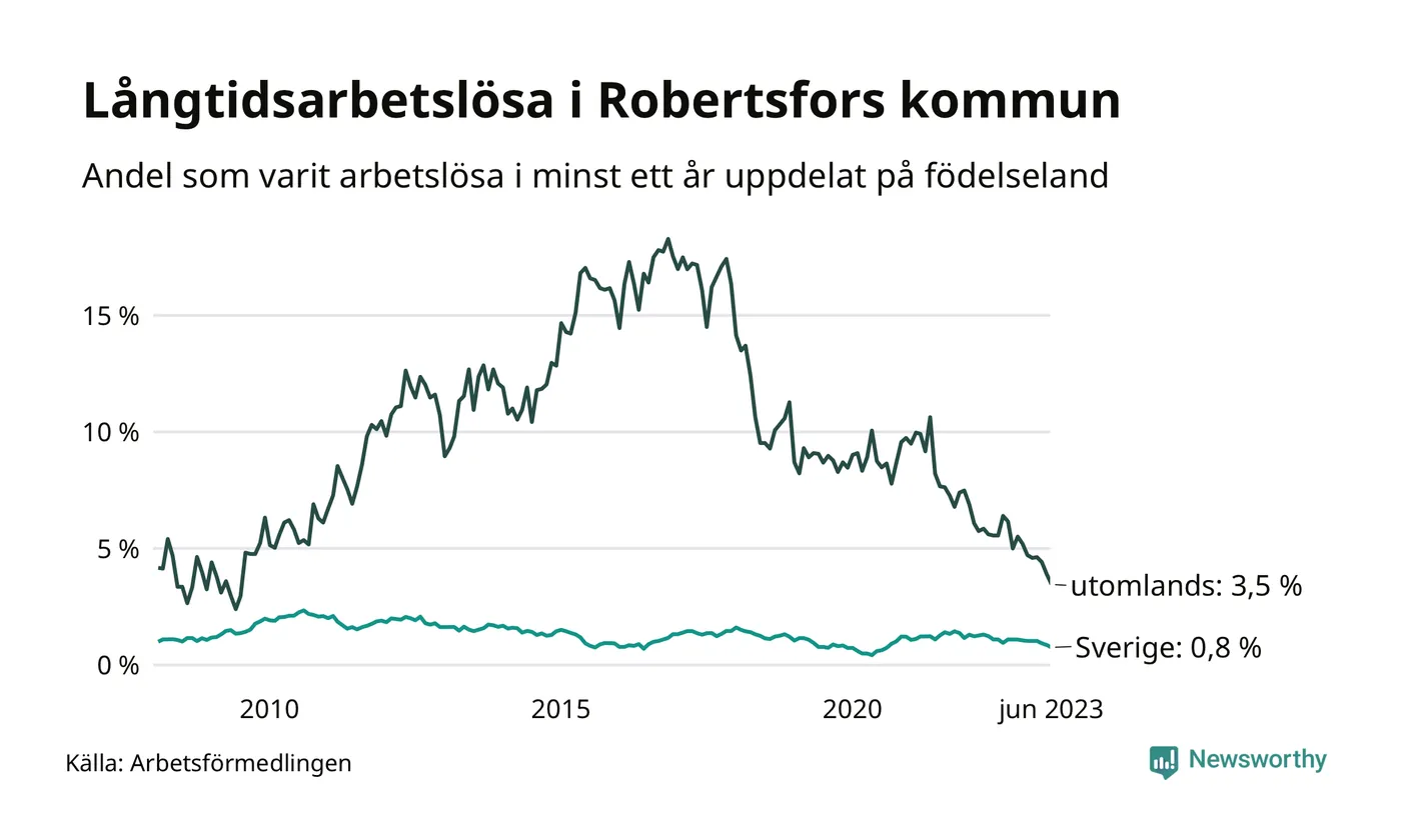 I juni hade 34 Robertsforsbor varit arbetslösa i minst ett år, vilket är fem färre än månaden innan. 34 personer motsvarar 1,1 procent av arbetskraften i kommunen – andelen långtidsarbetslösa är 0,5 procentenheter lägre än samma månad för ett år sedan. Det är också den den lägsta andelen långtidsarbetslösa under de senaste 15 åren.