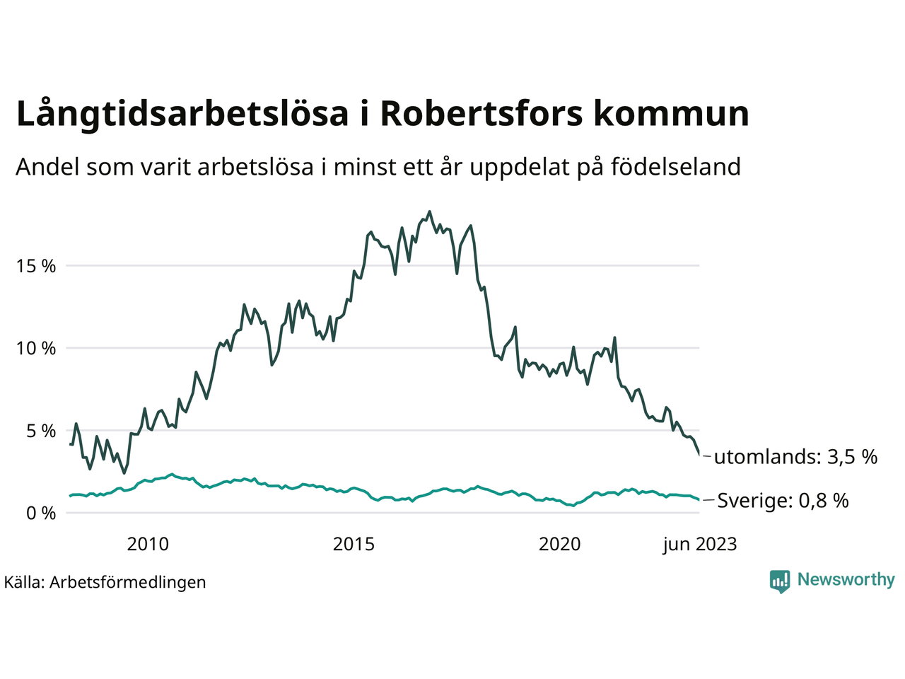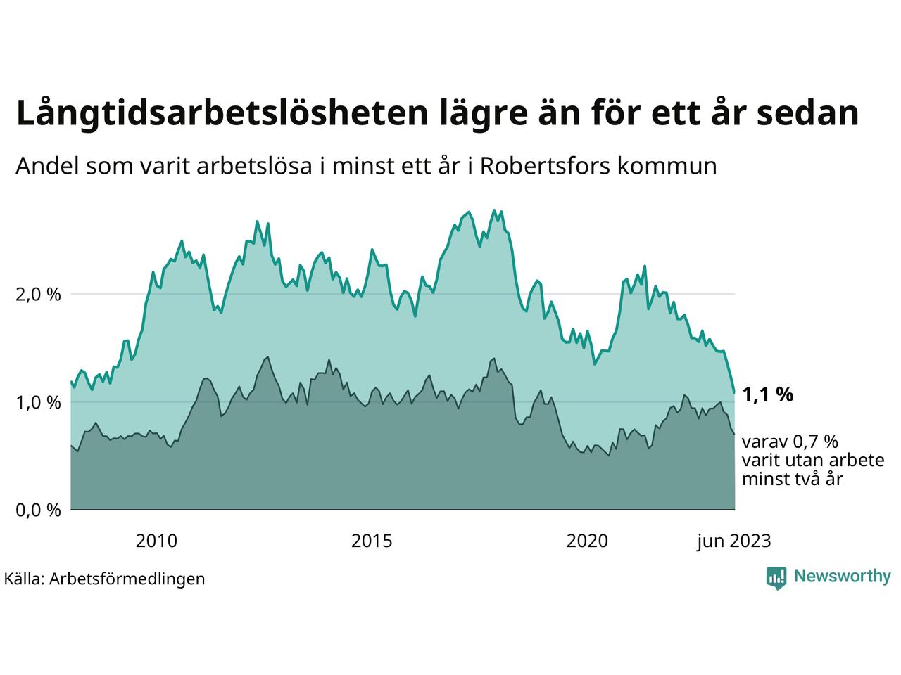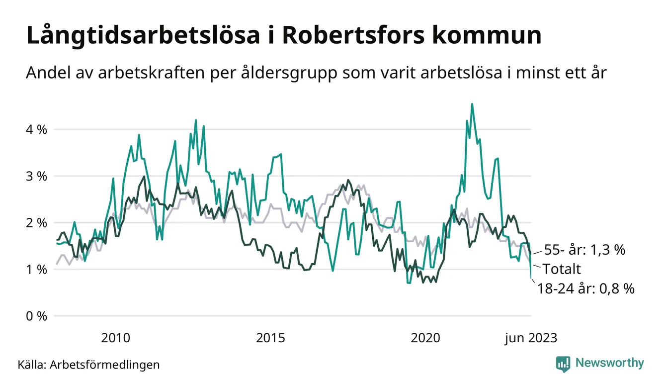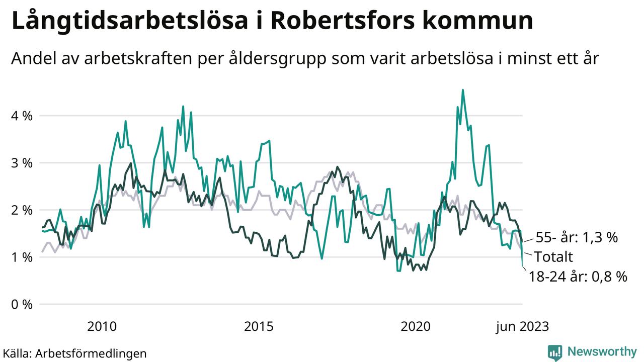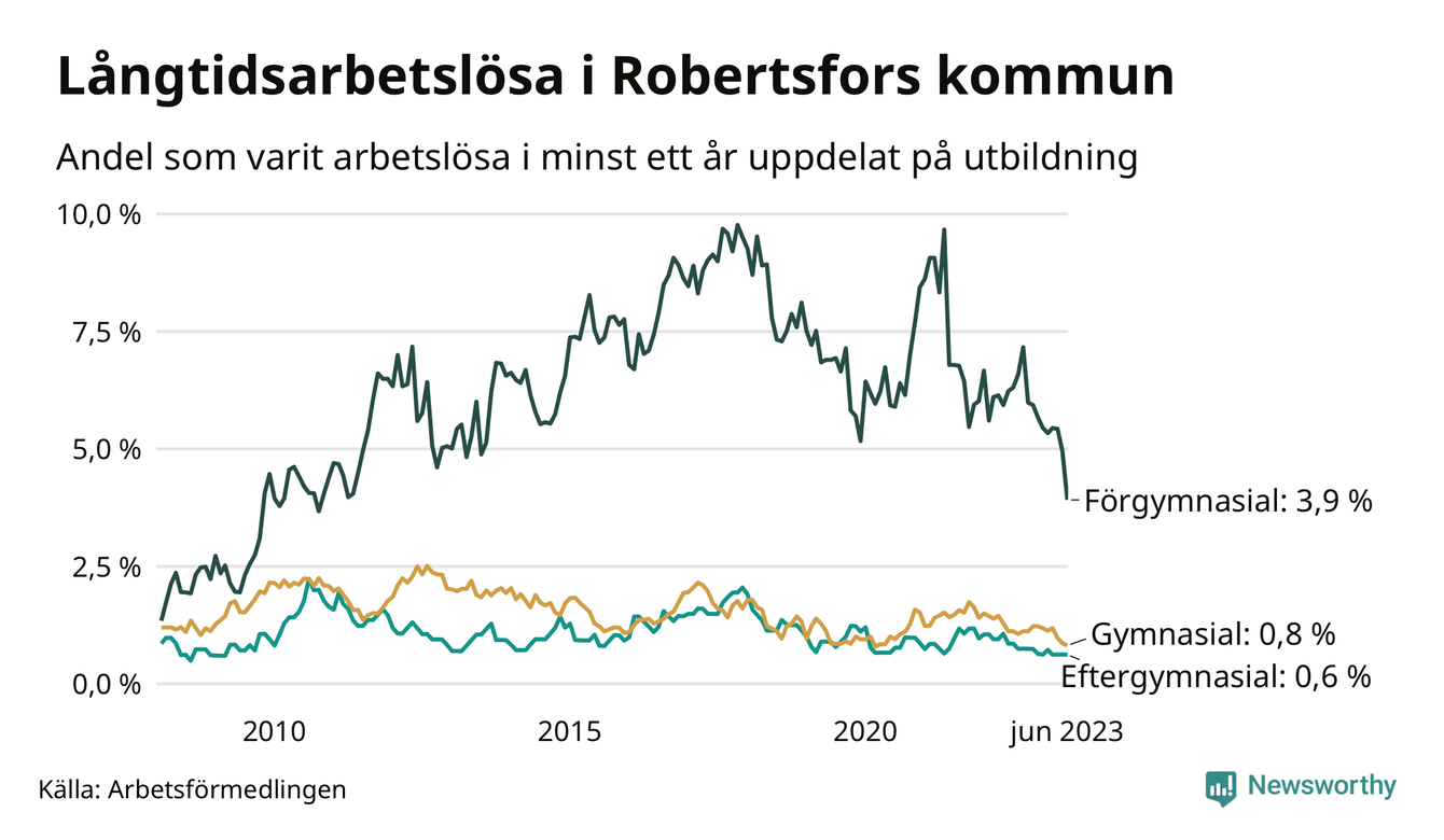 I juni hade 34 Robertsforsbor varit arbetslösa i minst ett år, vilket är fem färre än månaden innan. 34 personer motsvarar 1,1 procent av arbetskraften i kommunen – andelen långtidsarbetslösa är 0,5 procentenheter lägre än samma månad för ett år sedan. Det är också den den lägsta andelen långtidsarbetslösa under de senaste 15 åren.