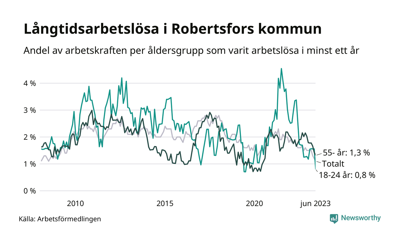 Av de 34 personerna som varit arbetslösa i mer än ett år i Robertsfors kommun är elva personer mellan 55 och 651 år och två är mellan 18 och 24 år. För den äldre gruppen är andelen arbetslösa 1,3 procent medan den i den yngre gruppen är 0,8 procent. Även i riket som helhet är långtidsarbetslösheten högre i gruppen äldre.