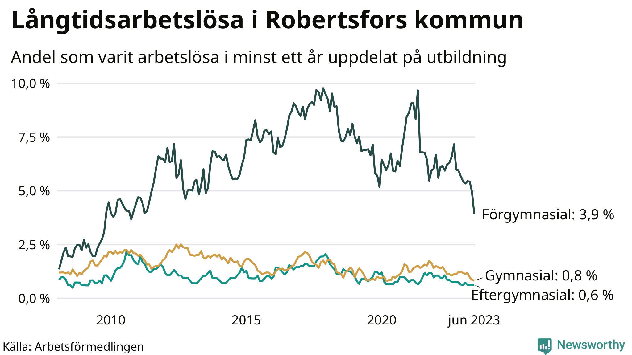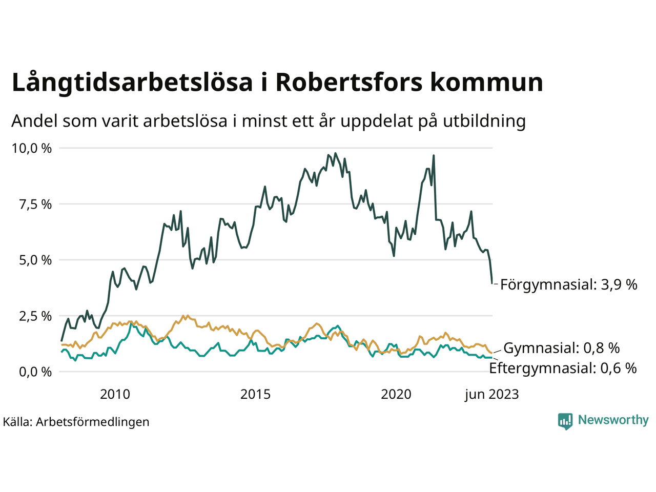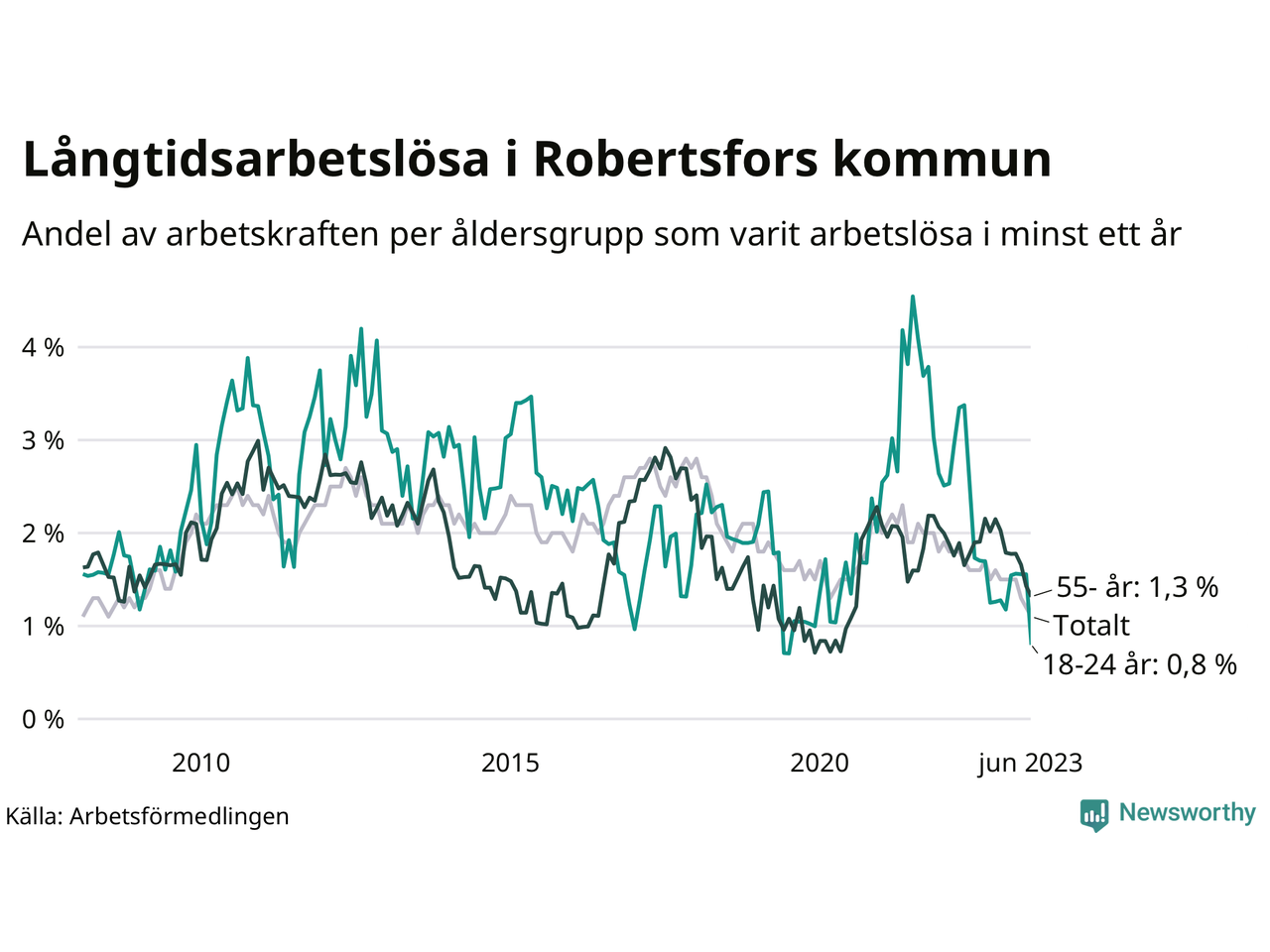 | Andel arbetslösa i minst två år | 0,7 % | 0,8 % | 1,6 % |