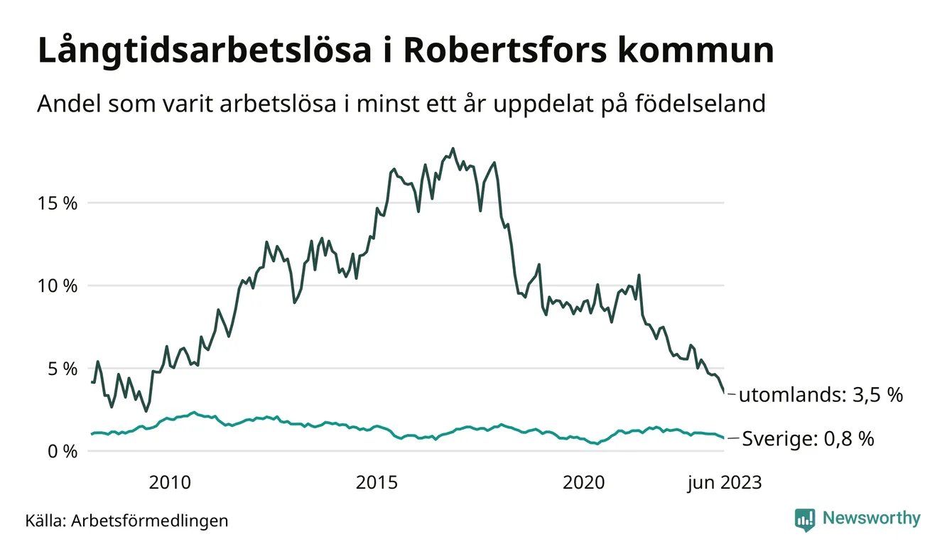 21 av de långtidsarbetslösa i Robertsfors är födda i Sverige, medan 13 är födda utomlands. Det innebär att långtidsarbetslösheten bland Sverigefödda är 0,8 procent, medan den är fyra gånger så hög – 3,5 procent – bland födda utomlands. Även i riket som helhet är arbetslösheten högre bland utrikesfödda.