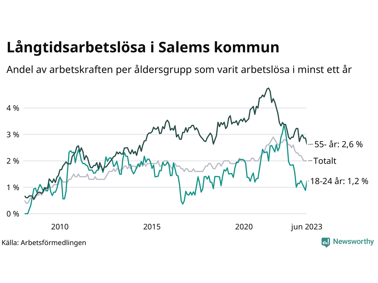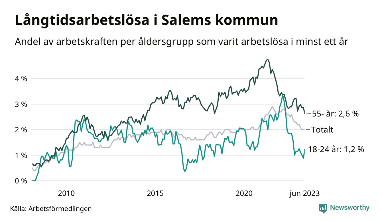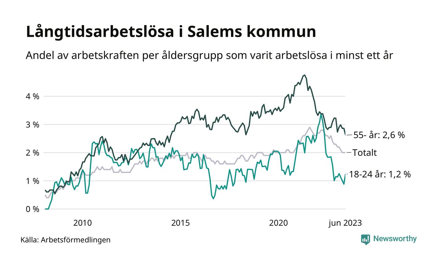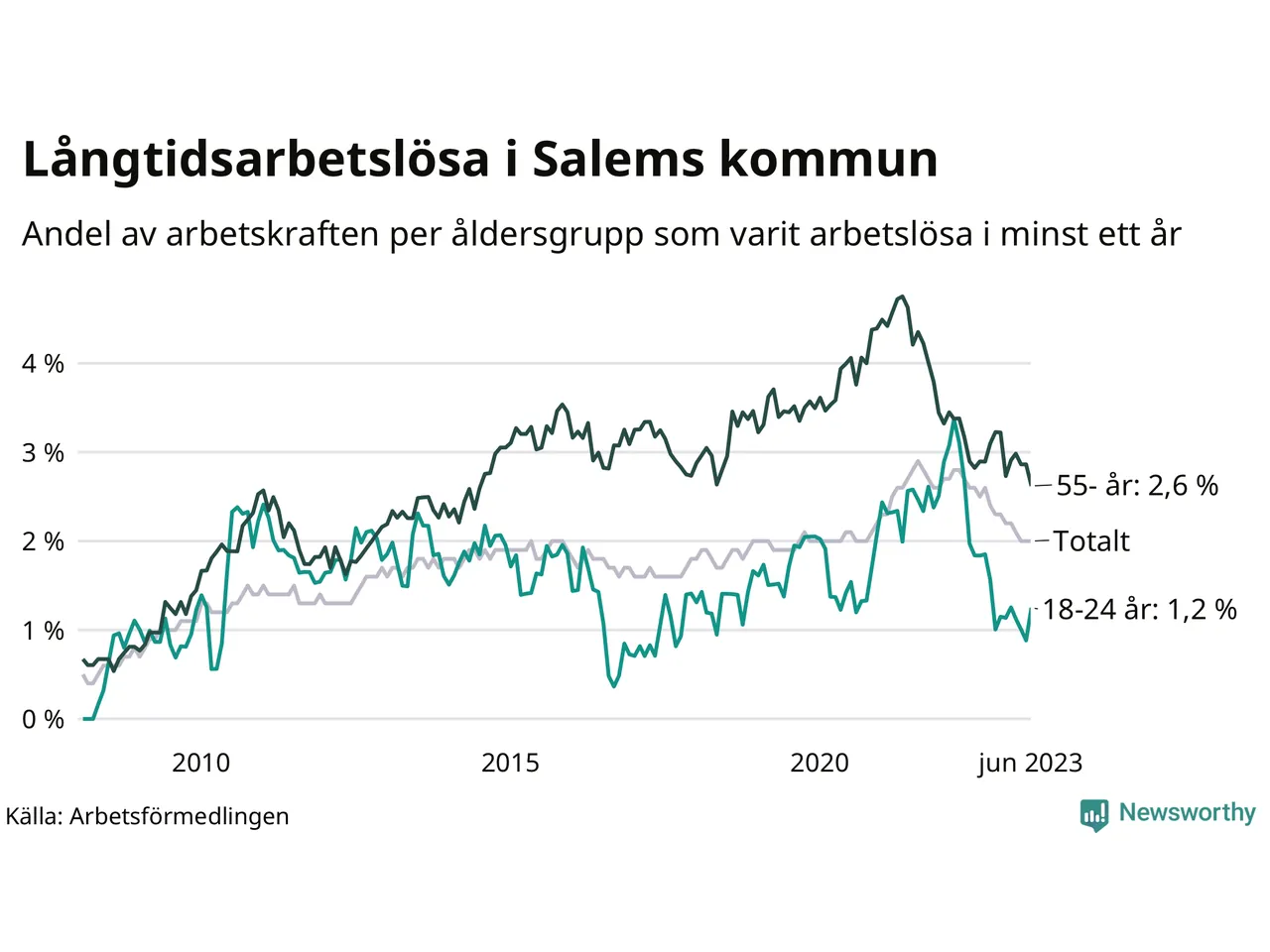 Av de 172 personerna som varit arbetslösa i mer än ett år i Salems kommun är 42 personer mellan 55 och 651 år och tio är mellan 18 och 24 år. För den äldre gruppen är andelen arbetslösa 2,6 procent medan den i den yngre gruppen är 1,3 procent. Även i riket som helhet är långtidsarbetslösheten högre i gruppen äldre.