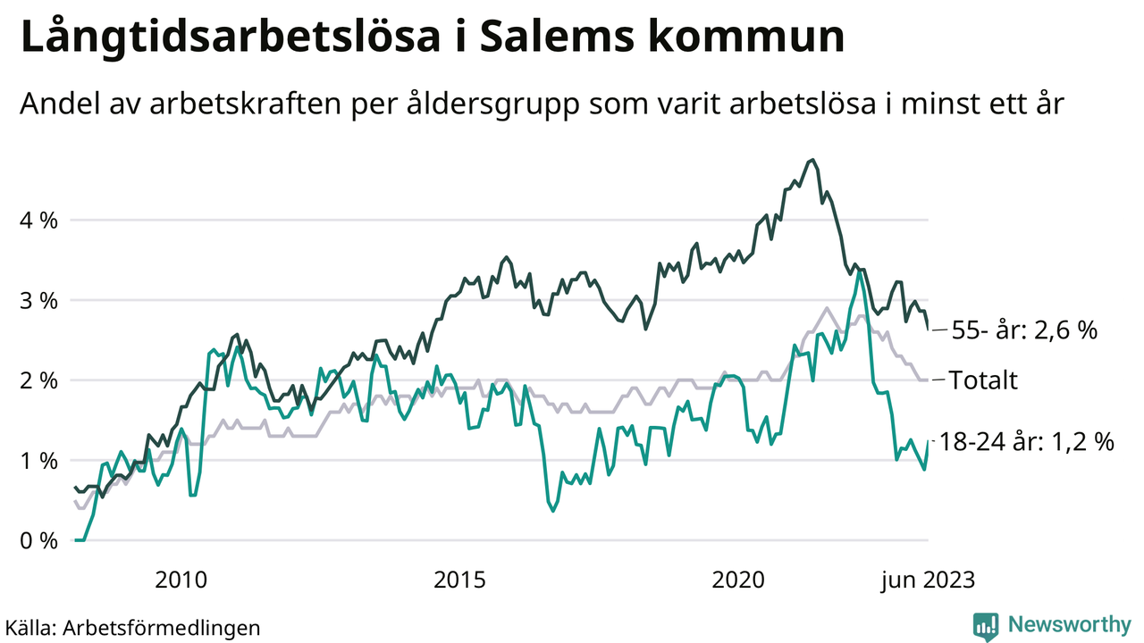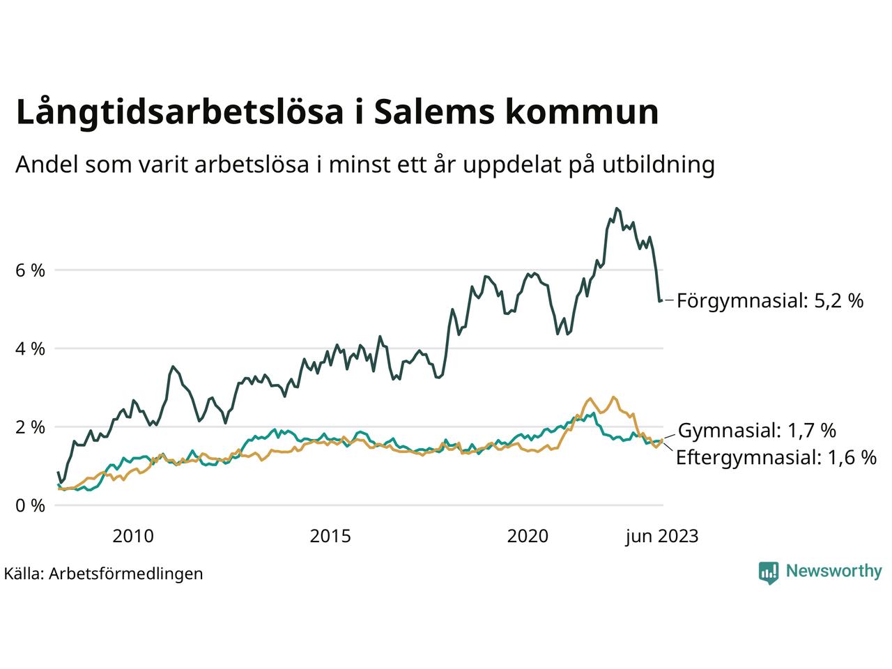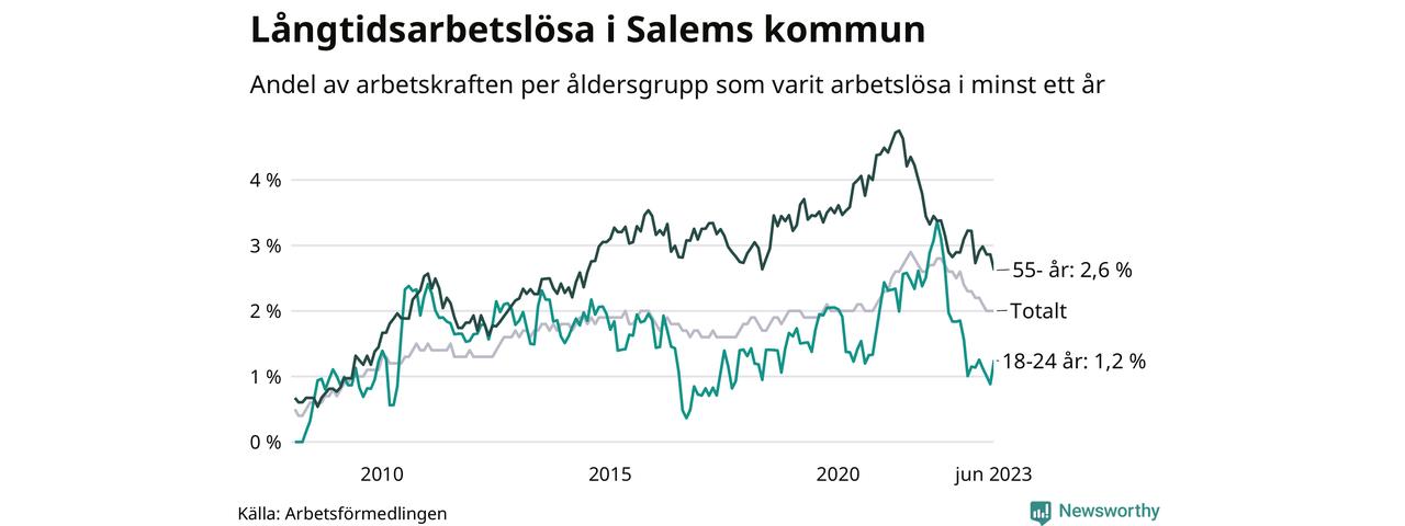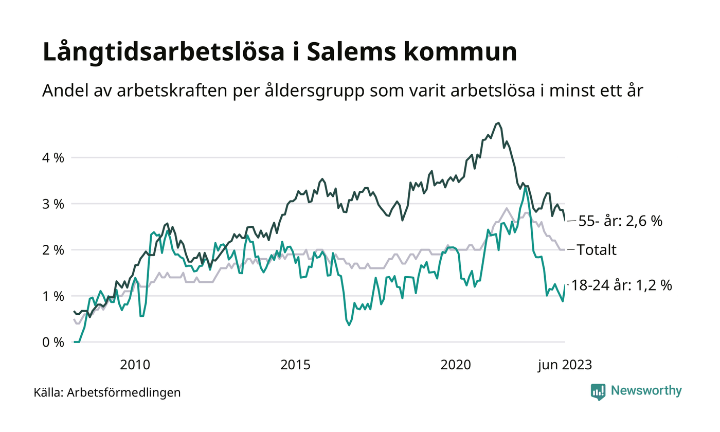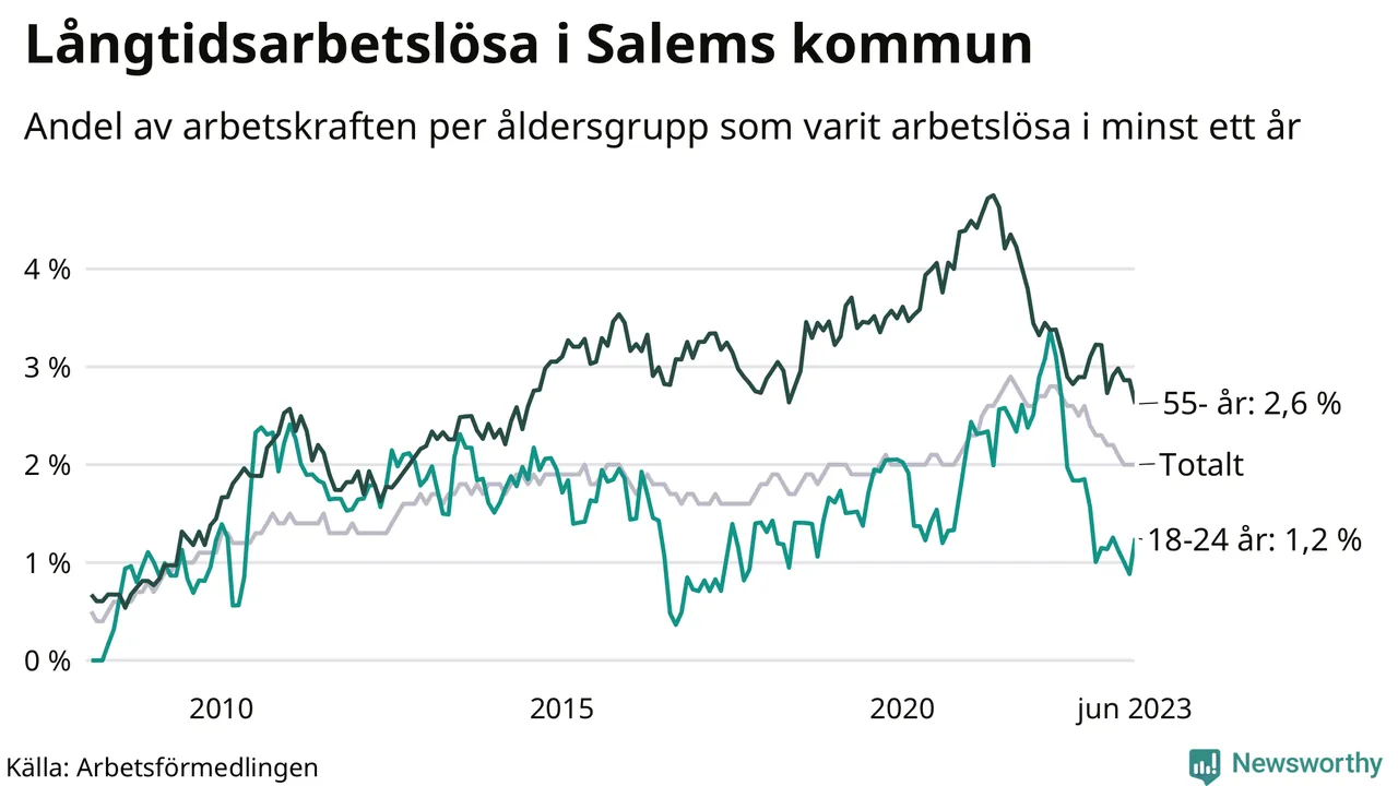 Av de 172 personerna som varit arbetslösa i mer än ett år i Salems kommun är 42 personer mellan 55 och 651 år och tio är mellan 18 och 24 år. För den äldre gruppen är andelen arbetslösa 2,6 procent medan den i den yngre gruppen är 1,3 procent. Även i riket som helhet är långtidsarbetslösheten högre i gruppen äldre.