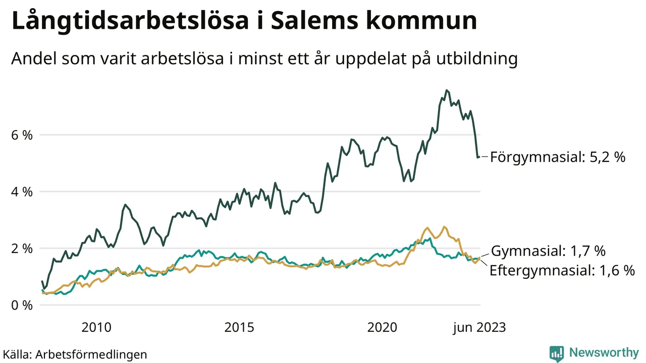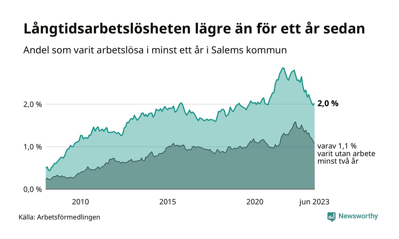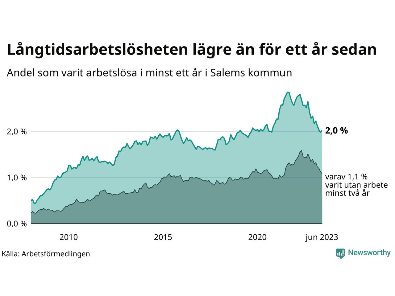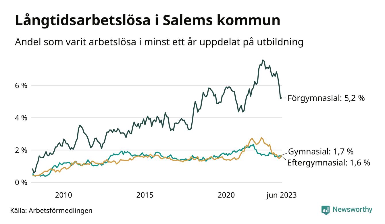 Av de 172 personerna som varit arbetslösa i mer än ett år i Salems kommun är 42 personer mellan 55 och 651 år och tio är mellan 18 och 24 år. För den äldre gruppen är andelen arbetslösa 2,6 procent medan den i den yngre gruppen är 1,3 procent. Även i riket som helhet är långtidsarbetslösheten högre i gruppen äldre.