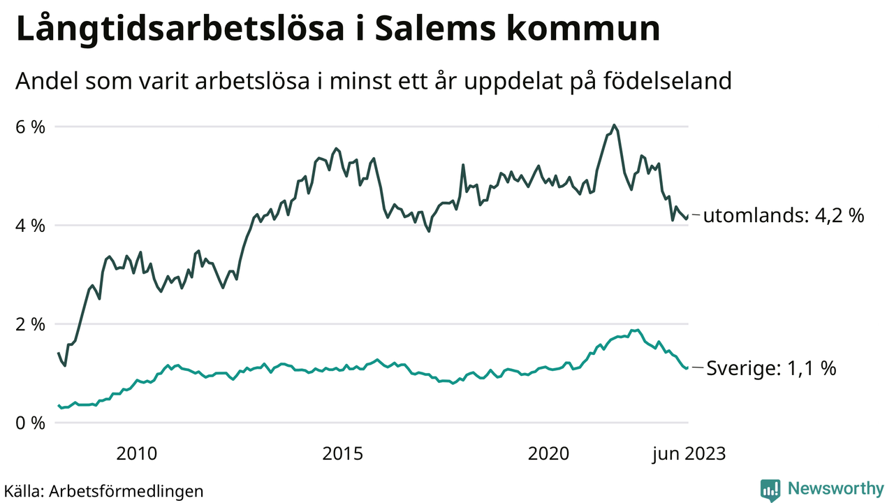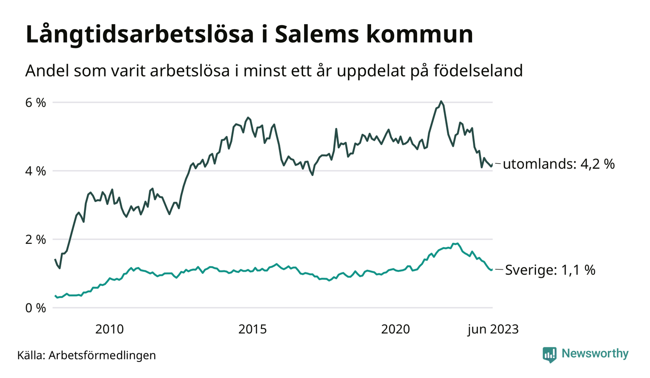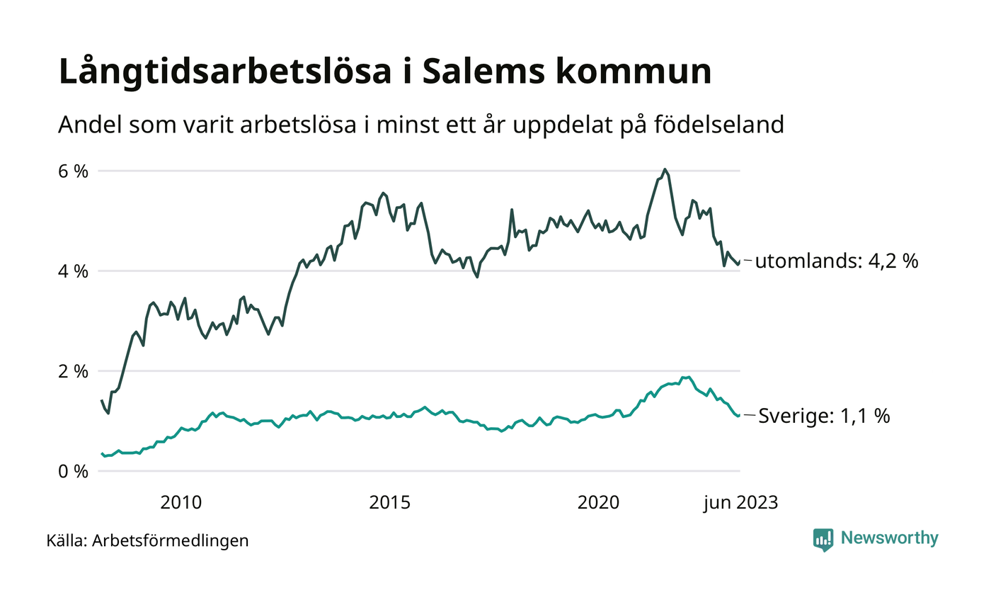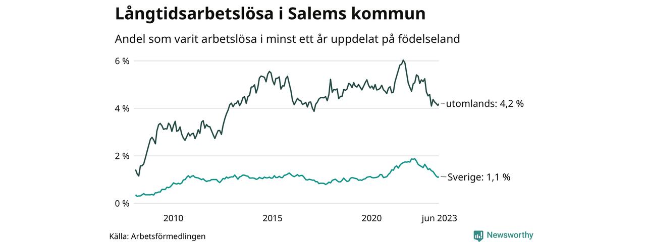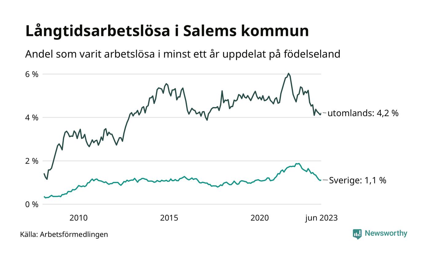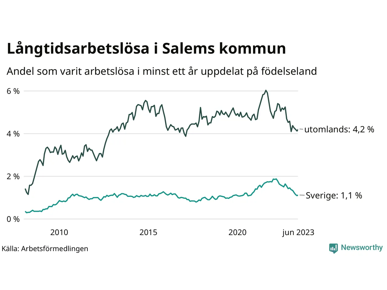 68 av de långtidsarbetslösa i Salem är födda i Sverige, medan 104 är födda utomlands. Det innebär att långtidsarbetslösheten bland Sverigefödda är 1,1 procent, medan den är fyra gånger så hög – 4,2 procent – bland födda utomlands. Även i riket som helhet är arbetslösheten högre bland utrikesfödda.