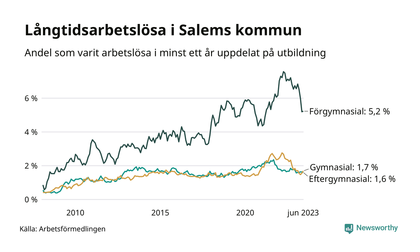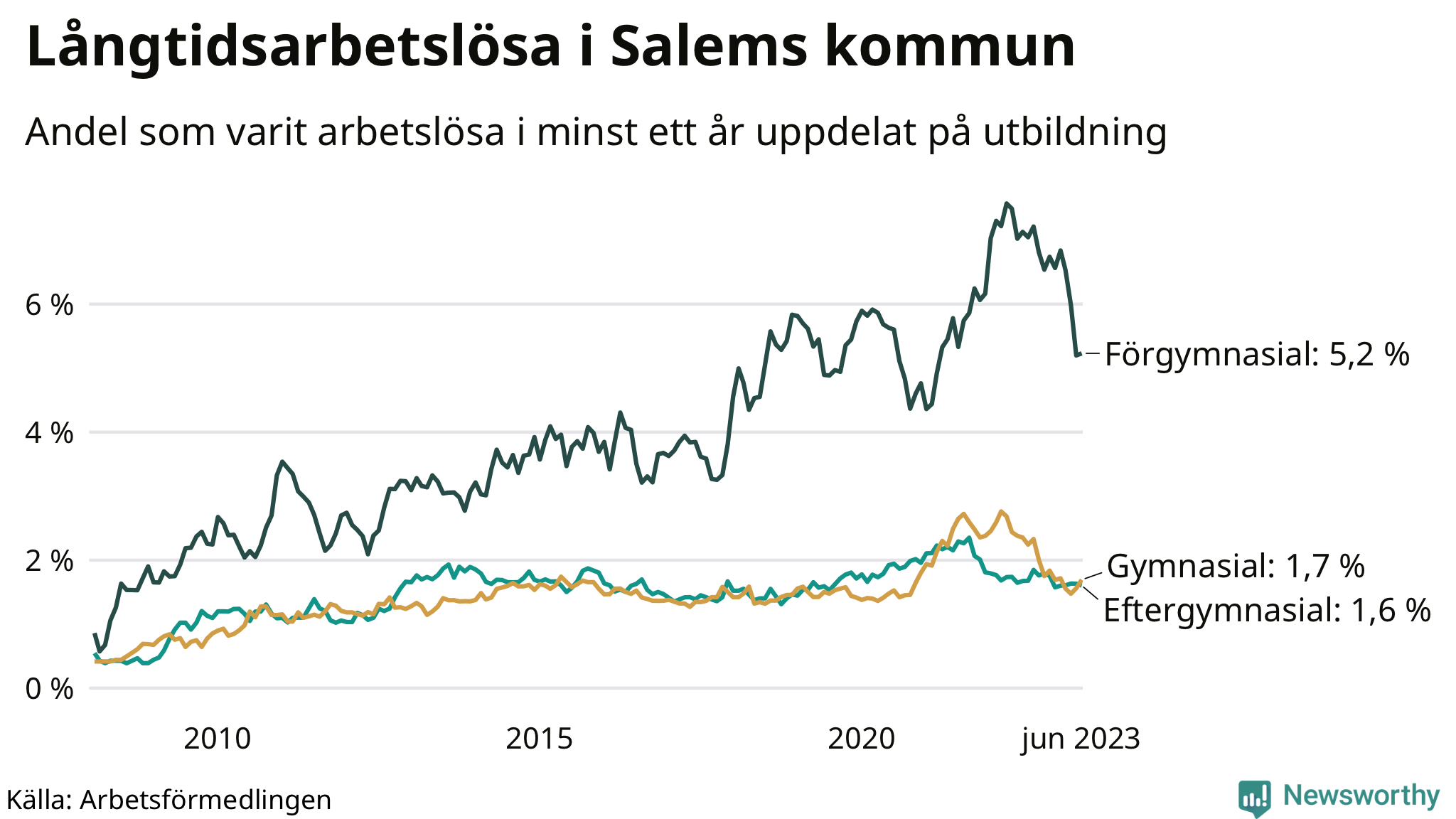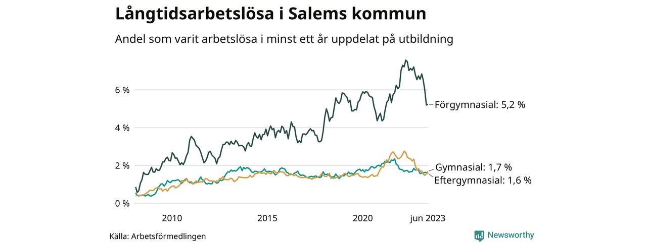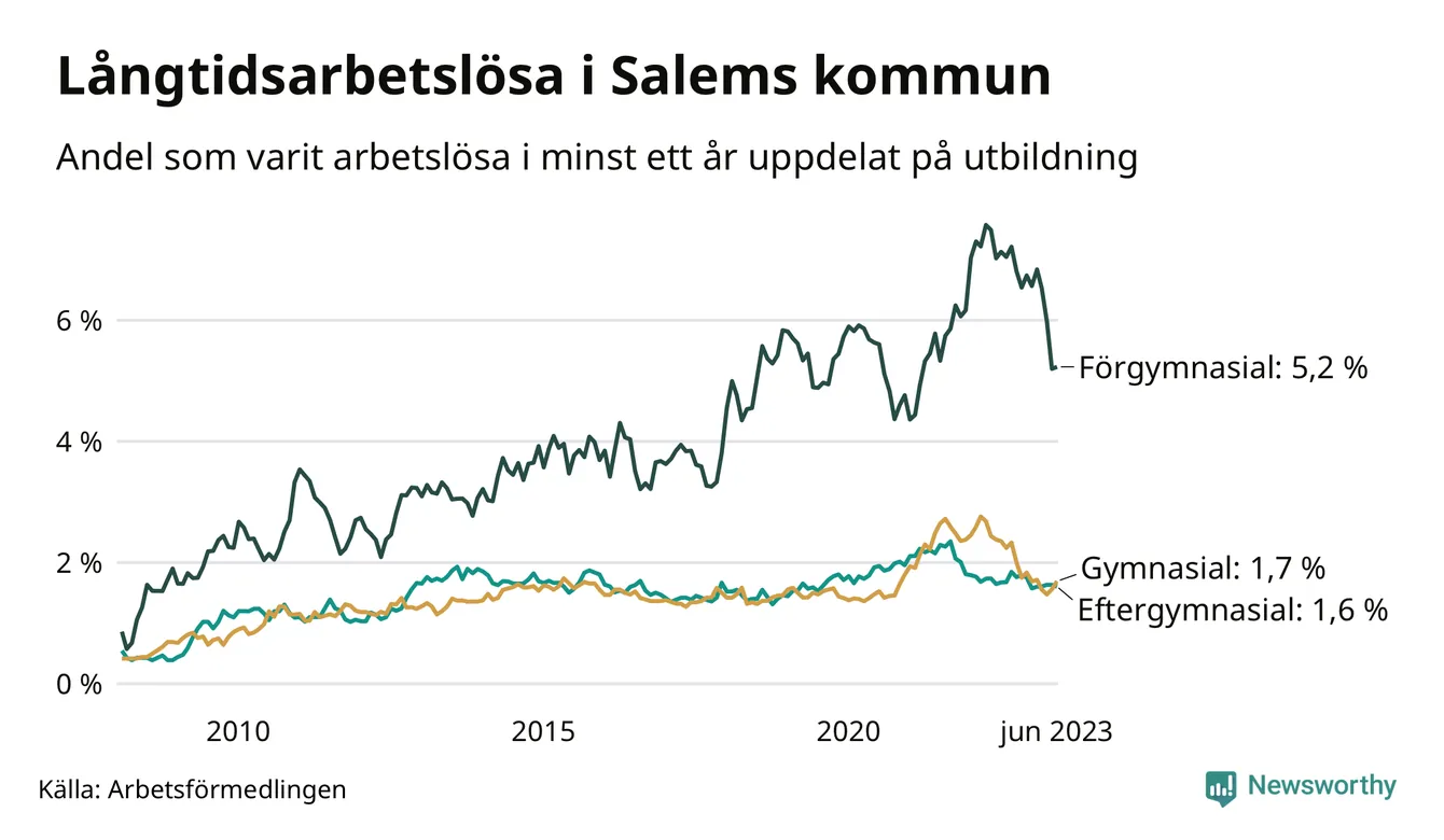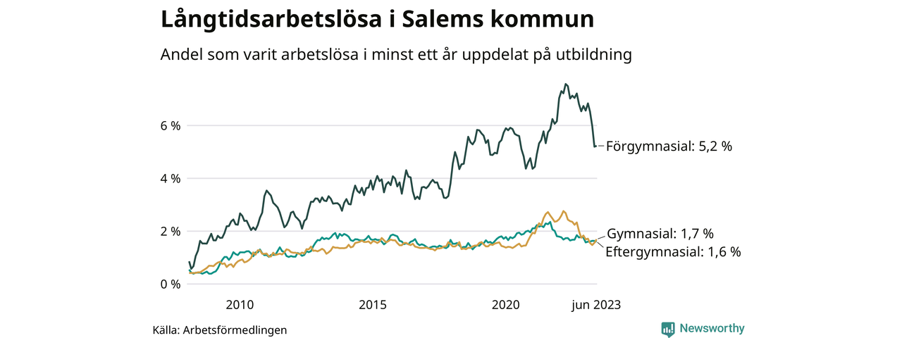 Andelen som varit utan arbete i minst ett år i Salem i juni var lägre än för ett år sedan. Men jämfört med i maj har antalet långtidsarbetslösa ökat.