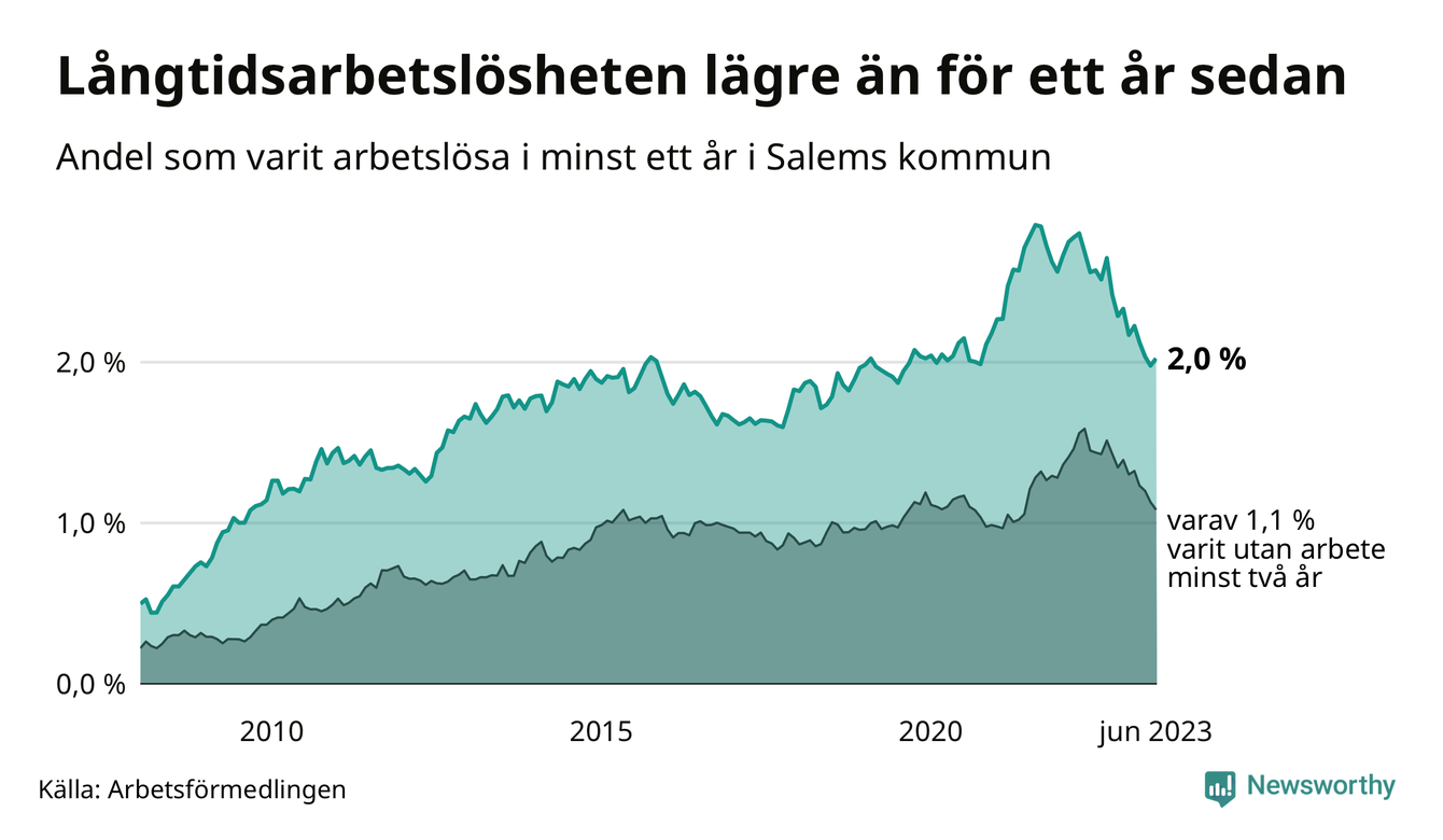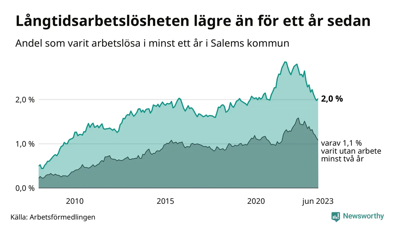 | Andel arbetslösa i minst två år | 1,1 % | 1,5 % | 1,6 % |